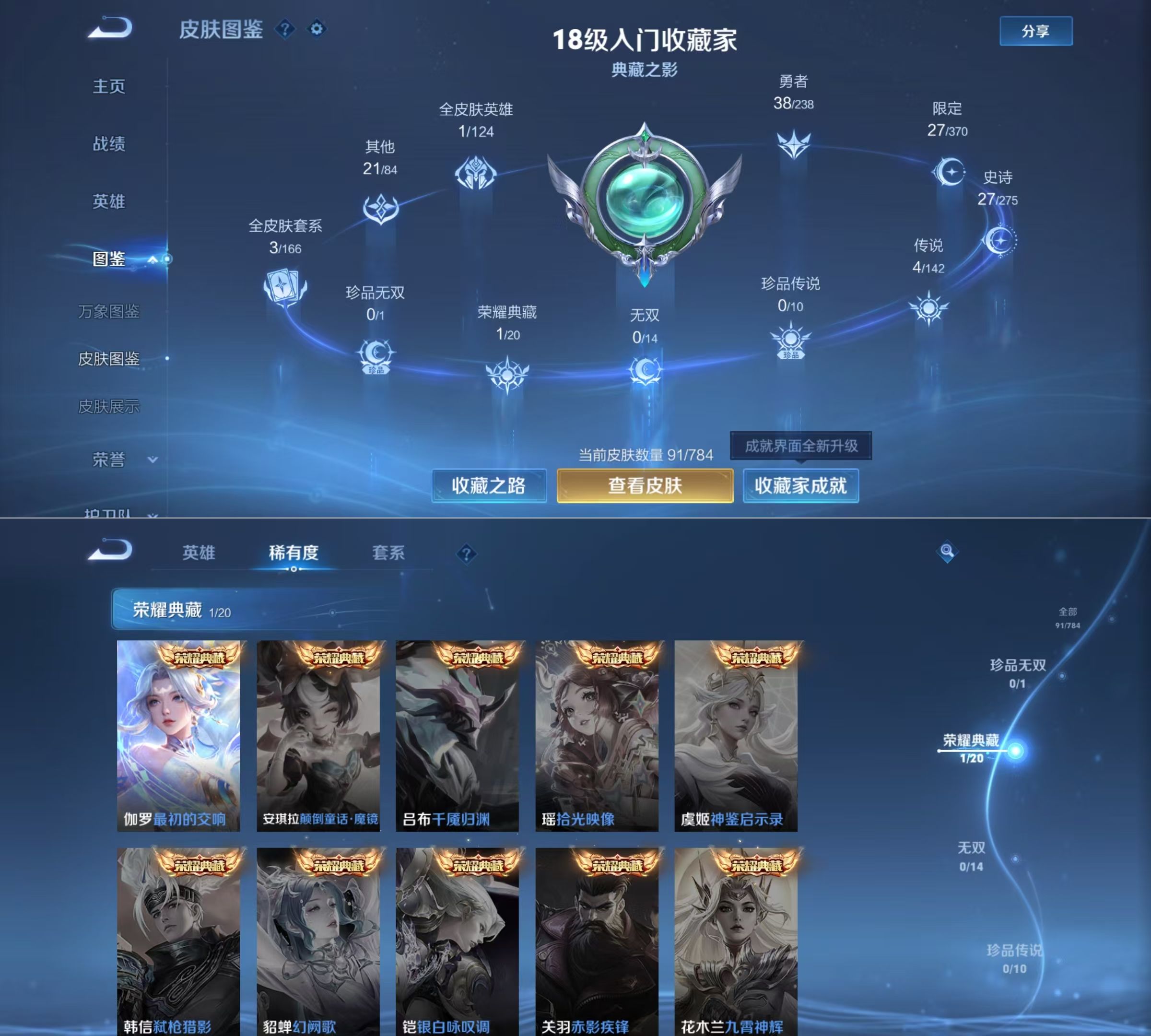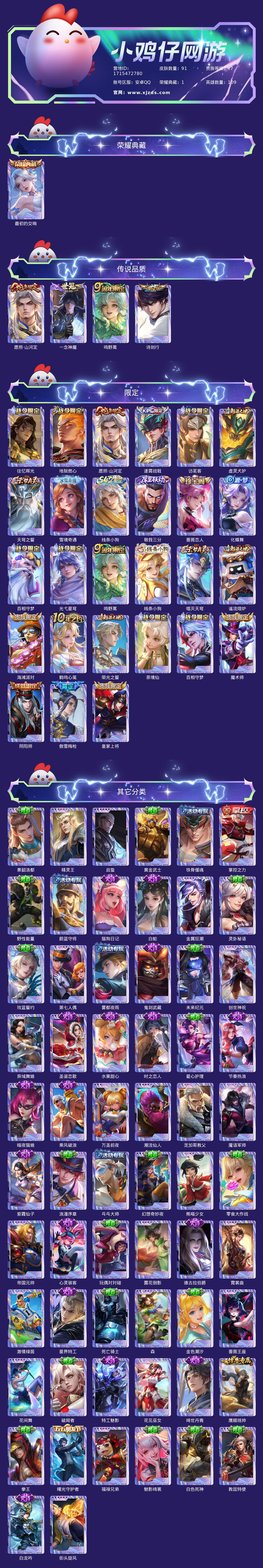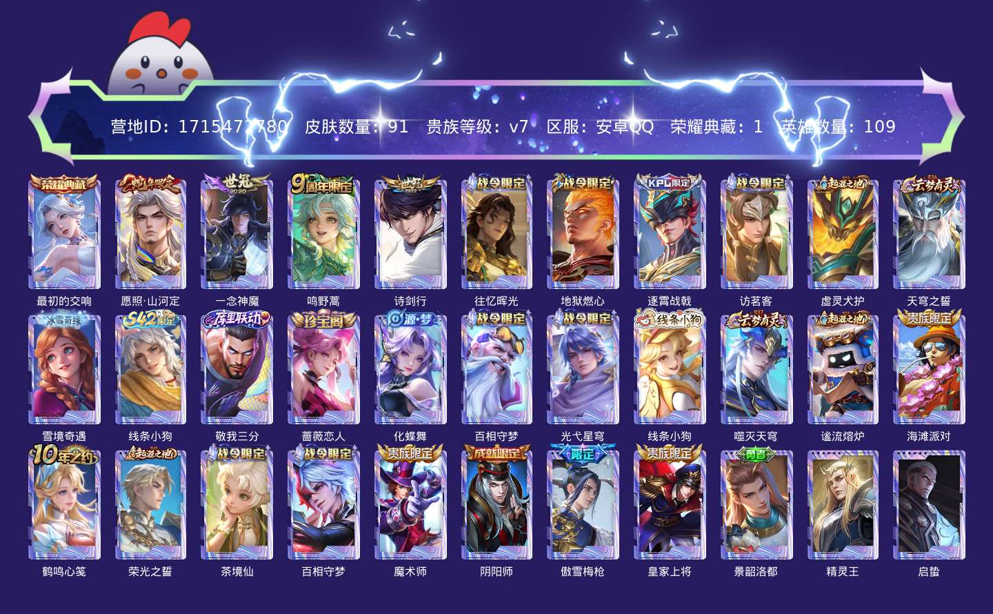 贵族等级:v7皮肤数:92传说品质4 生肖限定1 荣耀典藏1 英雄数:109