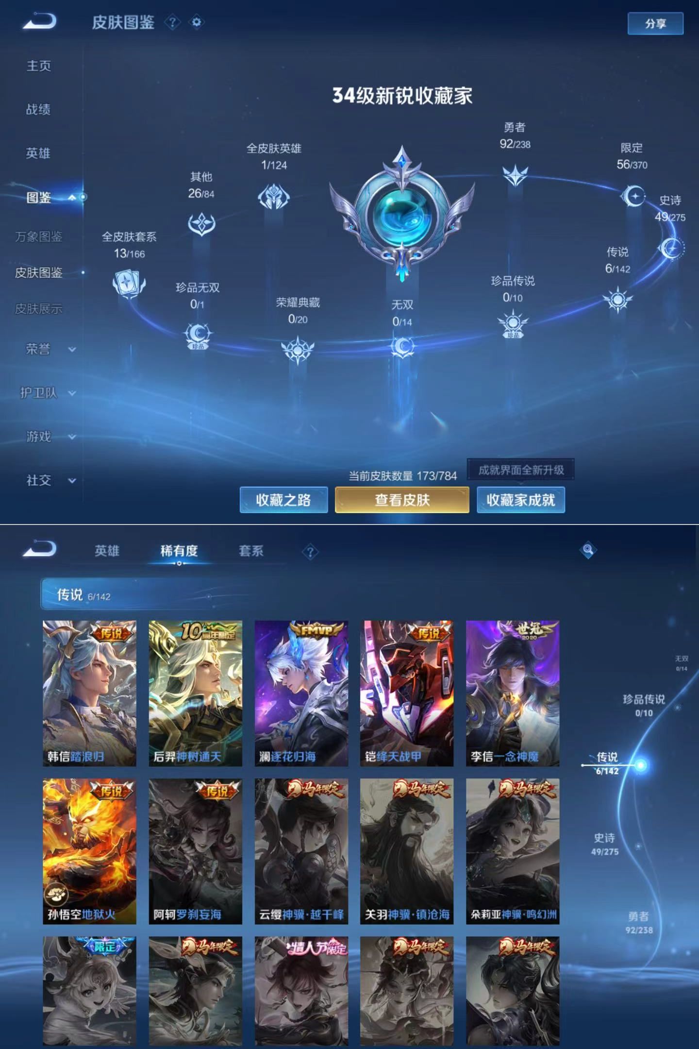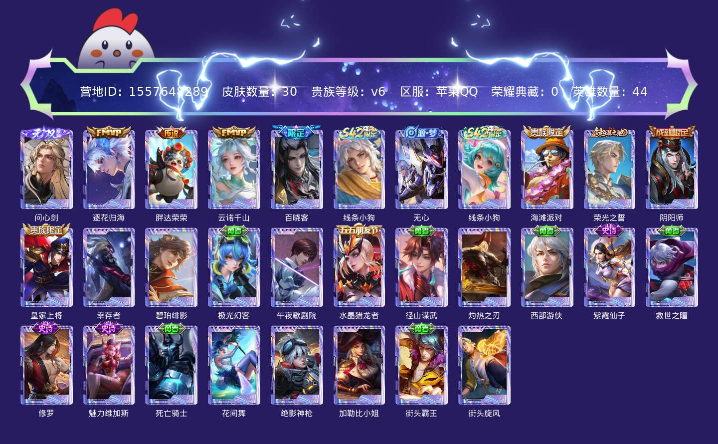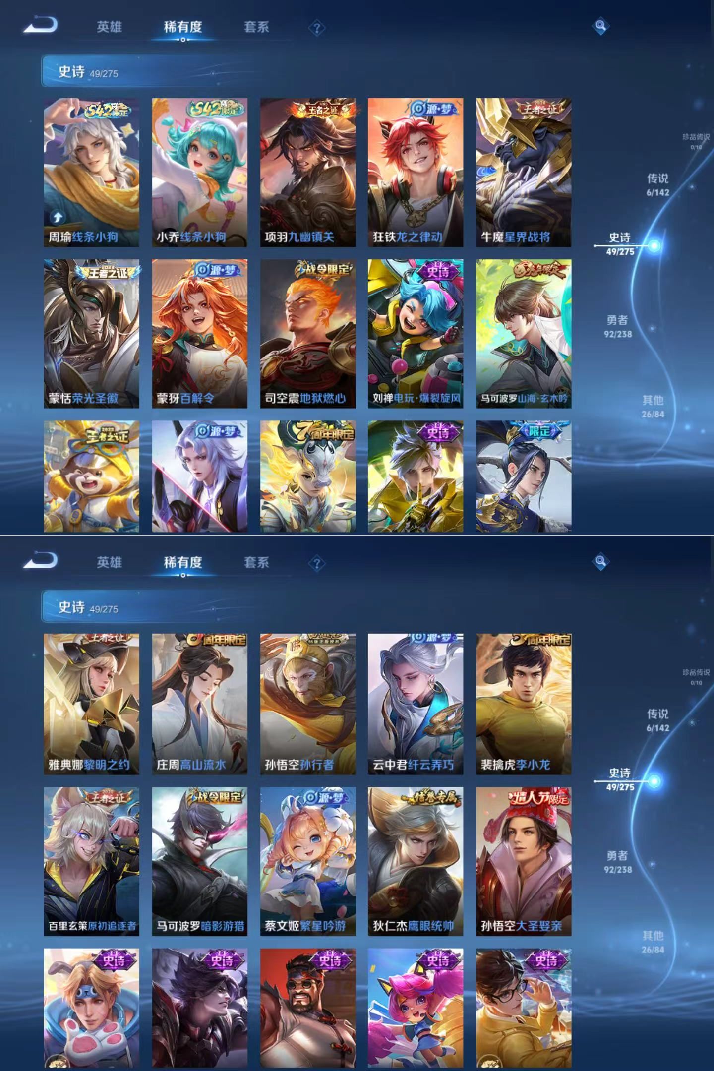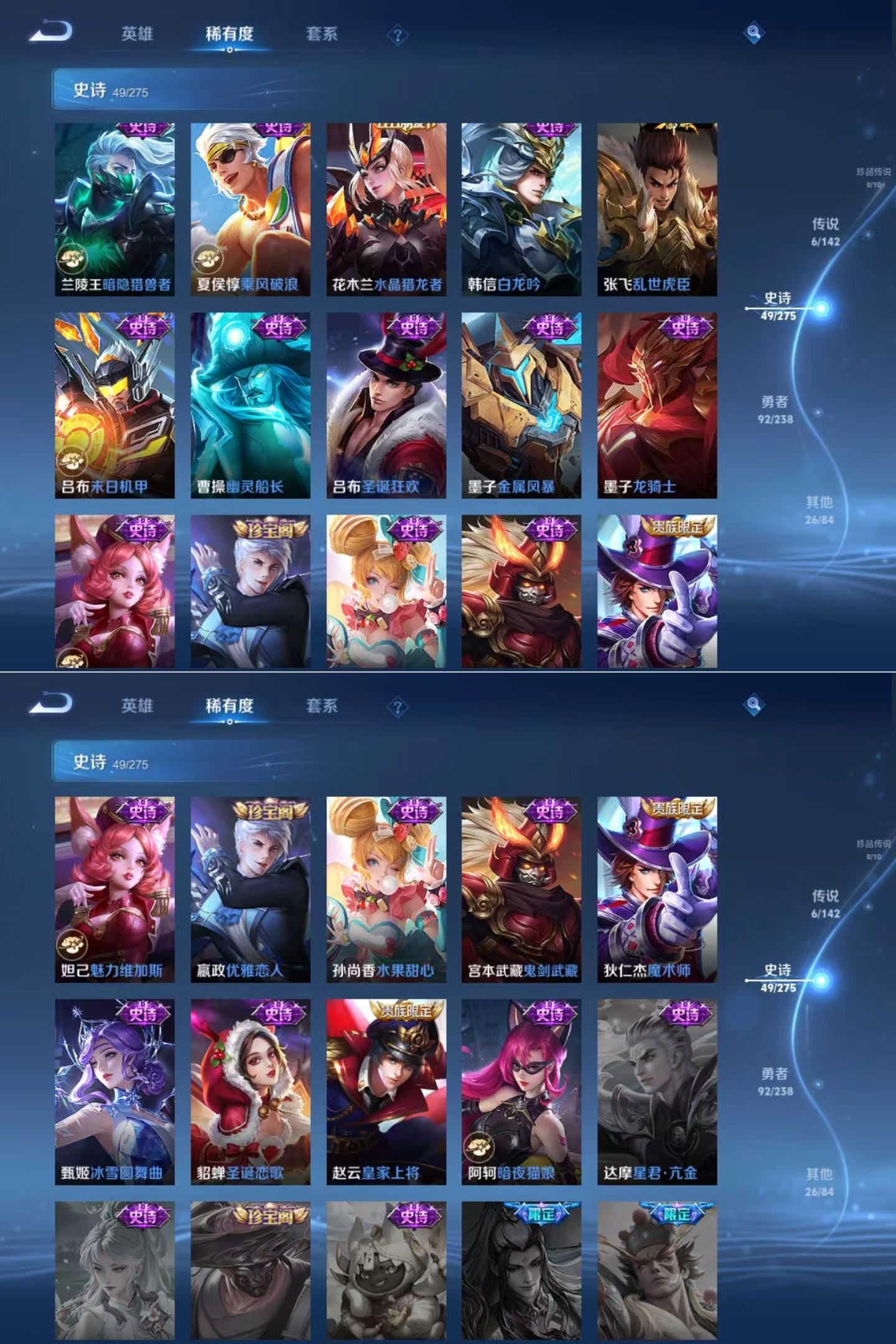 贵族等级:v6皮肤数:30传说品质3 无双1 英雄数:44