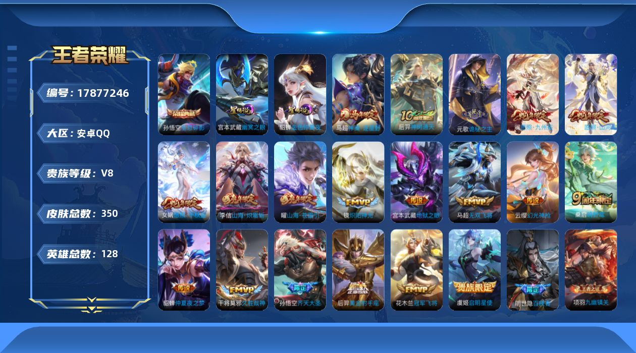 贵族等级:v8皮肤数:350传说品质19 生肖限定8 情人节限定3 荣耀典藏1 英雄数:128