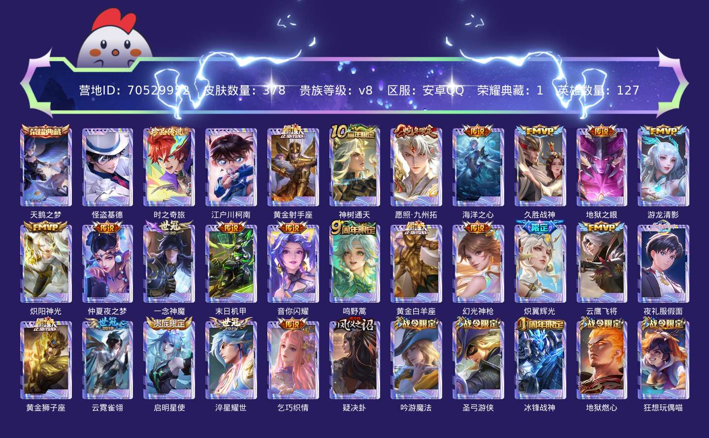 贵族等级:v8皮肤数:378传说品质23 生肖限定3 情人节限定1 荣耀典藏1 珍品传说3 英雄数:127