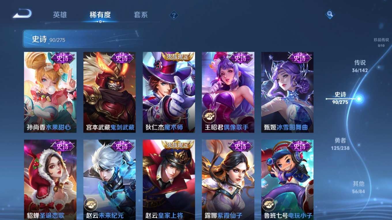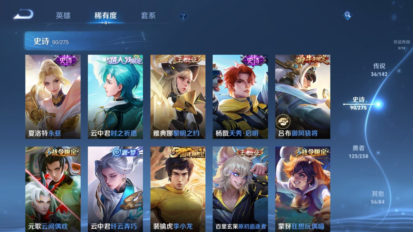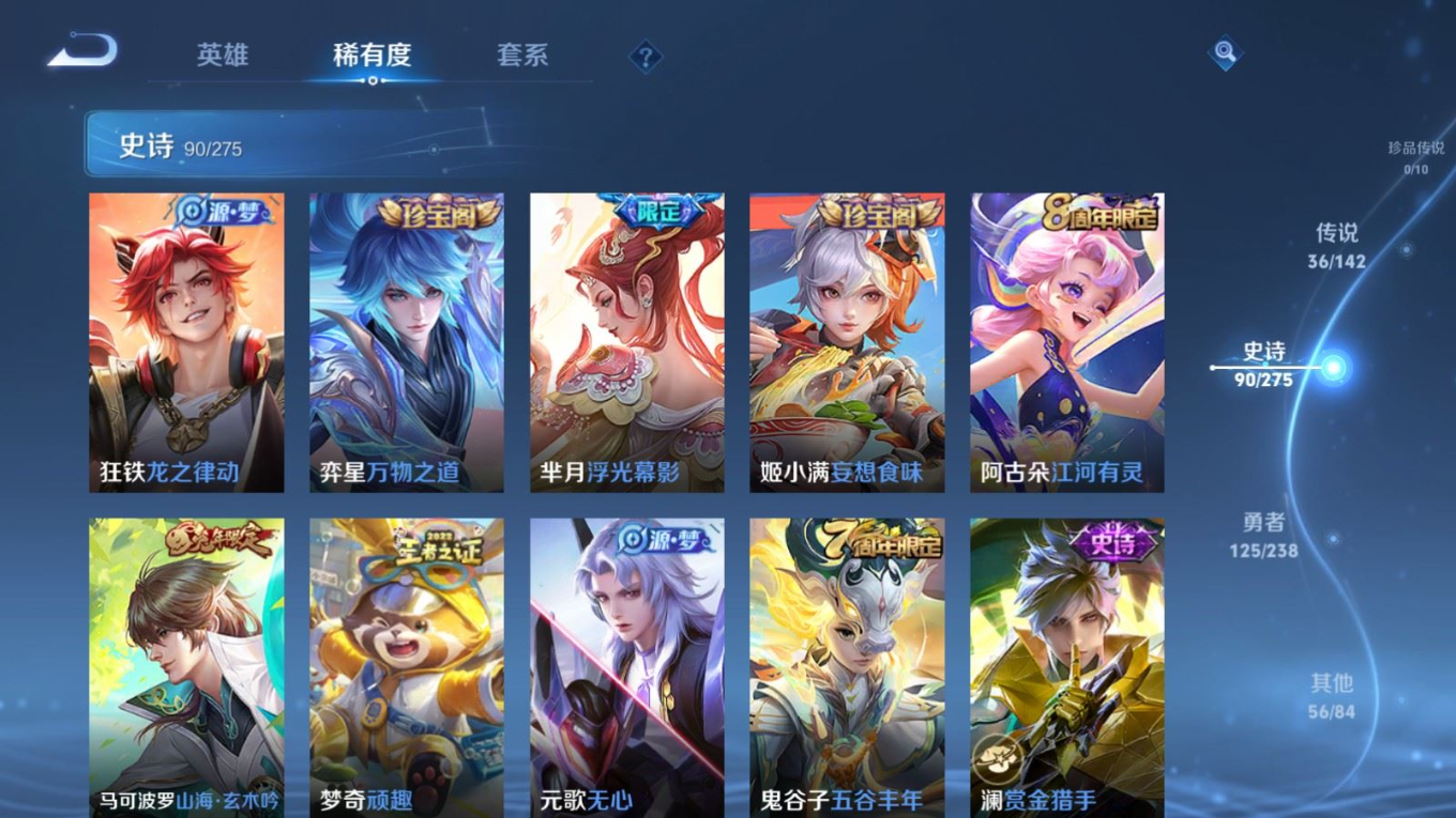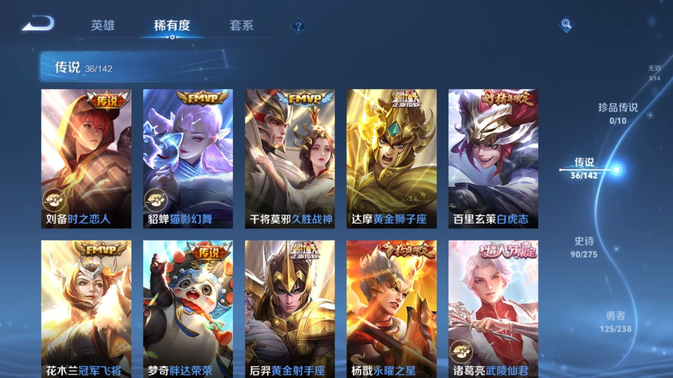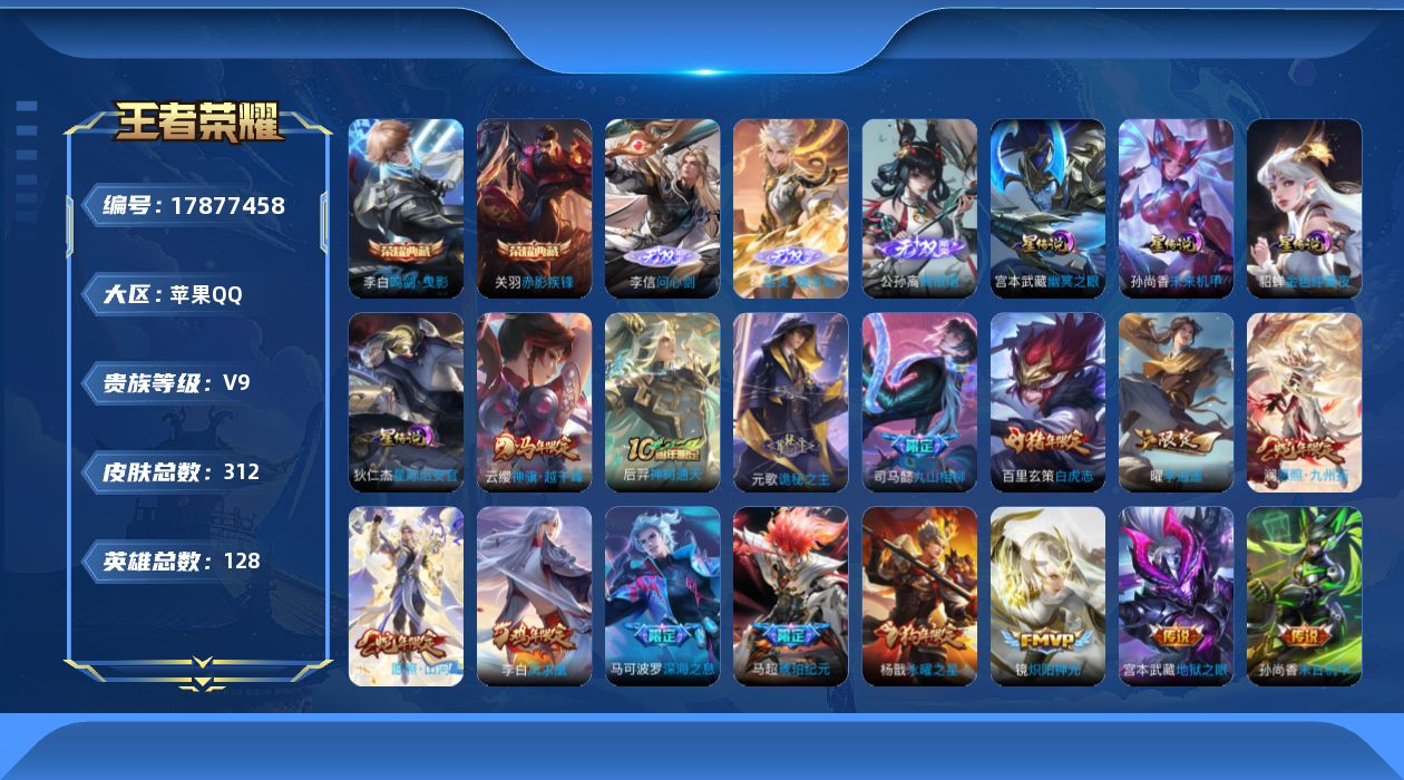 贵族等级:v9皮肤数:312生肖限定13 传说品质36 情人节限定5 荣耀典藏2 无双3 英雄数:128