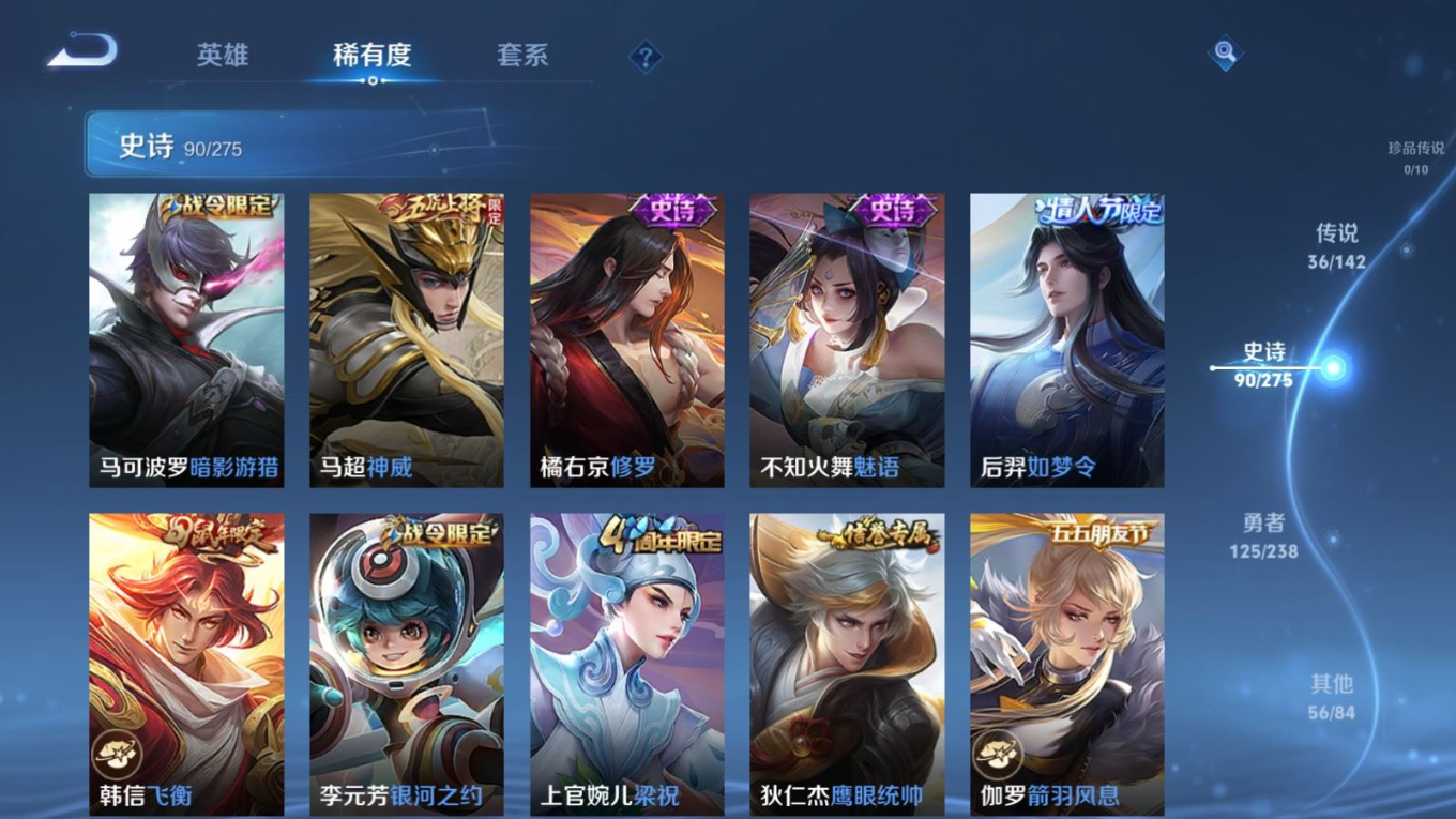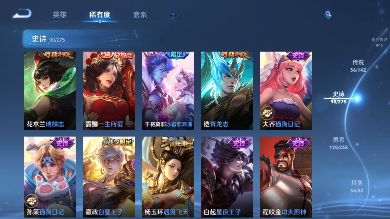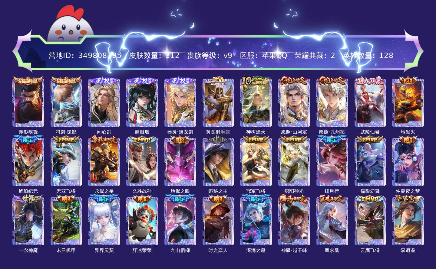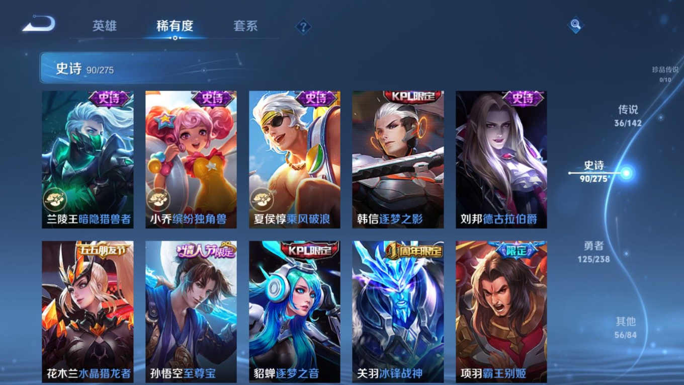贵族等级:v9皮肤数:312生肖限定13 传说品质36 情人节限定5 荣耀典藏2 无双3 英雄数:128