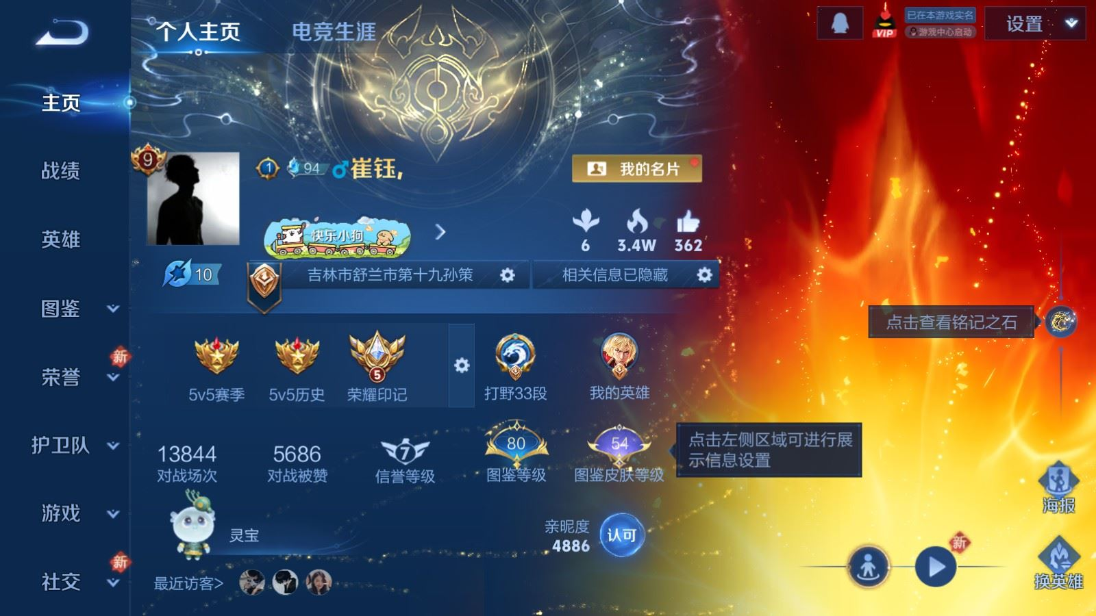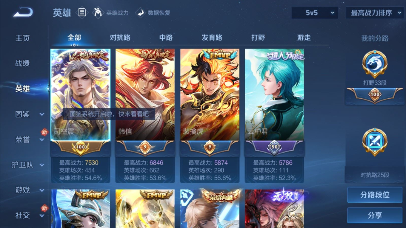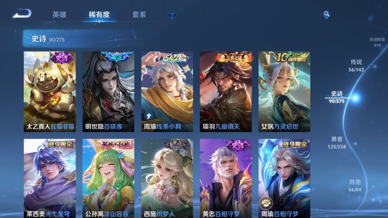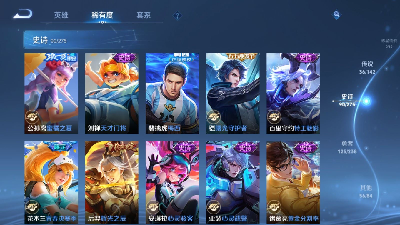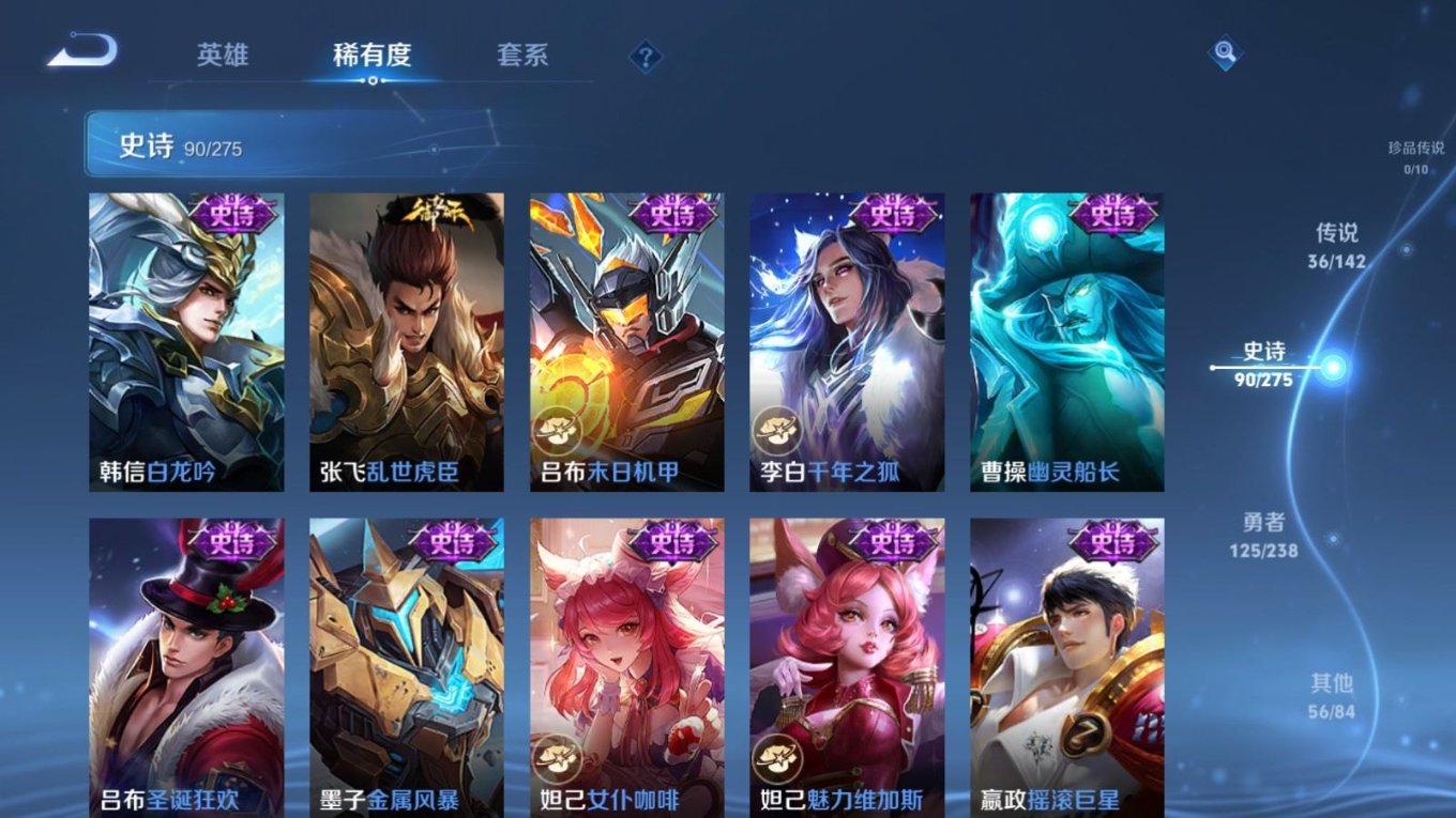 贵族等级:v9皮肤数:312生肖限定13 传说品质36 情人节限定5 荣耀典藏2 无双3 英雄数:128