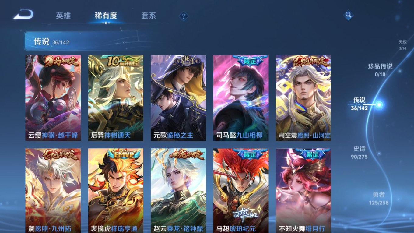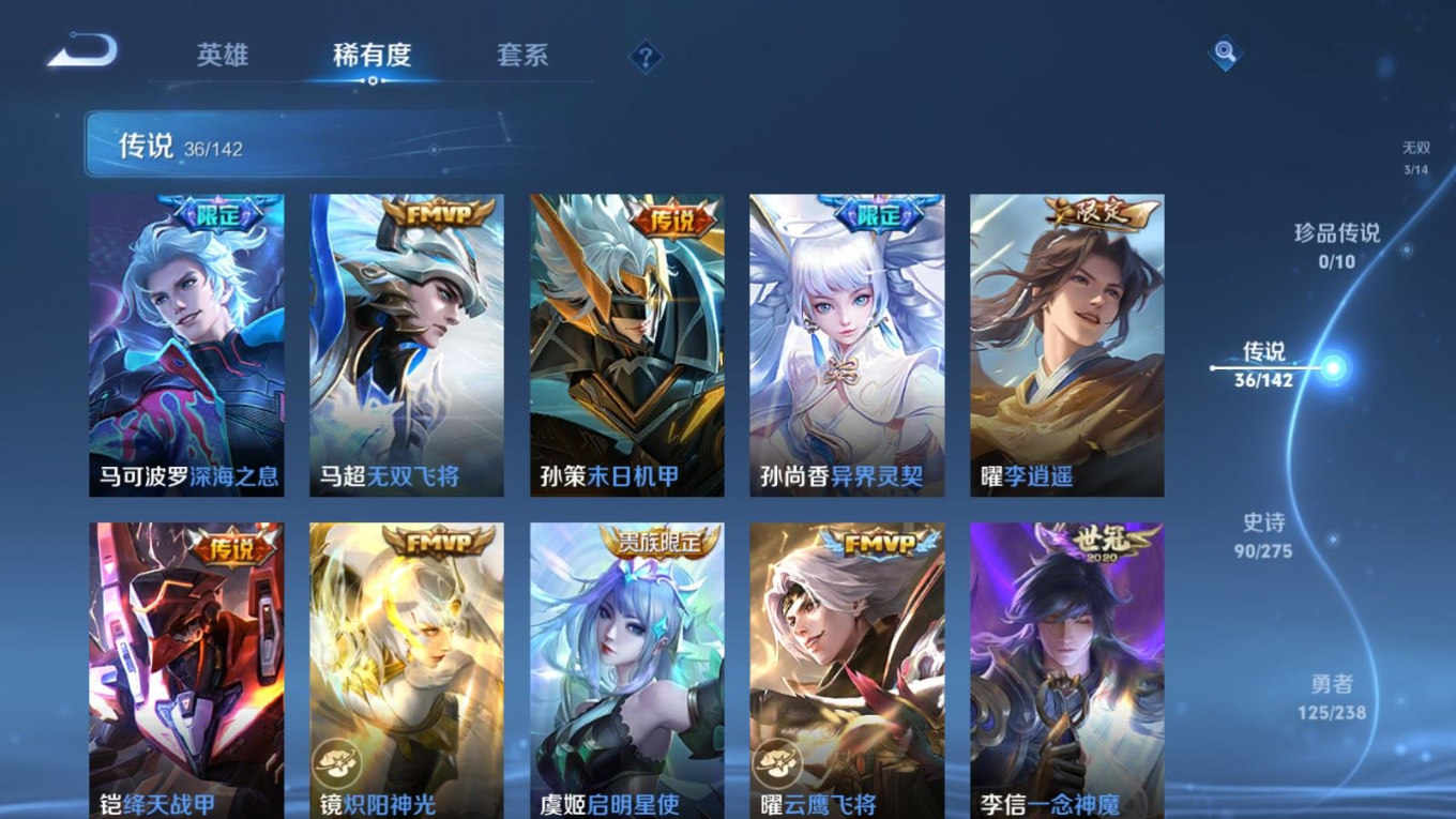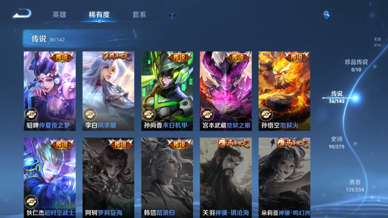 传说品质_后羿_黄金射手座传说品质_后羿_神树通天传说品质_司空震_愿照·山河定传说品质_澜_愿照·九州拓传说品质_诸葛亮_武陵仙君传说品质_孙悟空_地狱火传说品质_马超_琥珀纪元传说品质_马超_无双飞将传说品质_杨戬_永曜之星传说品质_干将莫邪_久胜战神传说品质_宫本武藏_地狱之眼传说品质_元歌_诡秘之主传说品质_花木兰_冠军飞将传说品质_镜_炽阳神光传说品质_不知火舞_绯月行传说品质_貂蝉_猫影幻舞传说品质_貂蝉_仲夏夜之梦传说品质_李信_一念神魔传说品质_孙尚香_末日机甲传说品质_孙尚香_异界灵契传说品质_梦奇_胖达荣荣传说品质_司马懿_九山相柳传说品质_刘备_时之恋人传说品质_马可波罗_深海之息传说品质_云缨_神骥·越千峰传说品质_李白_凤求凰传说品质_曜_云鹰飞将传说品质_曜_李逍遥 传说品质_孙策_末日机甲传说品质_狄仁杰_超时空战士传说品质_达摩_黄金狮子座传说品质_铠_绛天战甲传说品质_虞姬_启明星使传说品质_百里玄策_白虎志传说品质_赵云_乘龙·铭钟鼎传说品质_裴擒虎_祥瑞亨通
