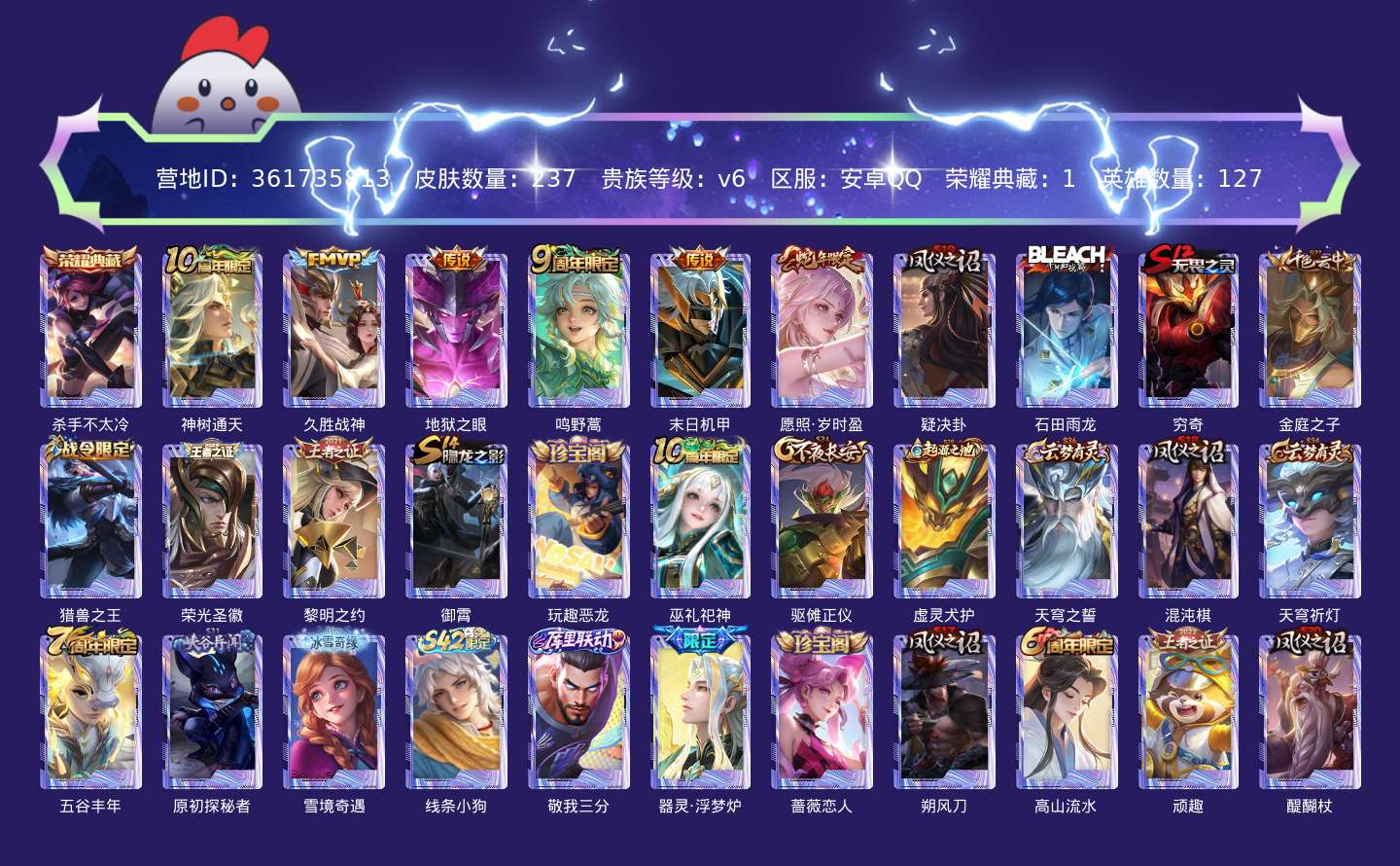 贵族等级:v6皮肤数:237传说品质6 荣耀典藏1 生肖限定1 英雄数:127
