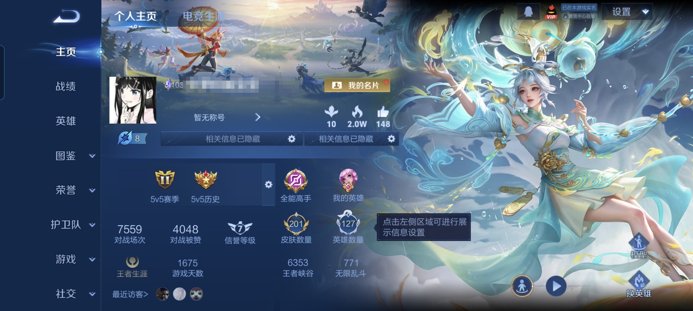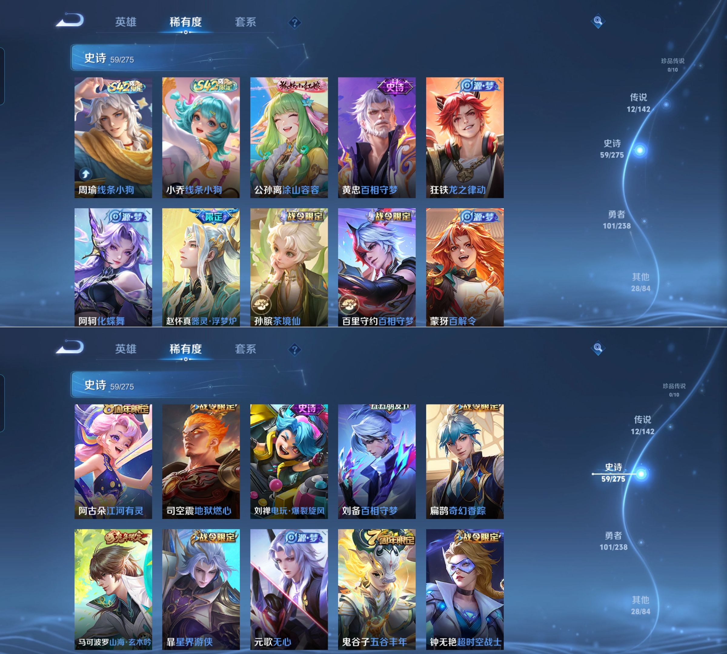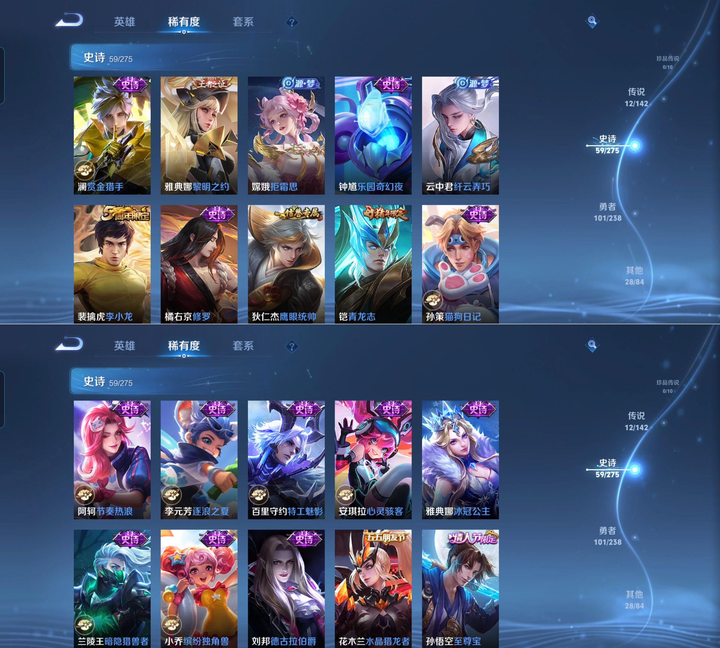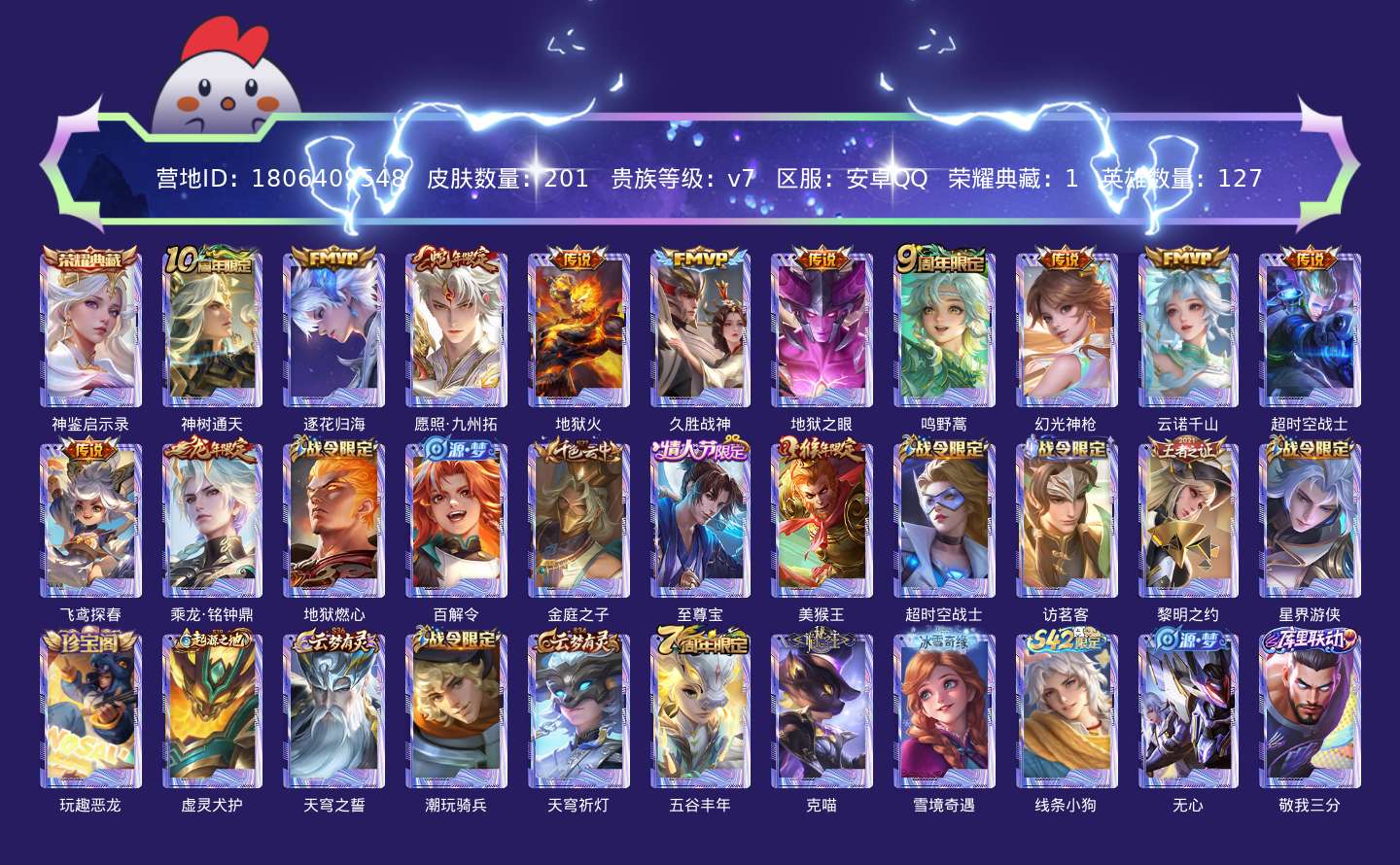 贵族等级:v7皮肤数:201传说品质12 生肖限定5 情人节限定1 荣耀典藏1 英雄数:127