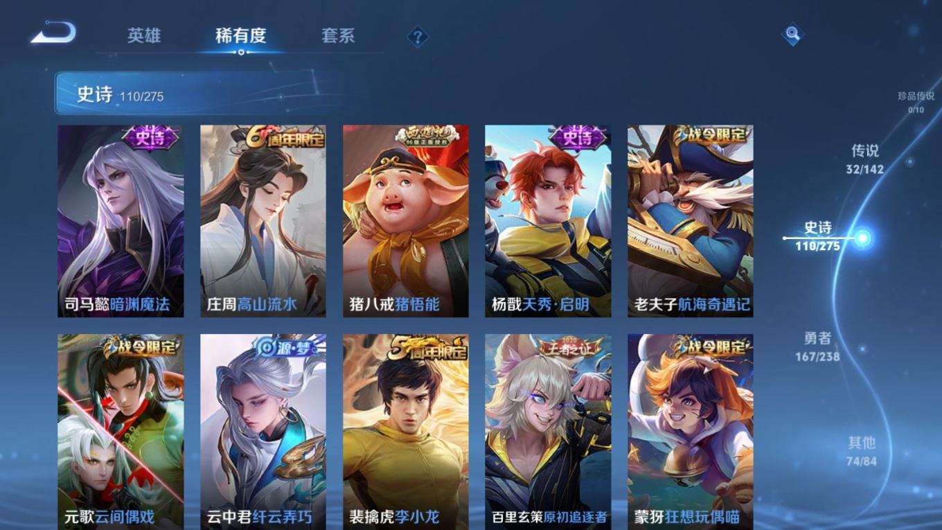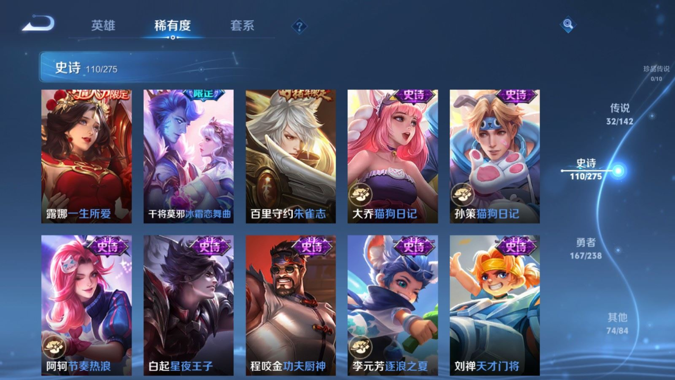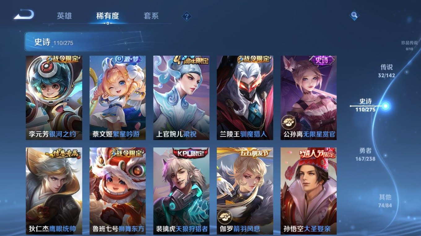 传说品质_司空震_愿照·山河定传说品质_澜_逐花归海传说品质_诸葛亮_武陵仙君传说品质_诸葛亮_时雨天司传说品质_孙悟空_零号·赤焰传说品质_马超_琥珀纪元传说品质_马超_无双飞将传说品质_马超_神骥·逐星野传说品质_杨戬_永曜之星传说品质_干将莫邪_千山共赴传说品质_干将莫邪_久胜战神传说品质_宫本武藏_地狱之眼传说品质_花木兰_冠军飞将传说品质_镜_炽阳神光传说品质_李信_一念神魔传说品质_孙尚香_末日机甲传说品质_夏侯惇_霜北刀传说品质_桑启_鸣野蒿传说品质_刘备_时之恋人传说品质_张良_黄金白羊座传说品质_马可波罗_深海之息传说品质_李白_凤求凰传说品质_公孙离_祈雪灵祝传说品质_亚连_落雪白狼传说品质_曜_云鹰飞将传说品质_曜_山海·苍雷引传说品质_达摩_黄金狮子座传说品质_虞姬_愿照·岁时盈传说品质_虞姬_启明星使传说品质_百里玄策_白虎志传说品质_裴擒虎_寅虎·赤拳传说品质_裴擒虎_祥瑞亨通