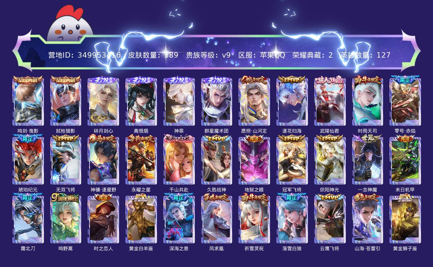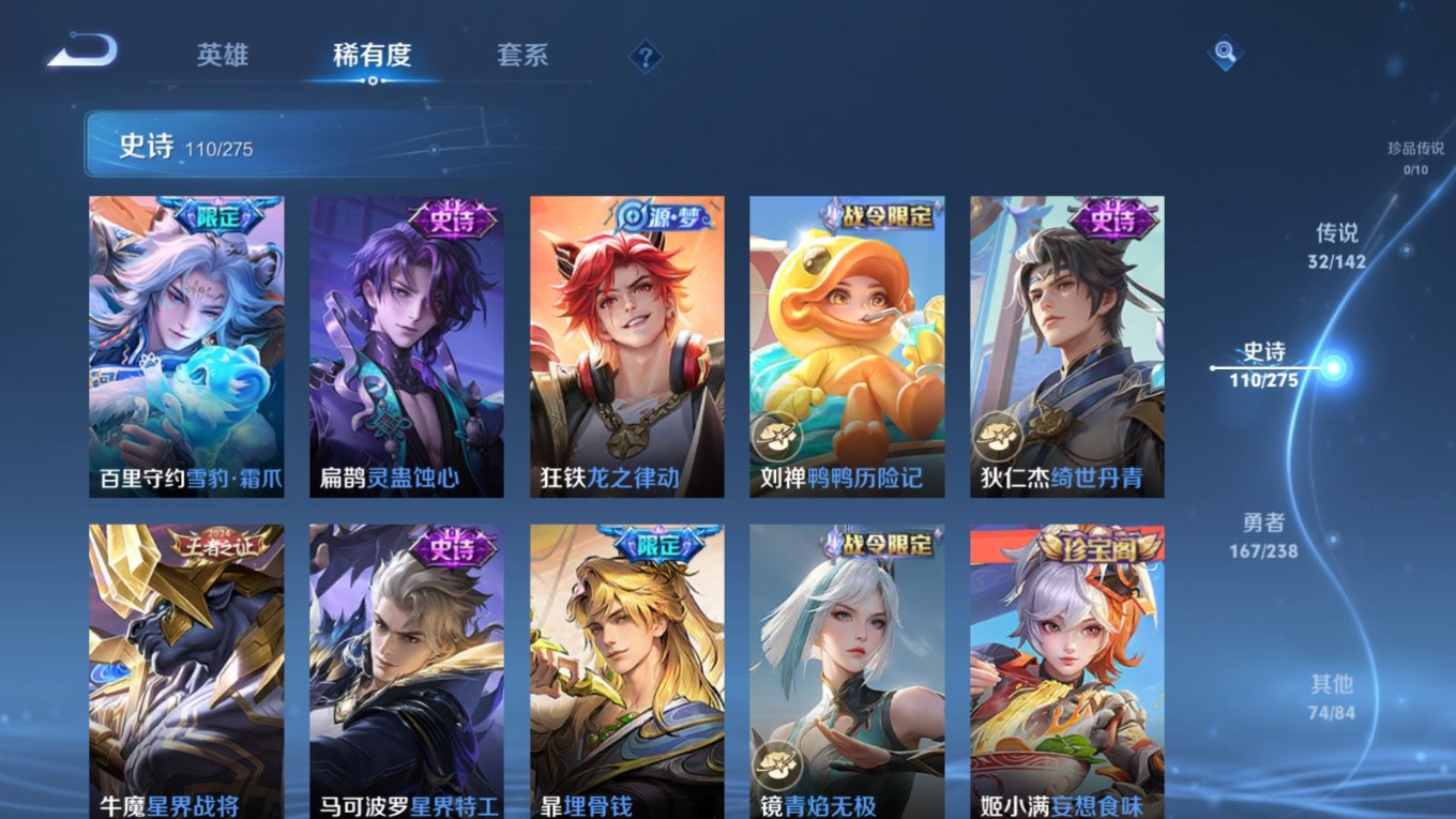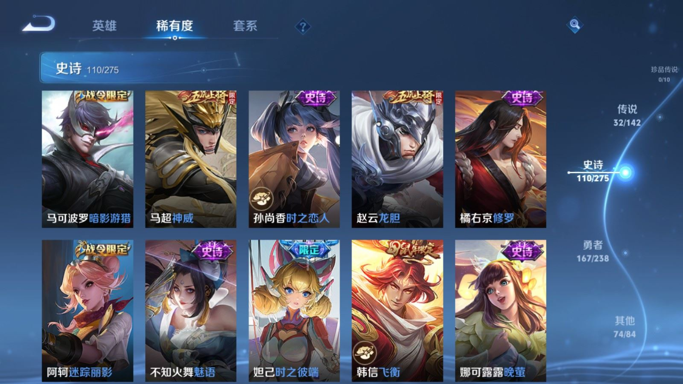 传说品质_司空震_愿照·山河定传说品质_澜_逐花归海传说品质_诸葛亮_武陵仙君传说品质_诸葛亮_时雨天司传说品质_孙悟空_零号·赤焰传说品质_马超_琥珀纪元传说品质_马超_无双飞将传说品质_马超_神骥·逐星野传说品质_杨戬_永曜之星传说品质_干将莫邪_千山共赴传说品质_干将莫邪_久胜战神传说品质_宫本武藏_地狱之眼传说品质_花木兰_冠军飞将传说品质_镜_炽阳神光传说品质_李信_一念神魔传说品质_孙尚香_末日机甲传说品质_夏侯惇_霜北刀传说品质_桑启_鸣野蒿传说品质_刘备_时之恋人传说品质_张良_黄金白羊座传说品质_马可波罗_深海之息传说品质_李白_凤求凰传说品质_公孙离_祈雪灵祝传说品质_亚连_落雪白狼传说品质_曜_云鹰飞将传说品质_曜_山海·苍雷引传说品质_达摩_黄金狮子座传说品质_虞姬_愿照·岁时盈传说品质_虞姬_启明星使传说品质_百里玄策_白虎志传说品质_裴擒虎_寅虎·赤拳传说品质_裴擒虎_祥瑞亨通