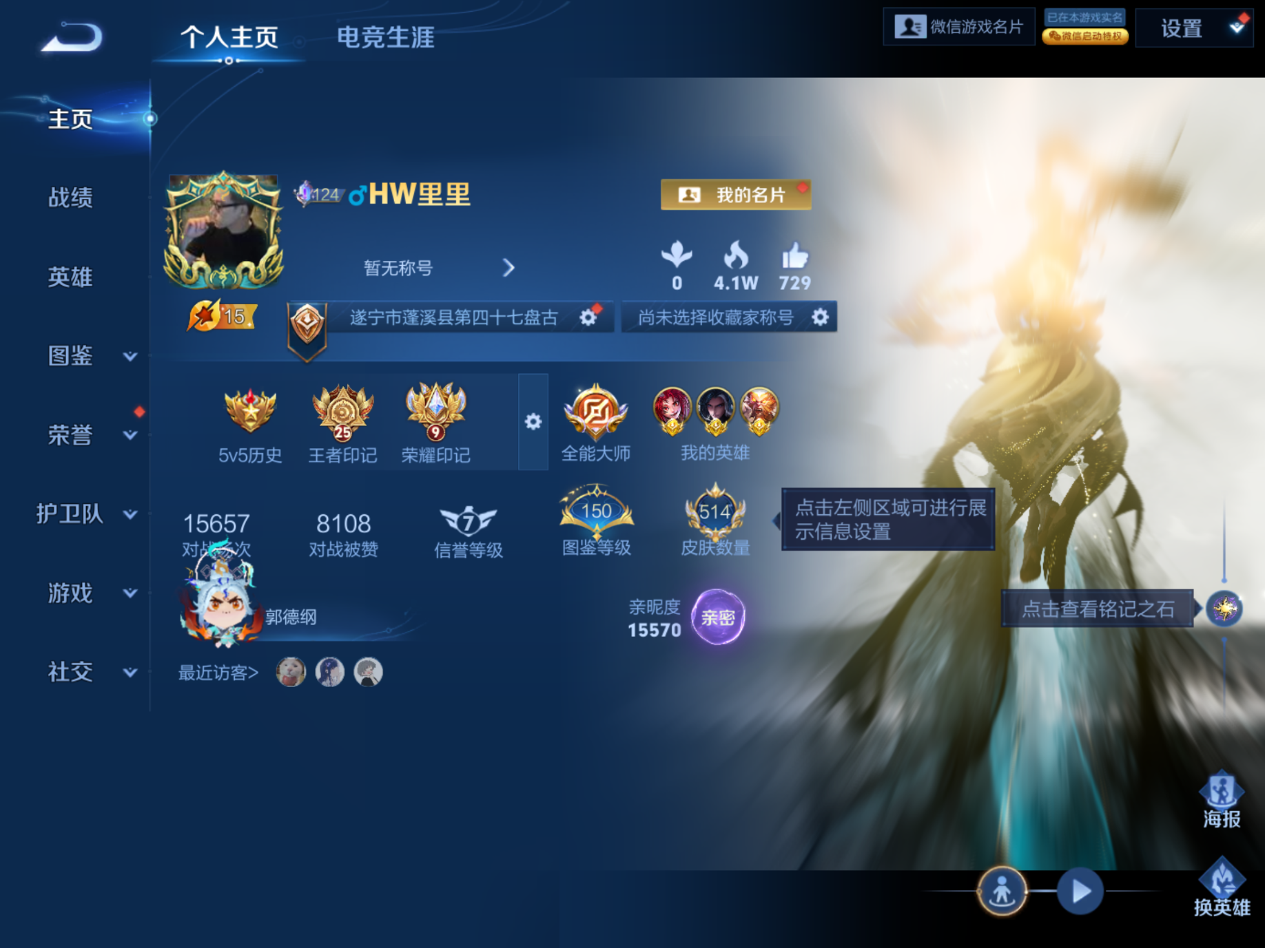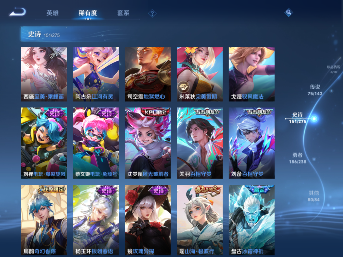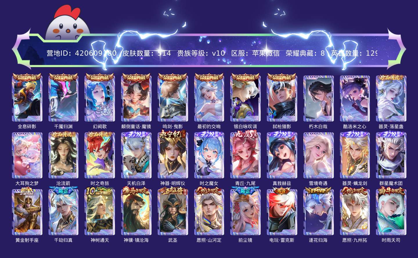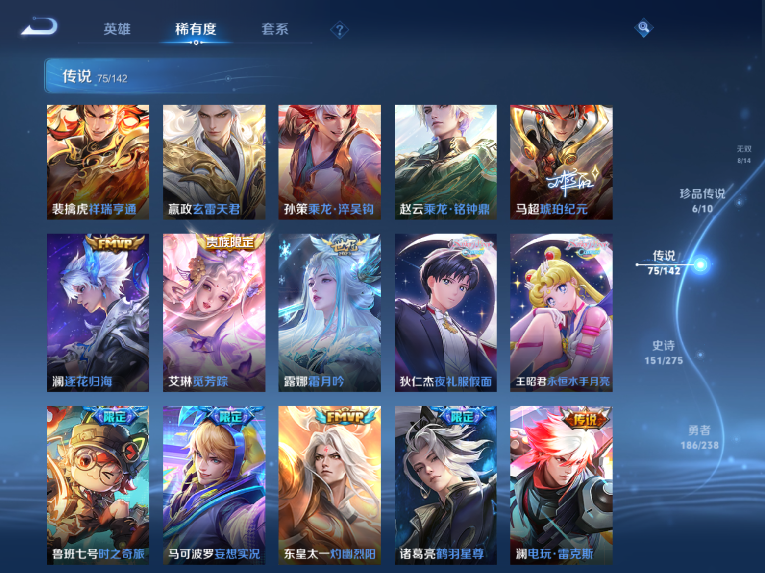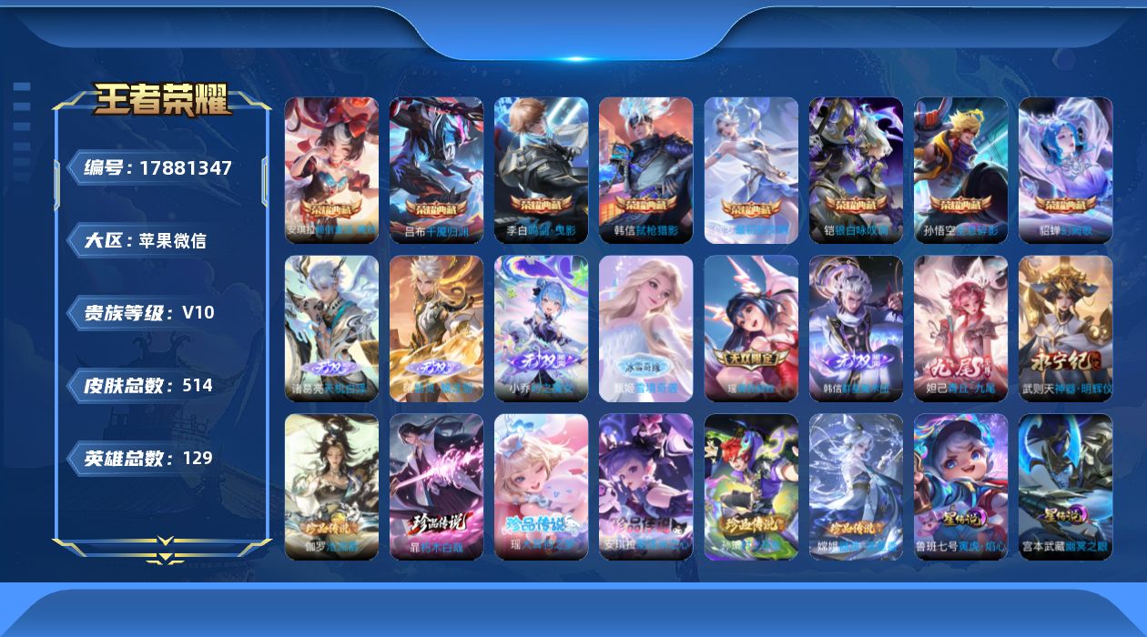 贵族等级:v10皮肤数:514生肖限定27 传说品质75 无双8 荣耀典藏8 珍品传说6 情人节限定3 英雄数:129