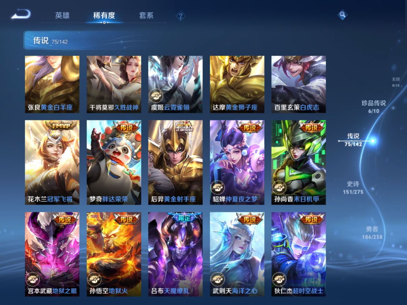传说品质_后羿_黄金射手座传说品质_后羿_千劫归真传说品质_后羿_神树通天传说品质_关羽_神骥·镇沧海传说品质_关羽_武圣传说品质_司空震_愿照·山河定传说品质_娜可露露_前尘镜传说品质_澜_电玩·雷克斯传说品质_澜_逐花归海传说品质_澜_愿照·九州拓传说品质_诸葛亮_时雨天司传说品质_诸葛亮_鹤羽星尊传说品质_孙悟空_齐天大圣传说品质_孙悟空_地狱火传说品质_吕布_天魔缭乱传说品质_马超_琥珀纪元传说品质_武则天_海洋之心传说品质_干将莫邪_画中仙传说品质_干将莫邪_久胜战神传说品质_宫本武藏_地狱之眼传说品质_西施_续相思传说品质_周瑜_音你心动传说品质_花木兰_冠军飞将传说品质_花木兰_燃星之曲传说品质_镜_炽阳神光传说品质_貂蝉_猫影幻舞传说品质_貂蝉_仲夏夜之梦传说品质_李信_一念神魔传说品质_李信_山海·炽霜斩传说品质_孙尚香_末日机甲传说品质_小乔_山海·琳琅生传说品质_梦奇_胖达荣荣传说品质_露娜_霜月吟传说品质_东皇太一_灼幽烈阳传说品质_刘备_时之恋人传说品质_橘右京_枫霜尽传说品质_王昭君_星穹之声传说品质_王昭君_永恒水手月亮传说品质_项羽_无限倾心传说品质_安琪拉_追逃游戏传说品质_艾琳_觅芳踪传说品质_张良_黄金白羊座传说品质_女娲_愿照·千秋盛传说品质_马可波罗_妄想实况传说品质_妲己_愿照·众生和传说品质_云缨_幻光神枪传说品质_云缨_神骥·越千峰传说品质_亚瑟_追逃游戏传说品质_朵莉亚_神骥·鸣幻洲传说品质_张飞_百相守梦传说品质_蔡文姬_愿照·福禄聚传说品质_大司命_死亡执政官传说品质_公孙离_云诺千山传说品质_伽罗_太华传说品质_伽罗_炽翼辉光传说品质_夏洛特_浮生妄传说品质_曜_云鹰飞将传说品质_曜_山海·苍雷引传说品质_孙策_乘龙·淬吴钩传说品质_狄仁杰_超时空战士传说品质_狄仁杰_夜礼服假面传说品质_达摩_黄金狮子座传说品质_铠_绛天战甲传说品质_鲁班七号_时之奇旅传说品质_虞姬_无限倾心传说品质_虞姬_云霓雀翎传说品质_虞姬_愿照·岁时盈传说品质_虞姬_启明星使传说品质_嬴政_玄雷天君传说品质_李元芳_飞鸢探春传说品质_百里玄策_白虎志传说品质_赵云_乘龙·铭钟鼎传说品质_赵云_淬星耀世传说品质_裴擒虎_祥瑞亨通传说品质_王昭君_乞巧织情