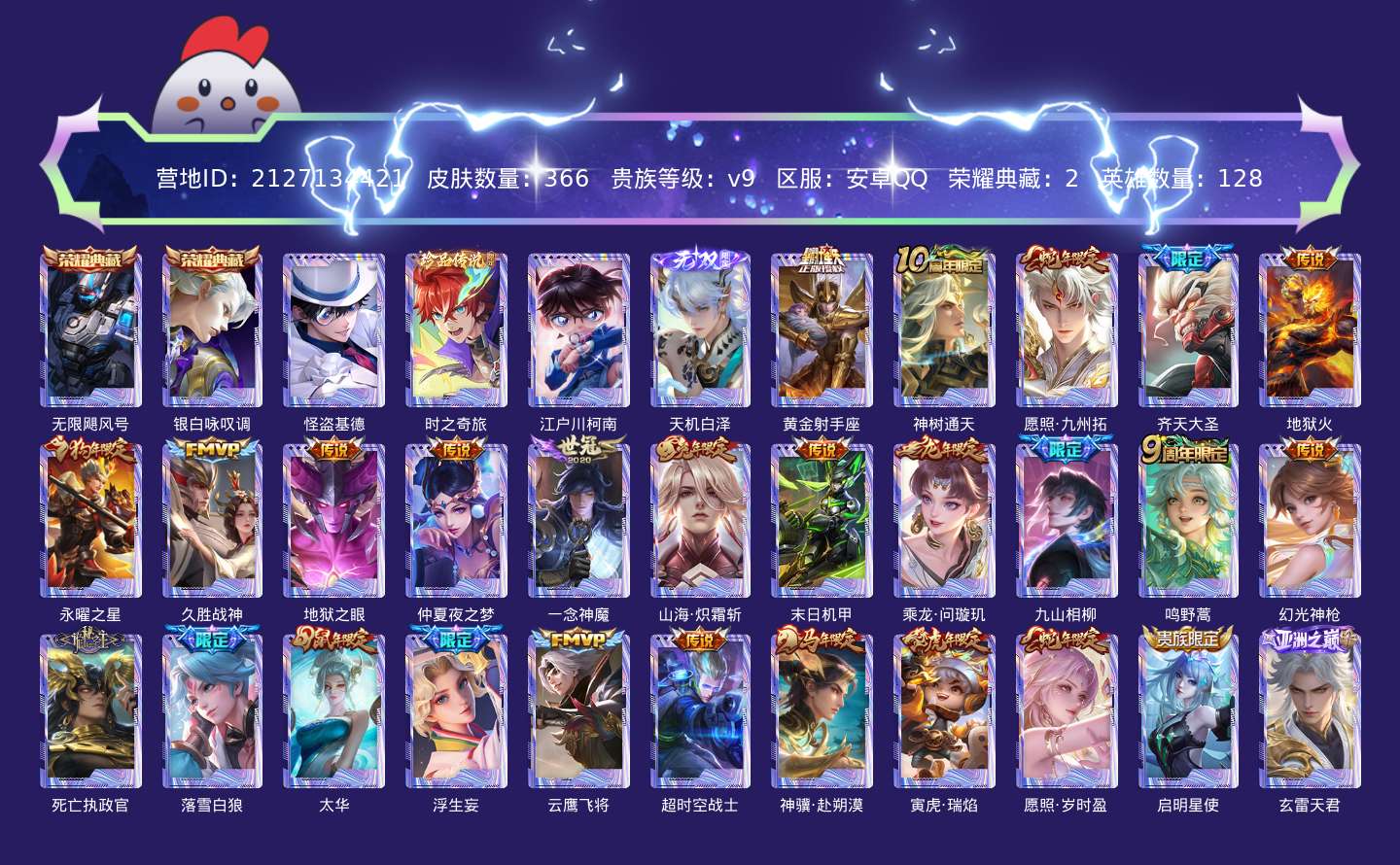 传说品质_后羿_黄金射手座传说品质_后羿_神树通天传说品质_澜_愿照·九州拓传说品质_孙悟空_齐天大圣传说品质_孙悟空_地狱火传说品质_杨戬_永曜之星传说品质_干将莫邪_久胜战神传说品质_宫本武藏_地狱之眼传说品质_貂蝉_仲夏夜之梦传说品质_李信_一念神魔传说品质_李信_山海·炽霜斩传说品质_孙尚香_末日机甲传说品质_孙尚香_乘龙·问璇玑传说品质_司马懿_九山相柳传说品质_桑启_鸣野蒿传说品质_云缨_幻光神枪传说品质_大司命_死亡执政官传说品质_亚连_落雪白狼传说品质_伽罗_太华传说品质_夏洛特_浮生妄传说品质_曜_云鹰飞将传说品质_狄仁杰_超时空战士传说品质_狄仁杰_神骥·赴朔漠传说品质_鲁班七号_寅虎·瑞焰传说品质_虞姬_愿照·岁时盈传说品质_虞姬_启明星使传说品质_嬴政_玄雷天君传说品质_赵云_淬星耀世传说品质_王昭君_乞巧织情
