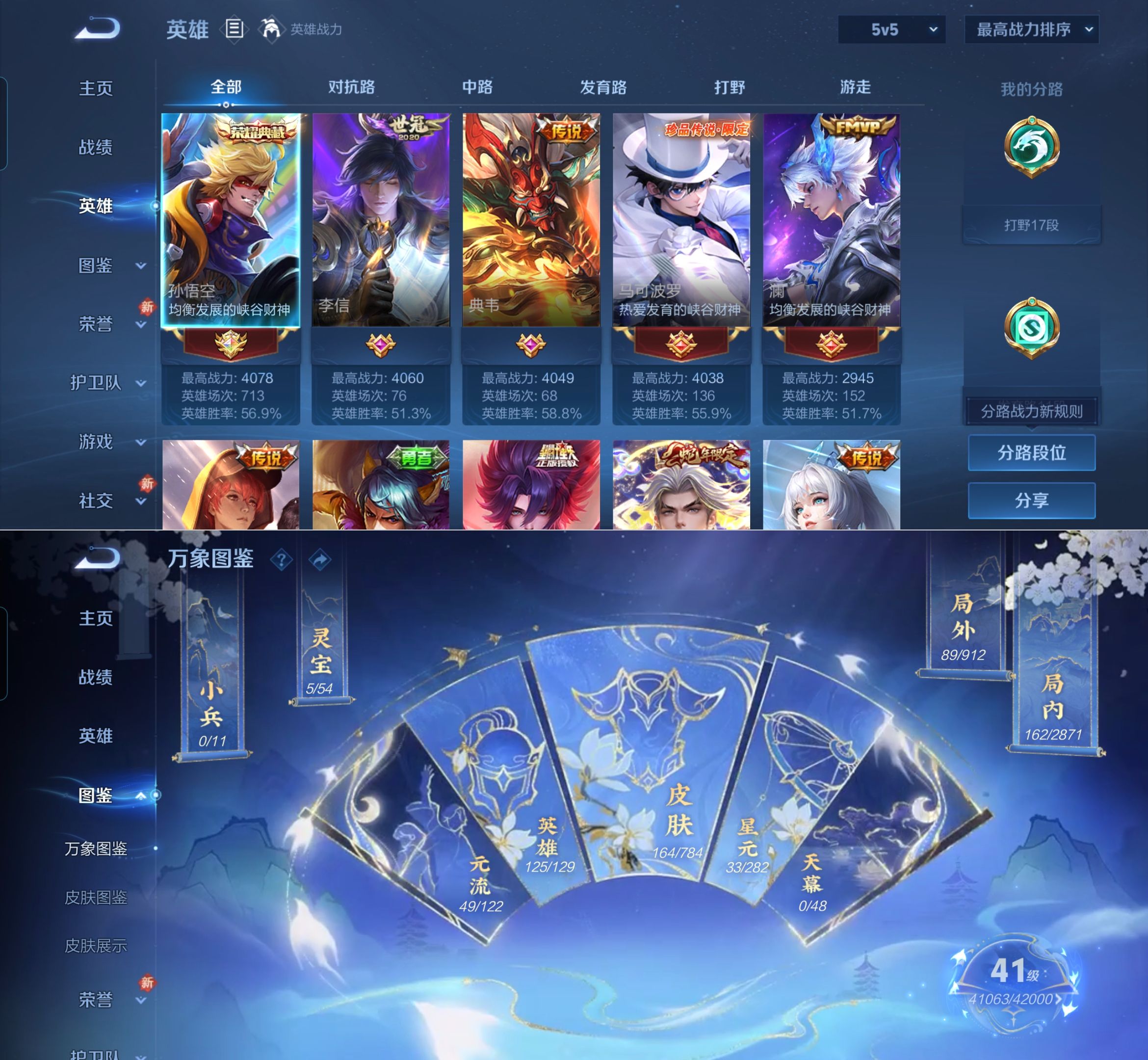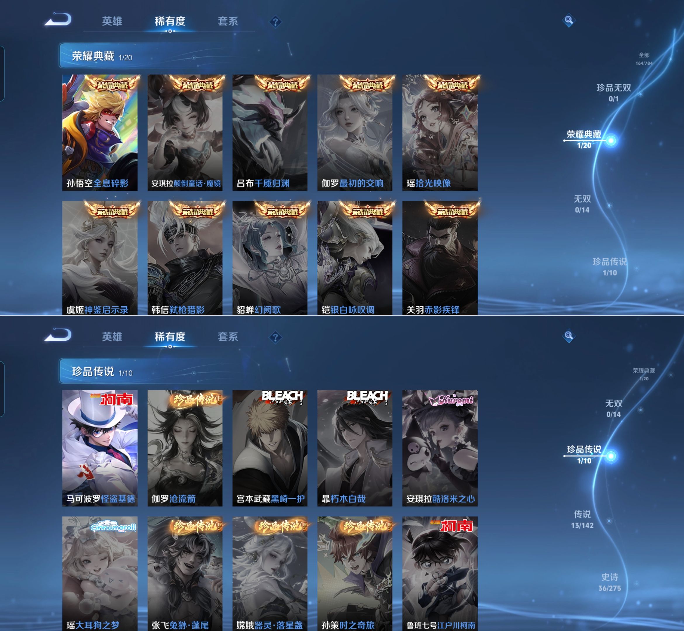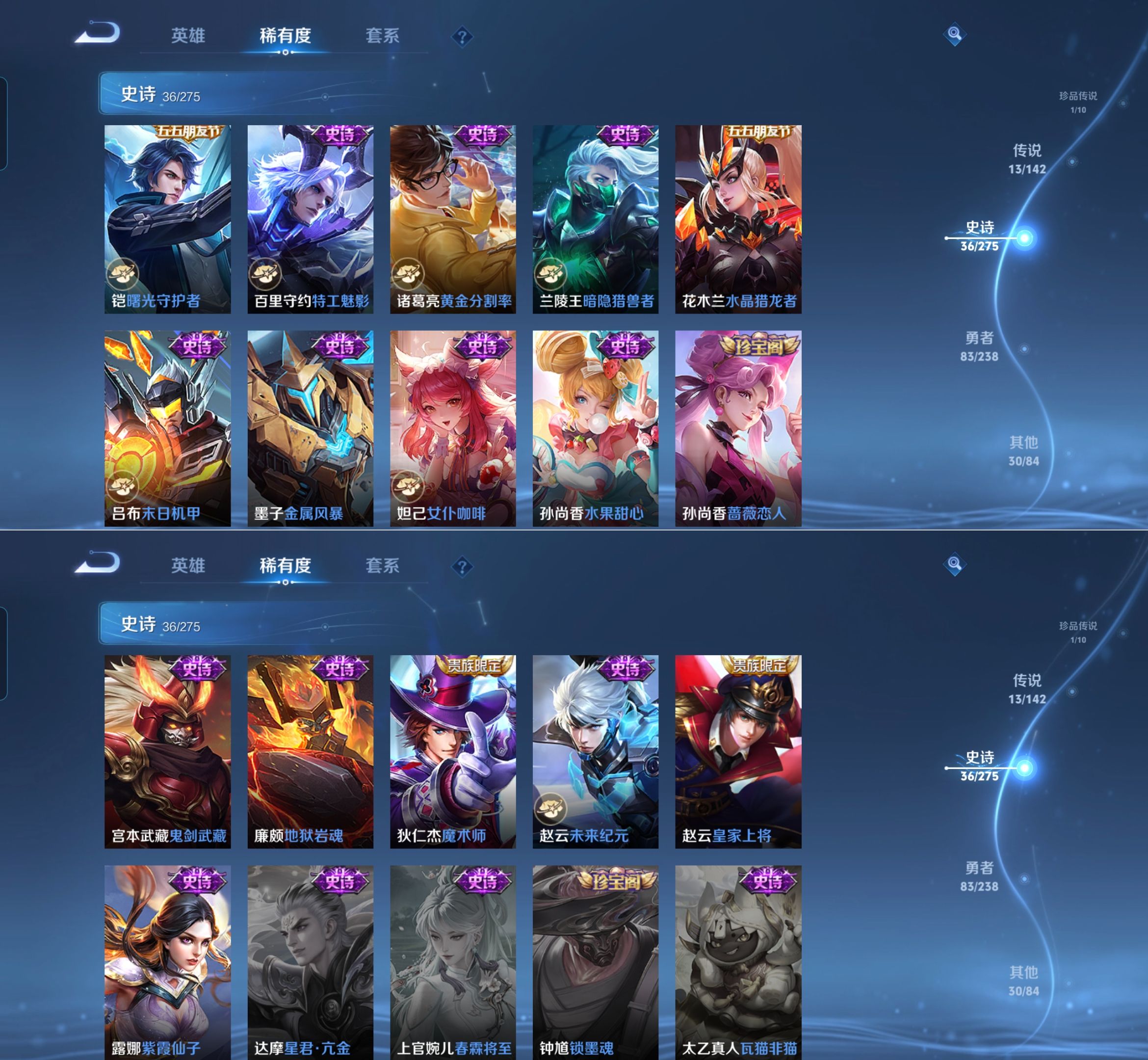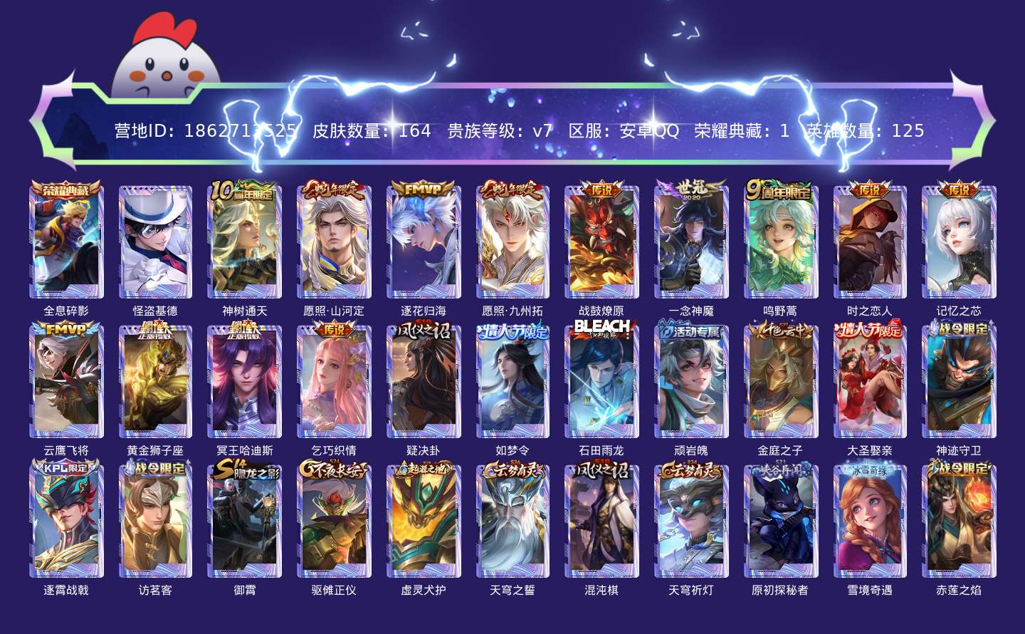 贵族等级:v7皮肤数:164情人节限定2 传说品质13 生肖限定3 荣耀典藏1 珍品传说1 英雄数:125