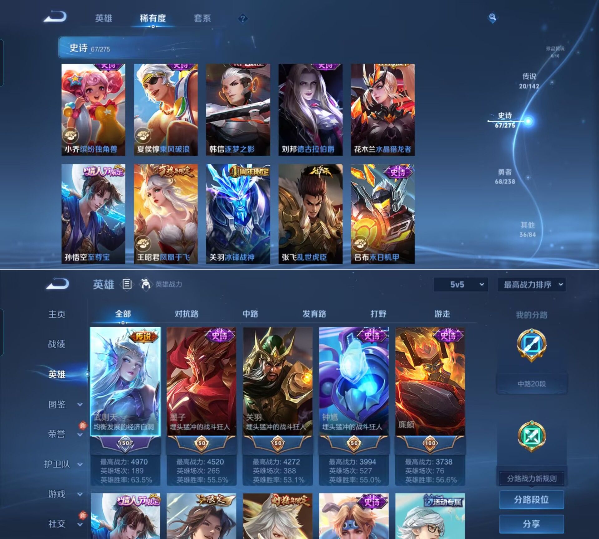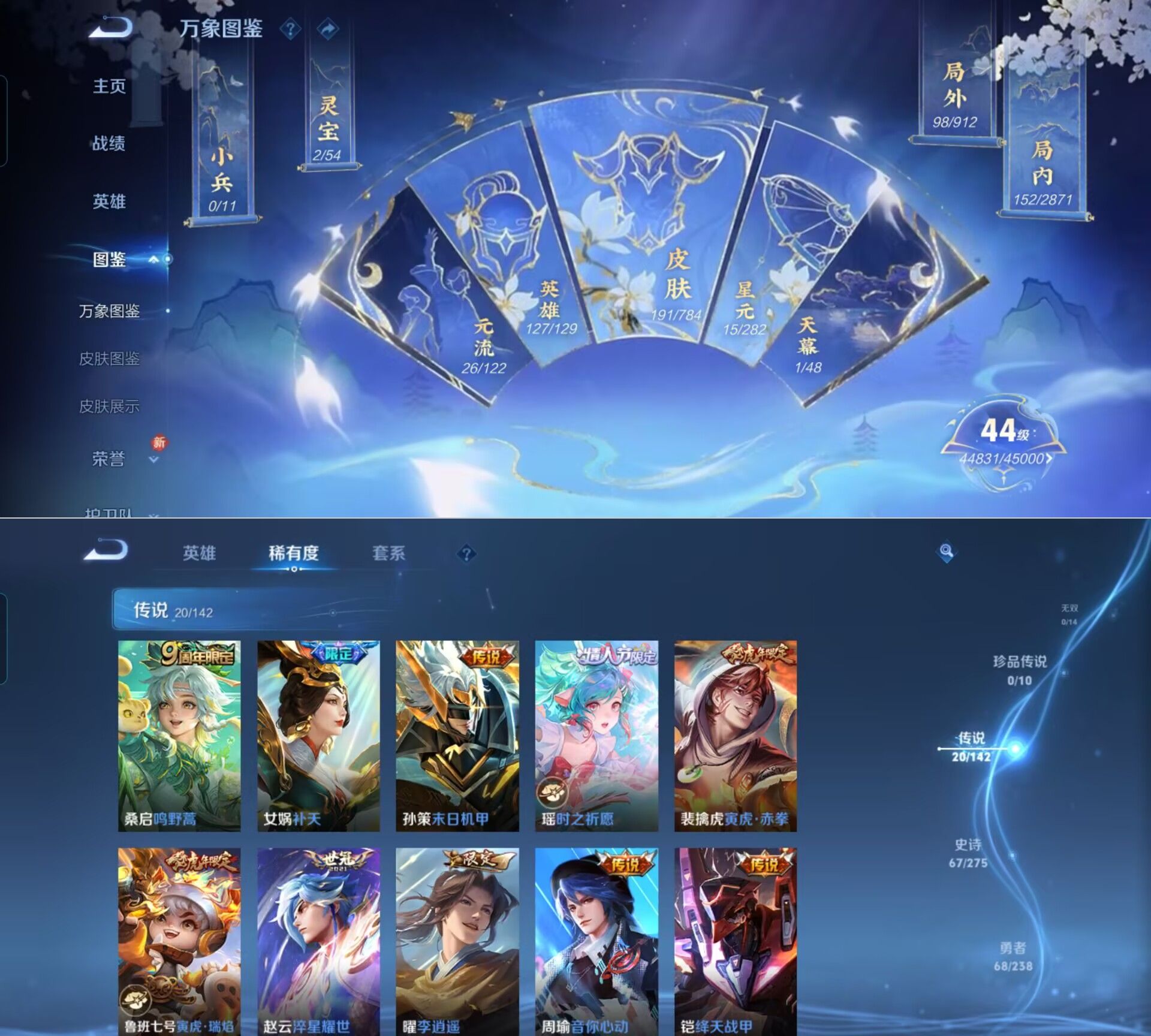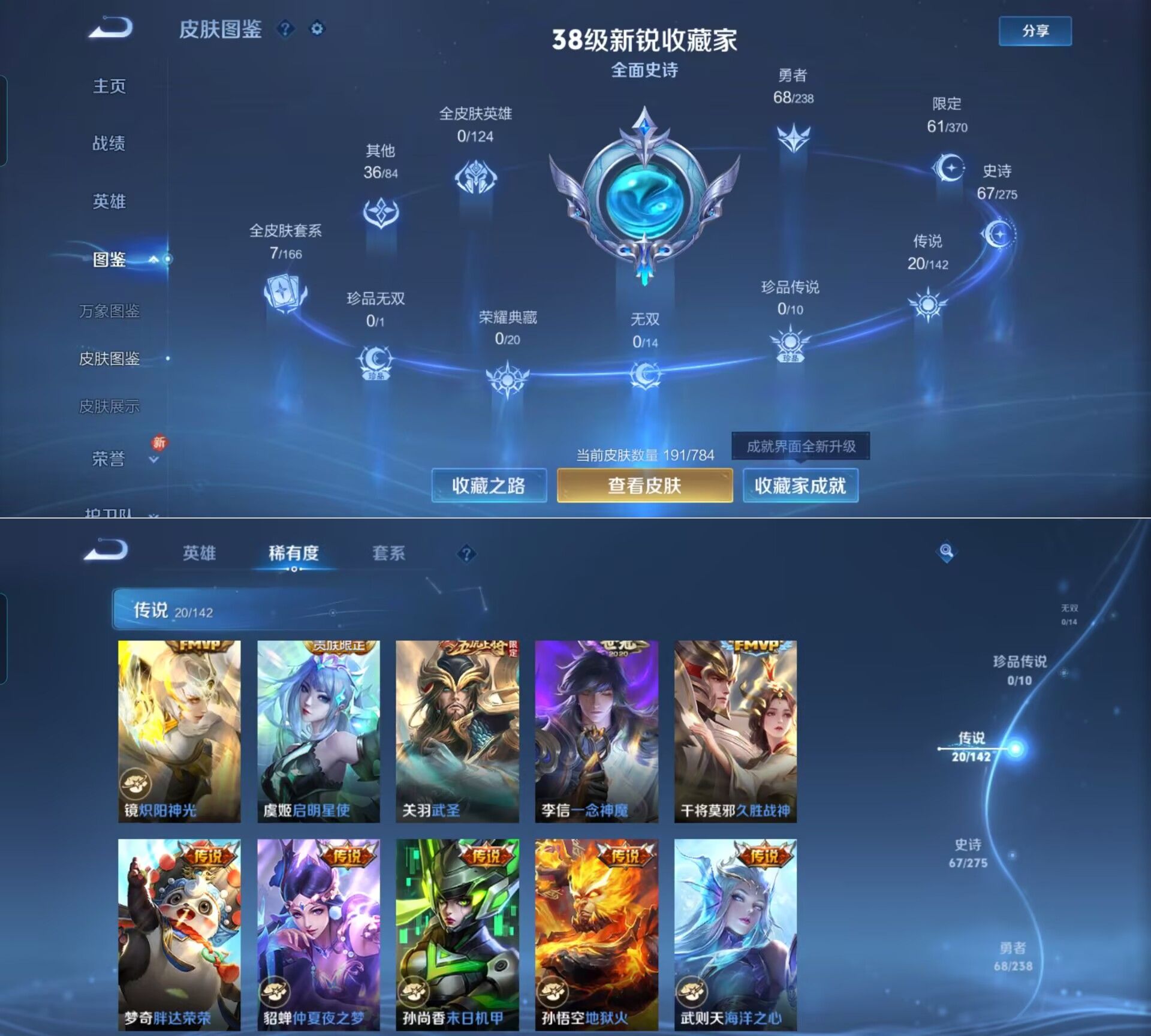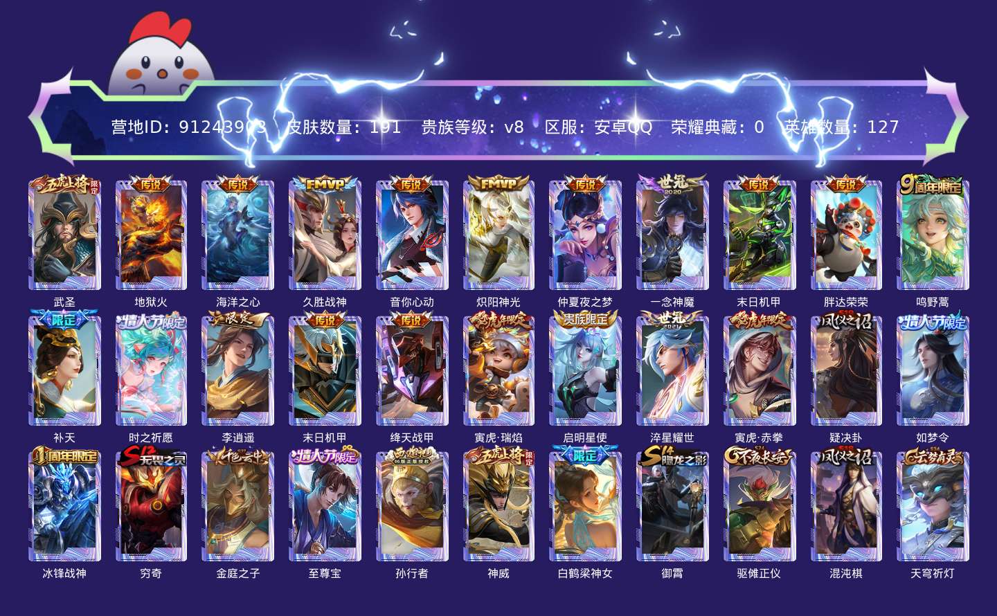 贵族等级:v8皮肤数:191情人节限定3 传说品质20 生肖限定5 英雄数:127