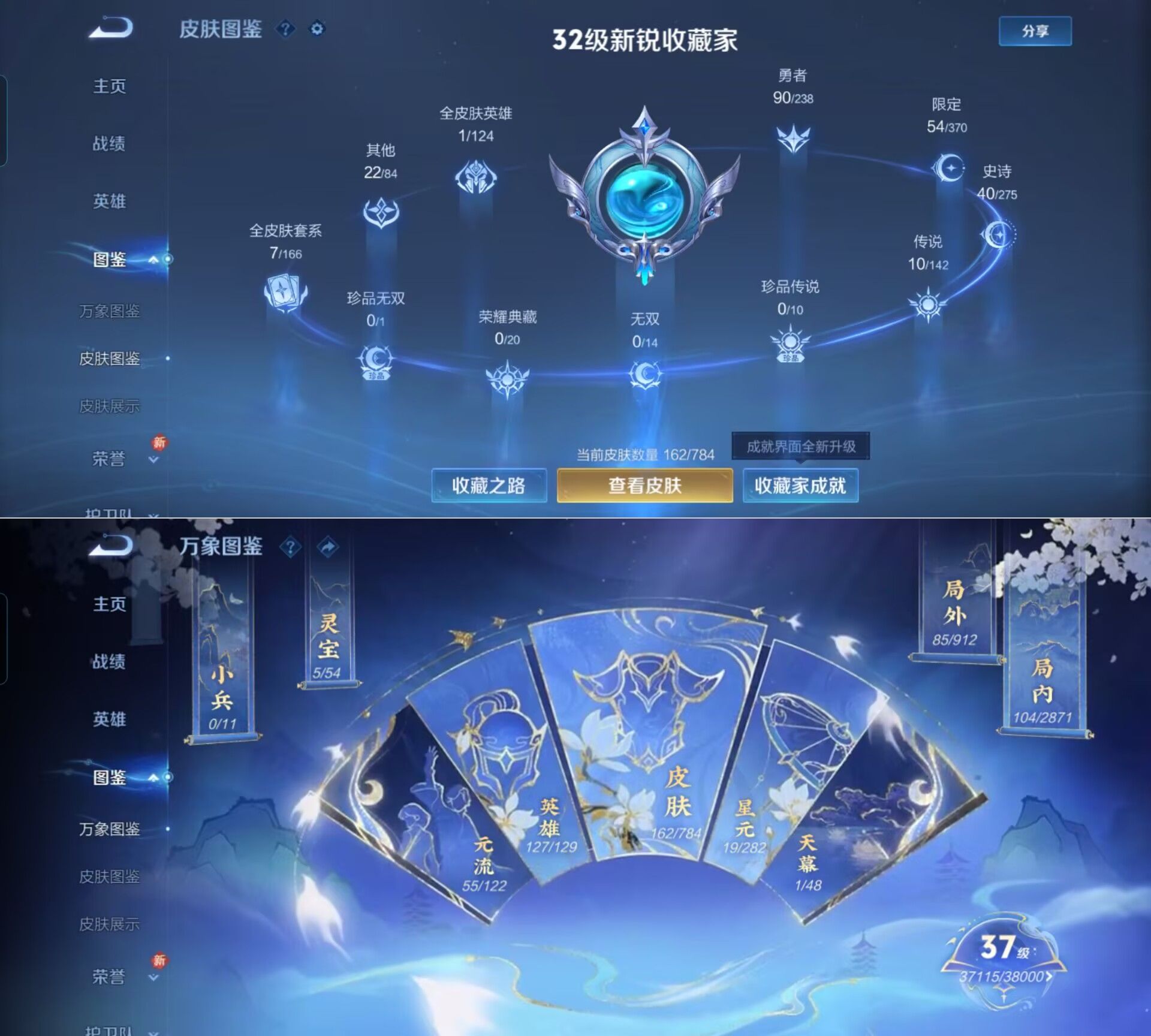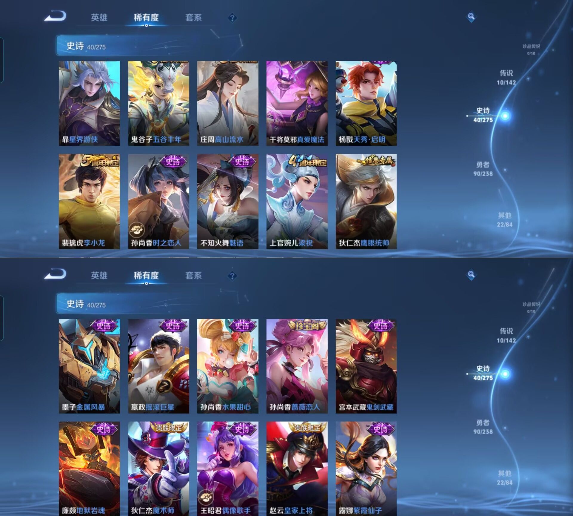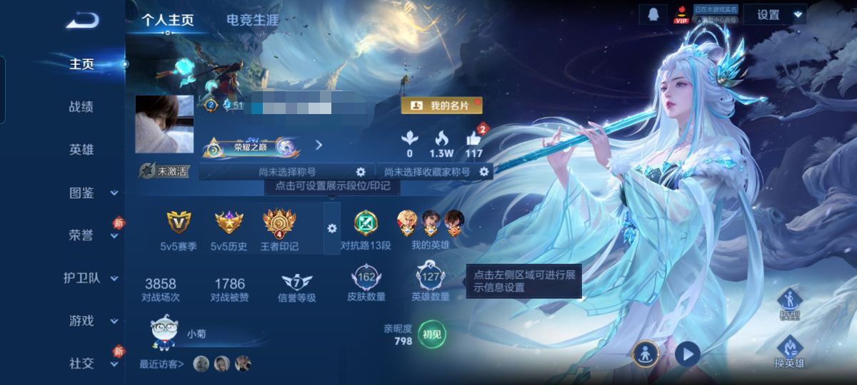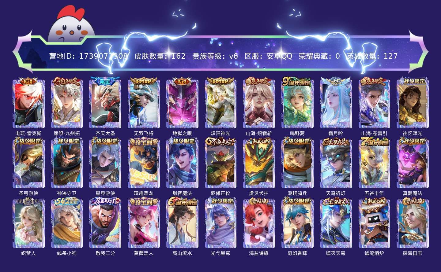 贵族等级:v6皮肤数:162传说品质10 生肖限定3 英雄数:127