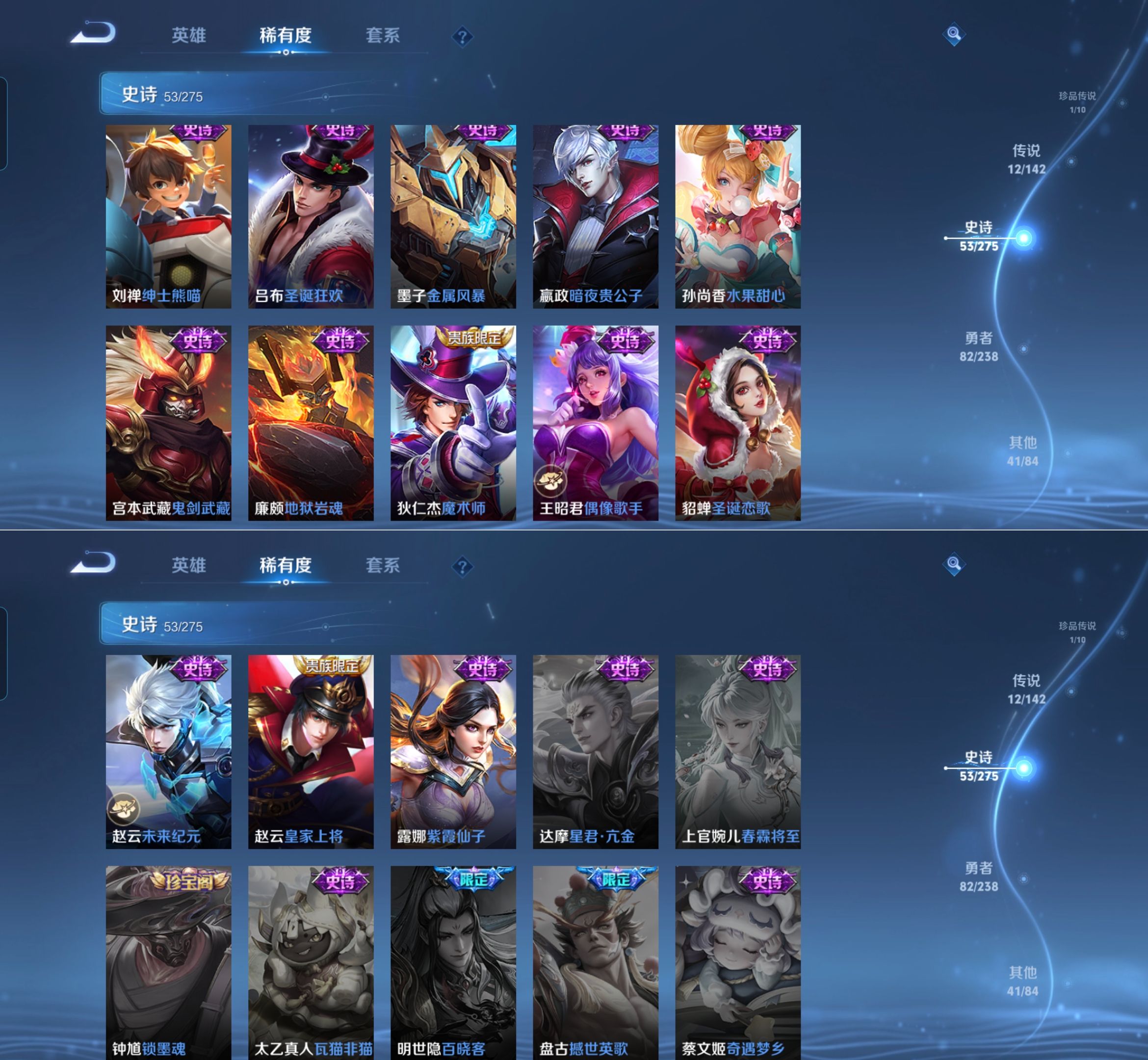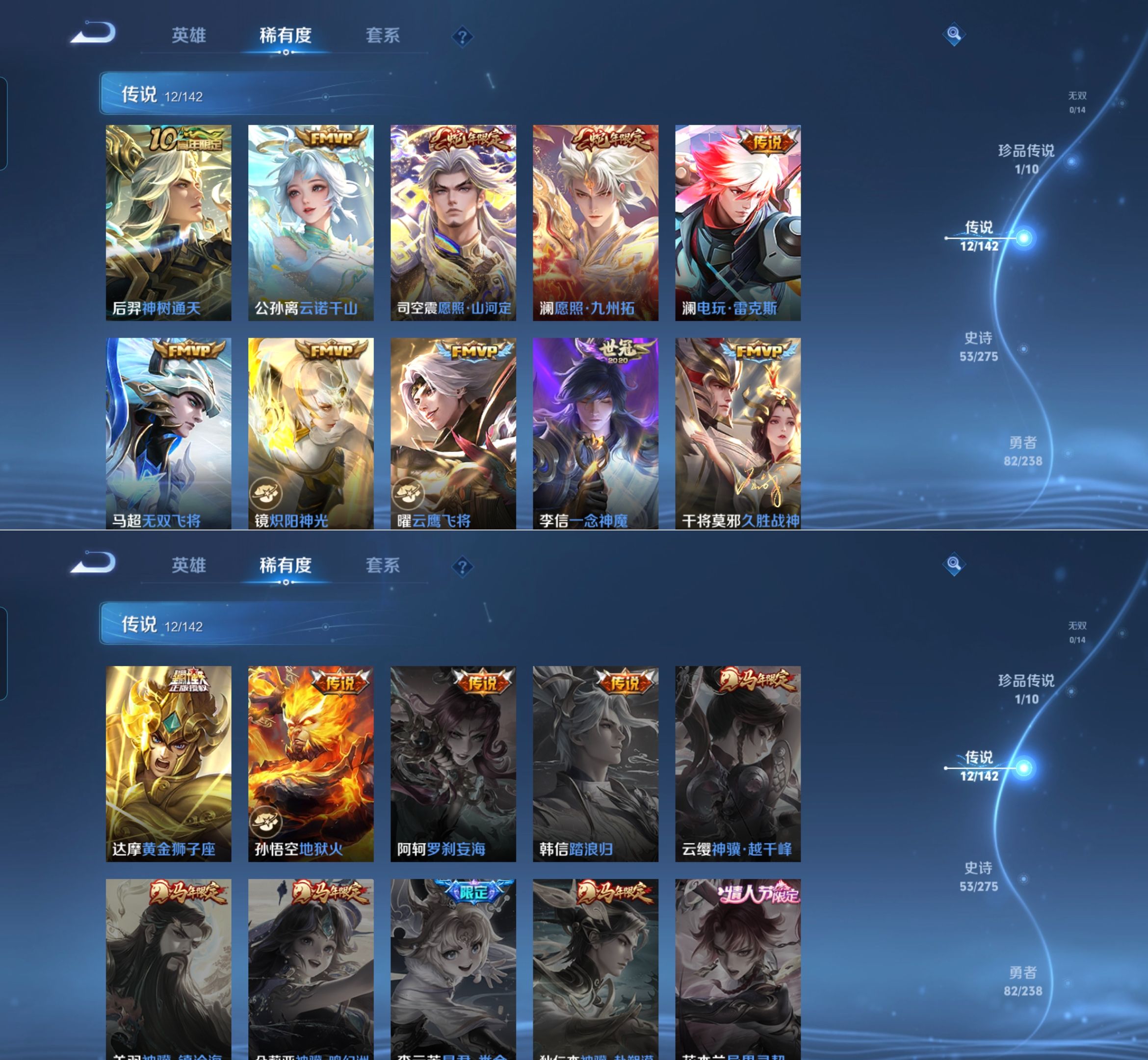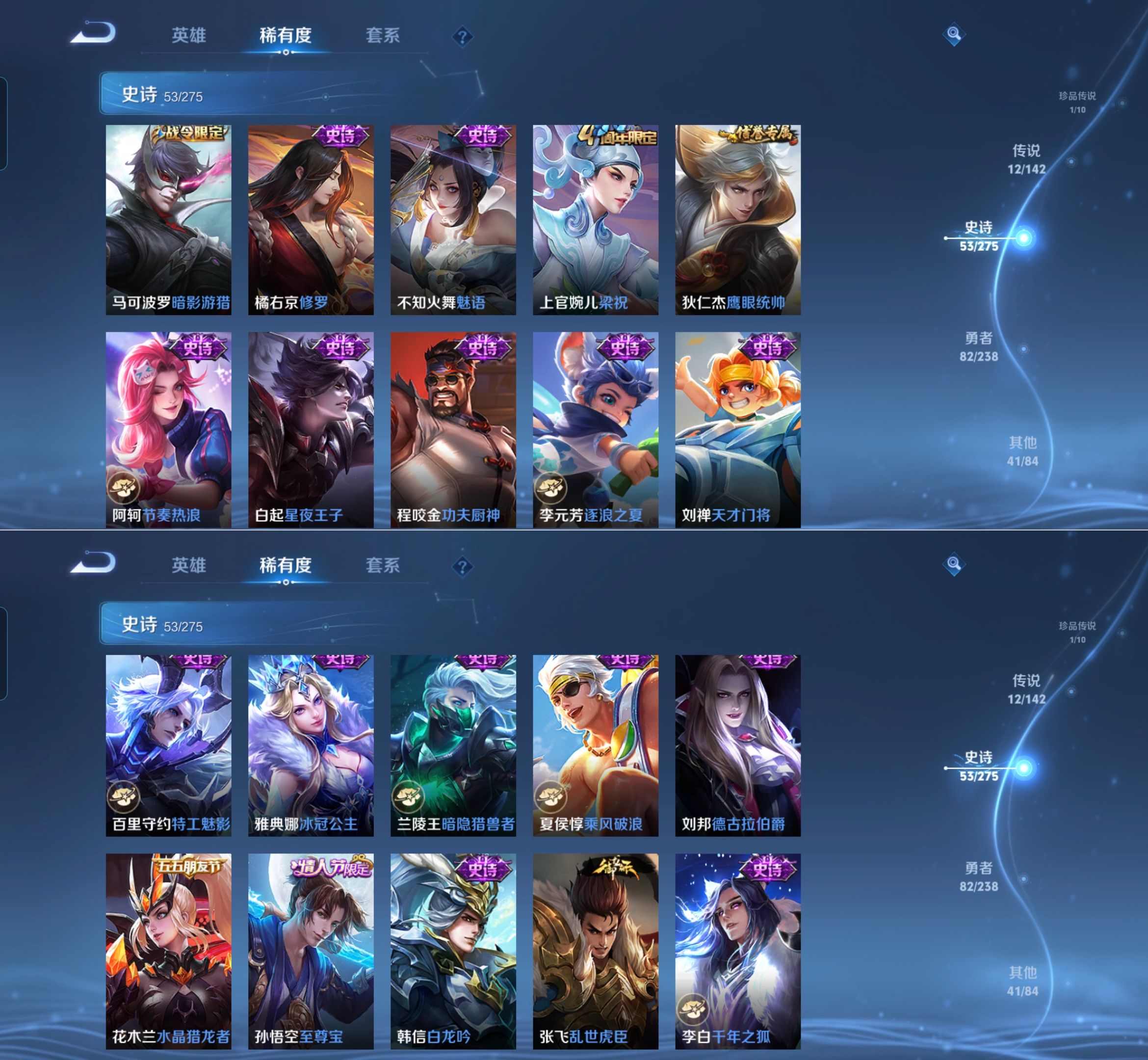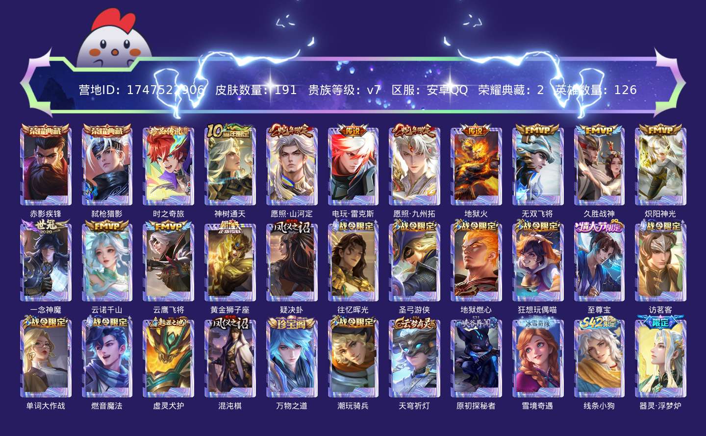 贵族等级:v7皮肤数:191传说品质12 荣耀典藏2 生肖限定2 情人节限定1 珍品传说1 英雄数:126