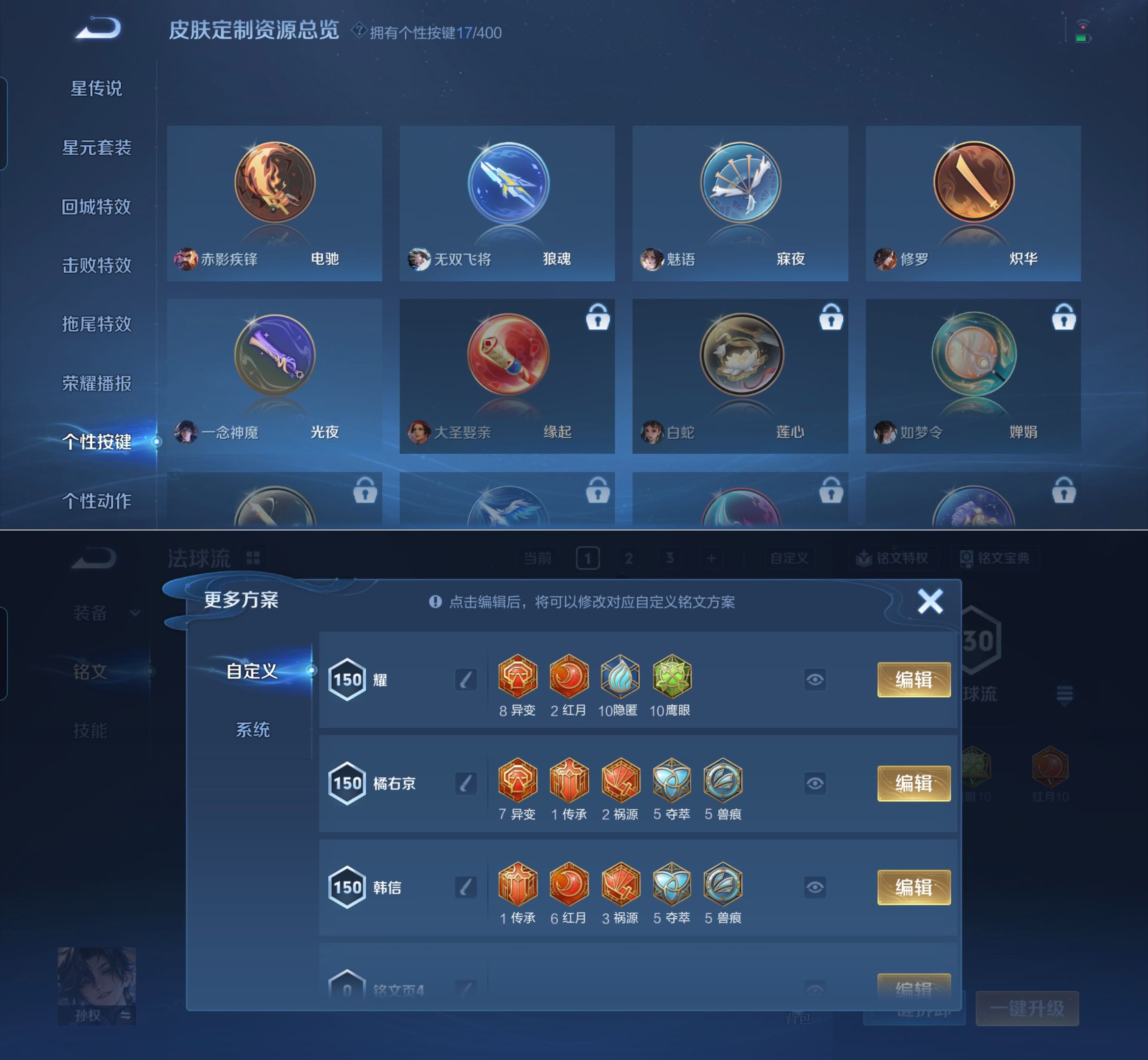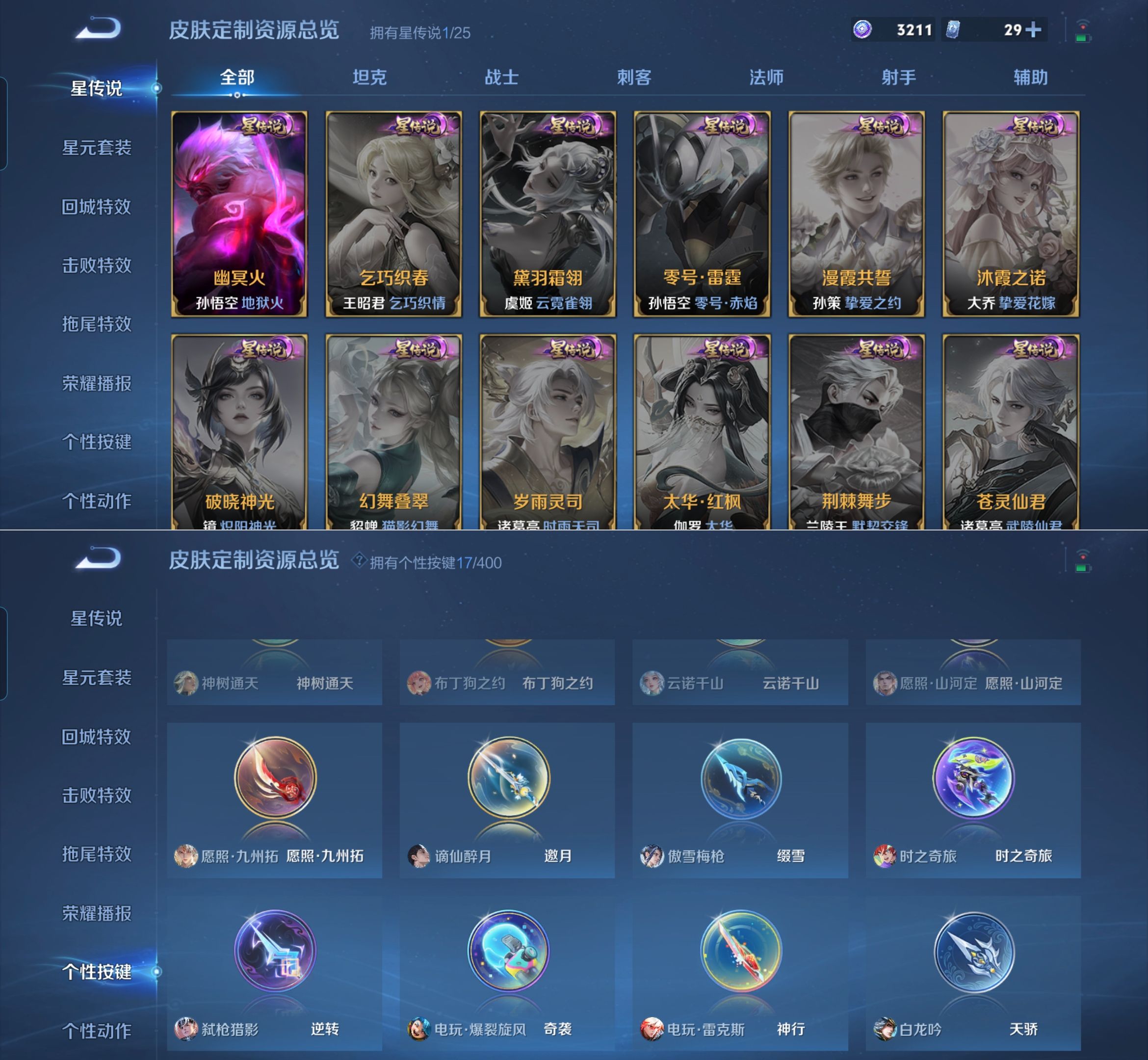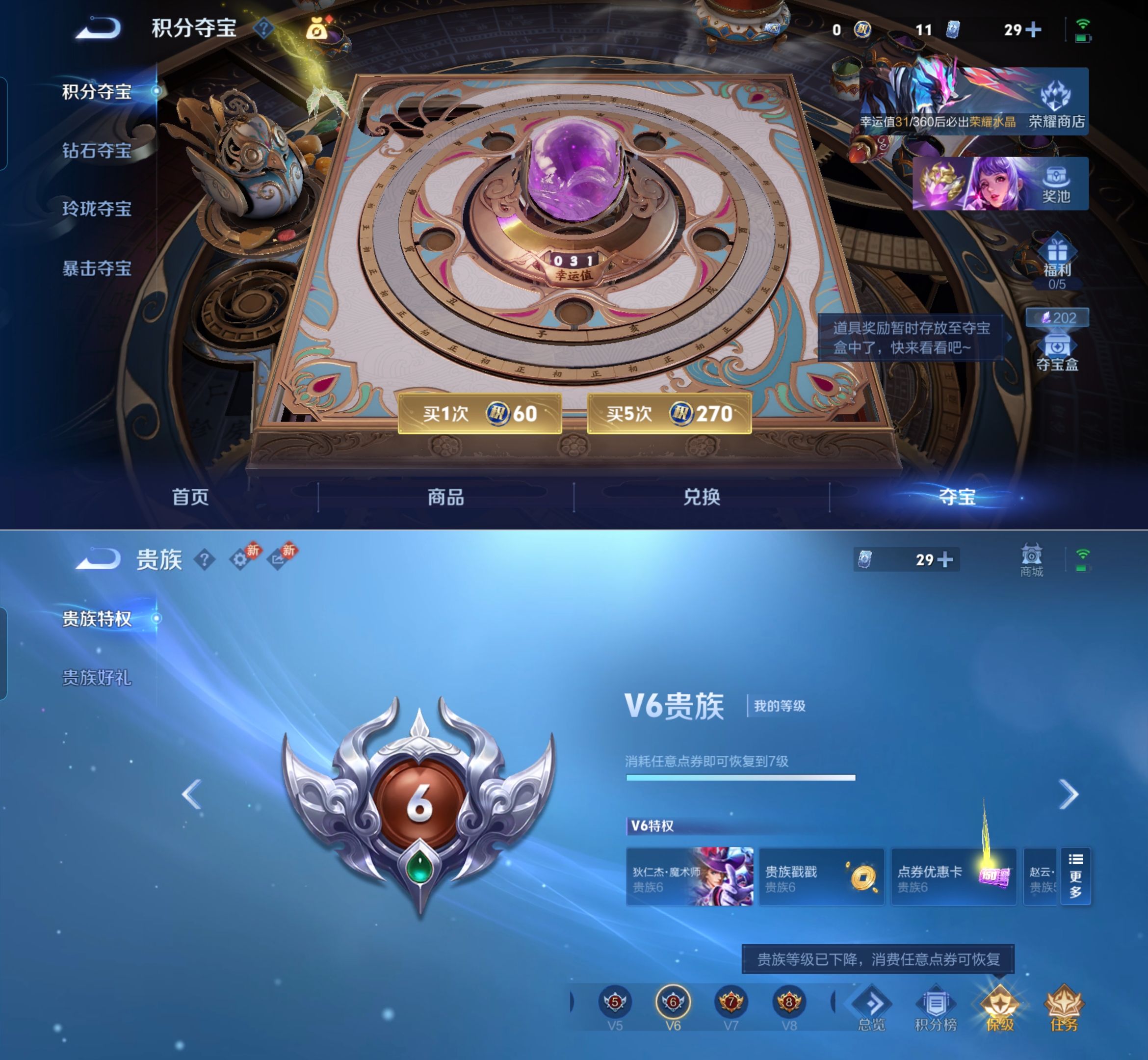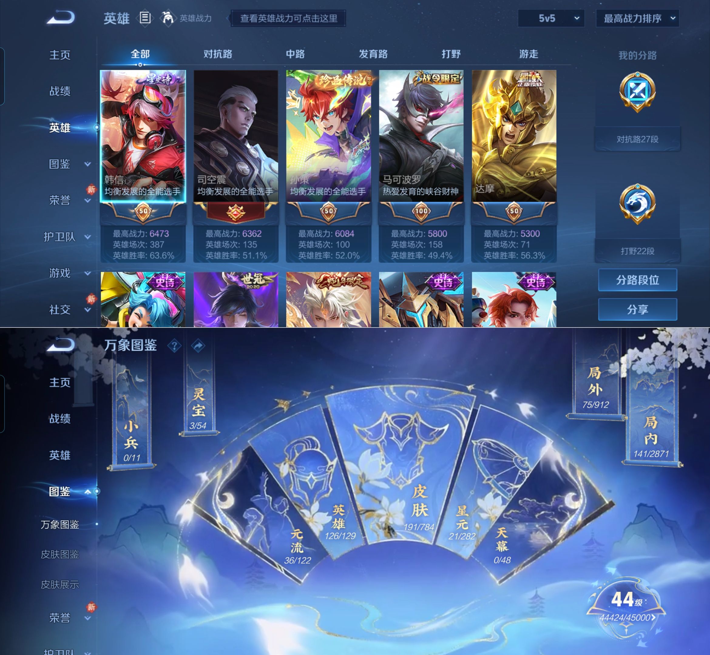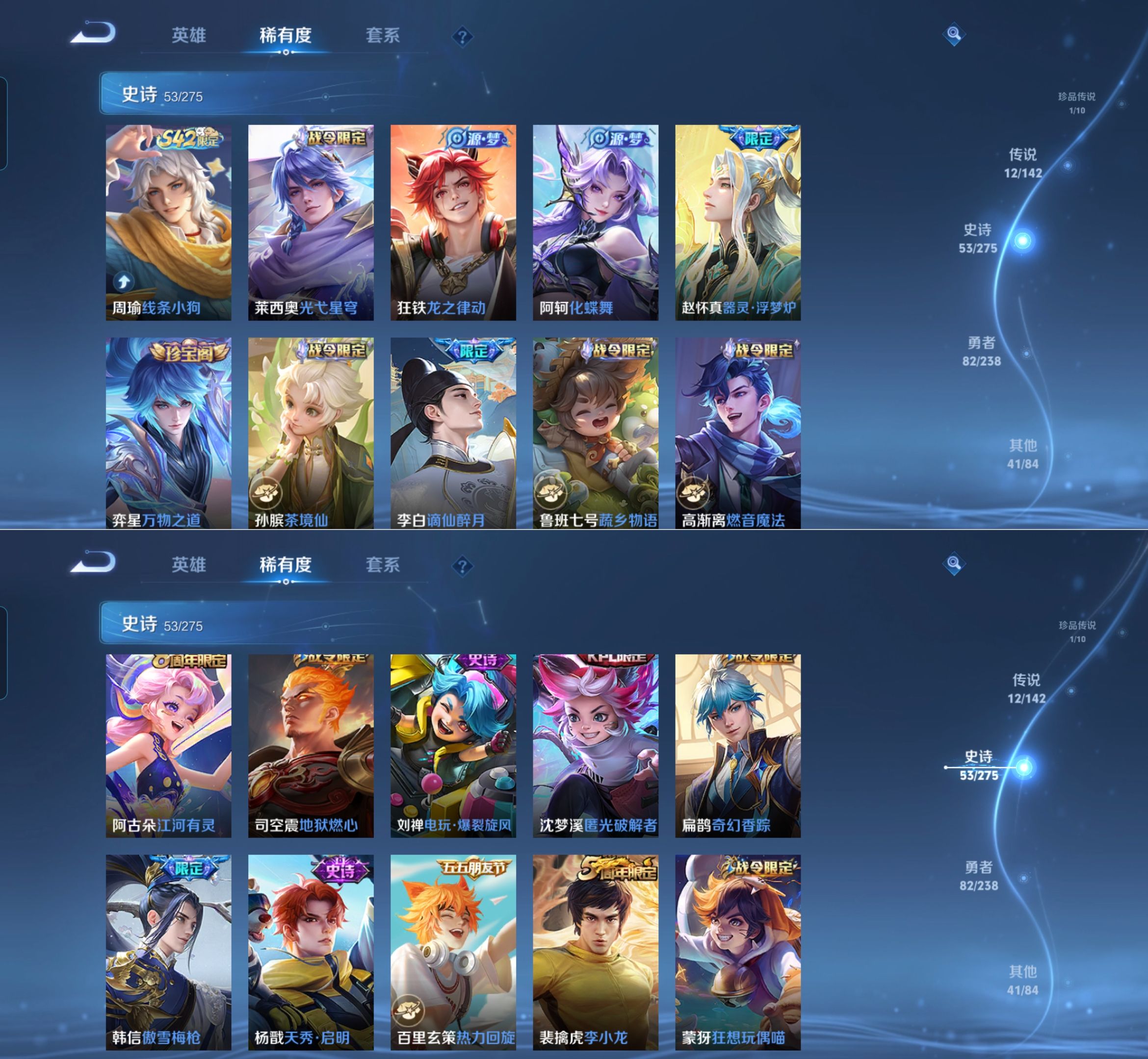 贵族等级:v7皮肤数:191传说品质12 荣耀典藏2 生肖限定2 情人节限定1 珍品传说1 英雄数:126
