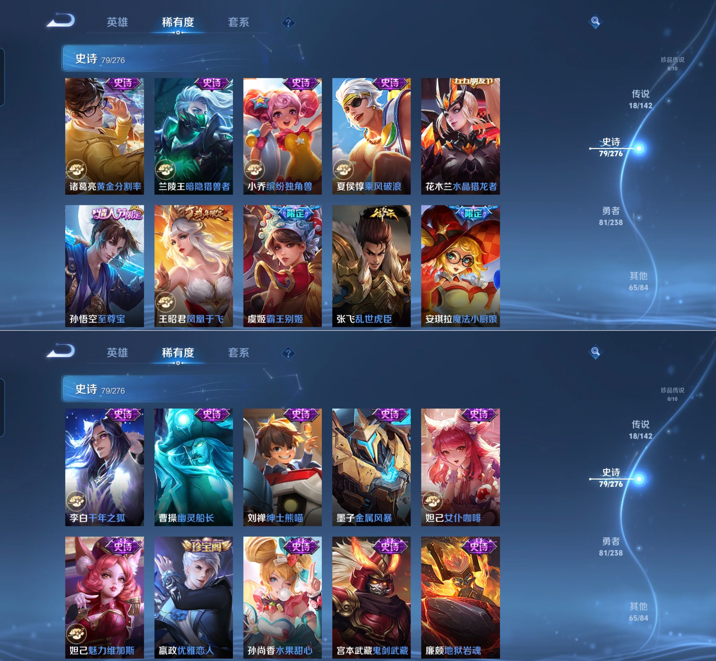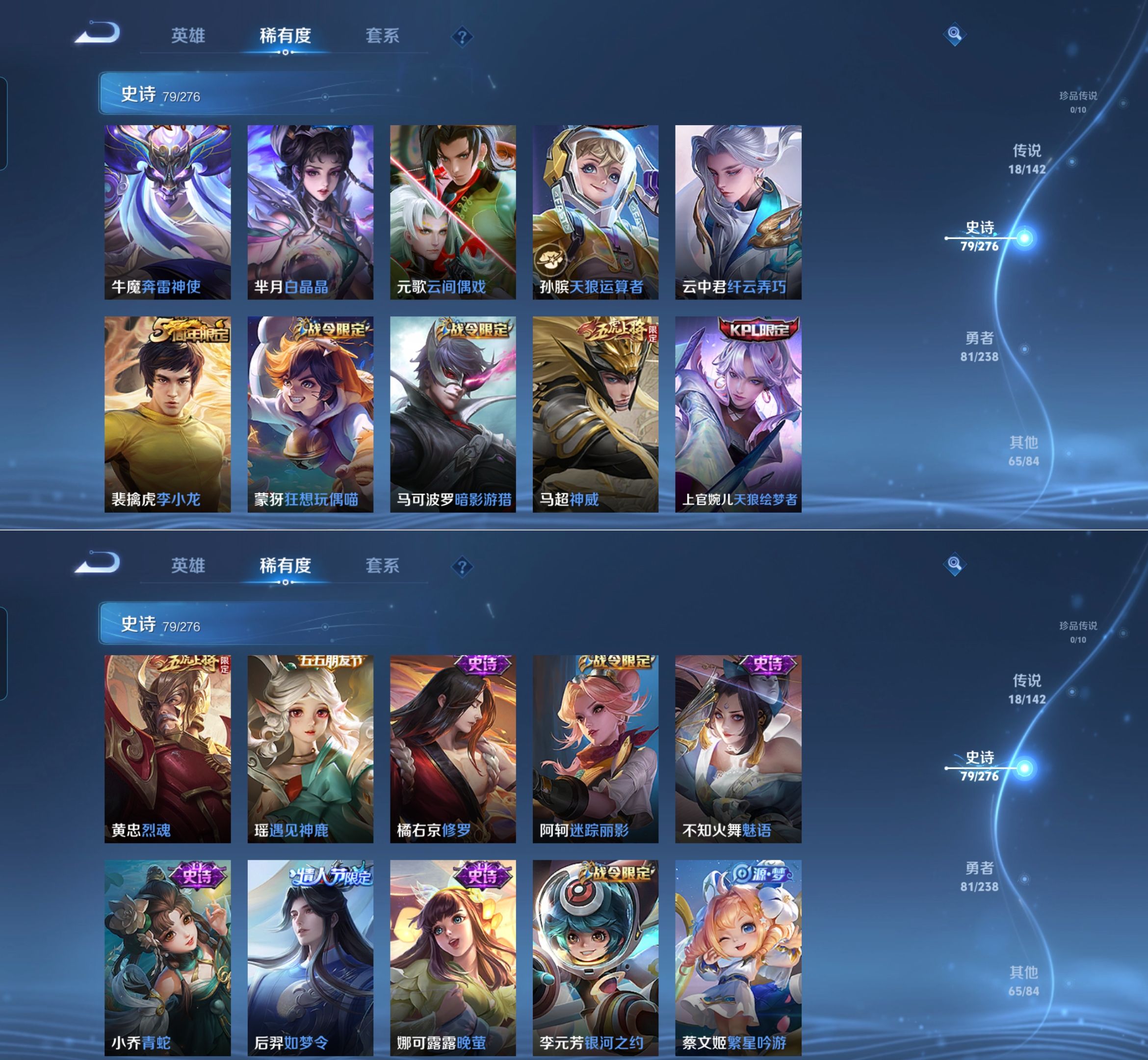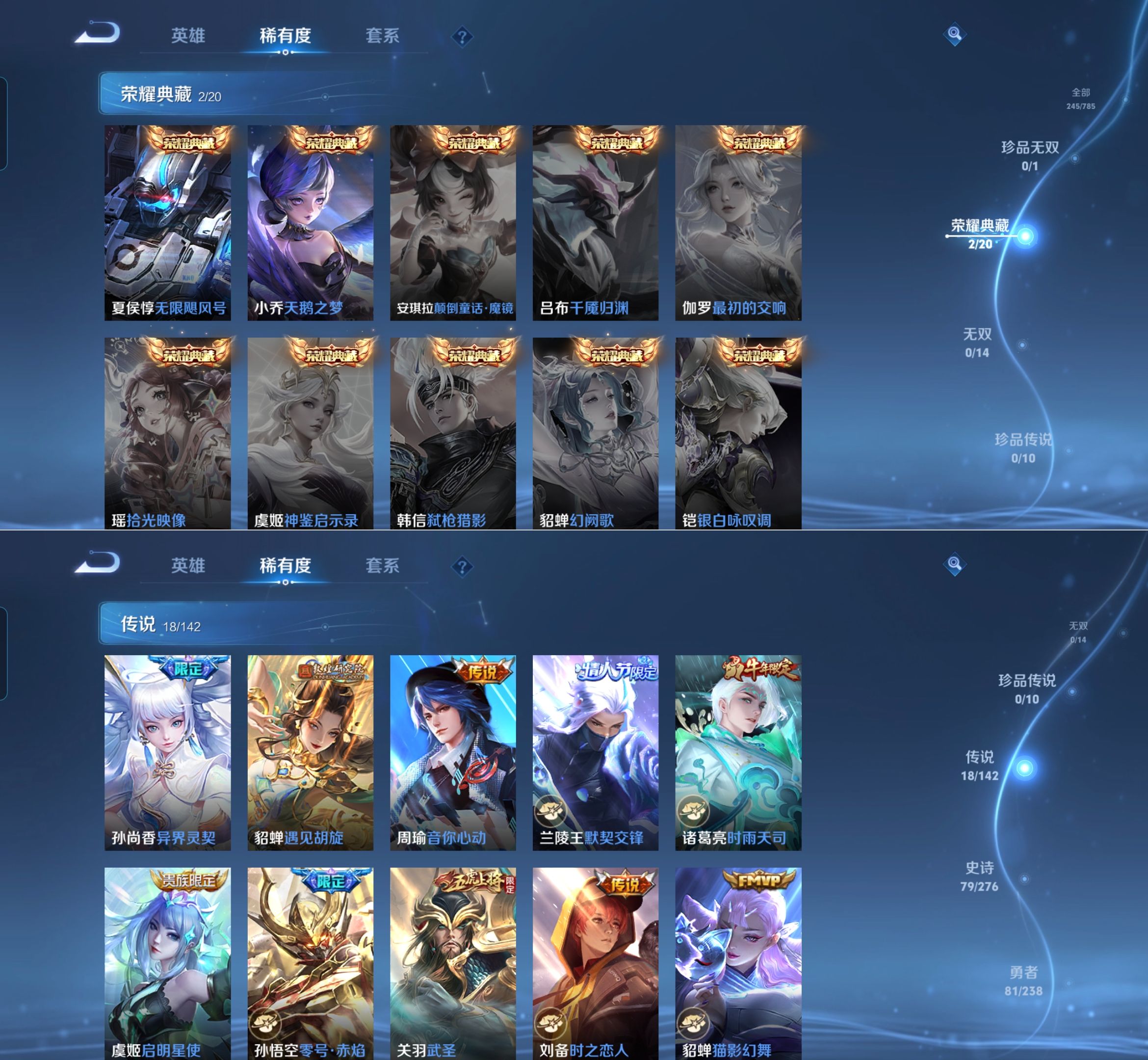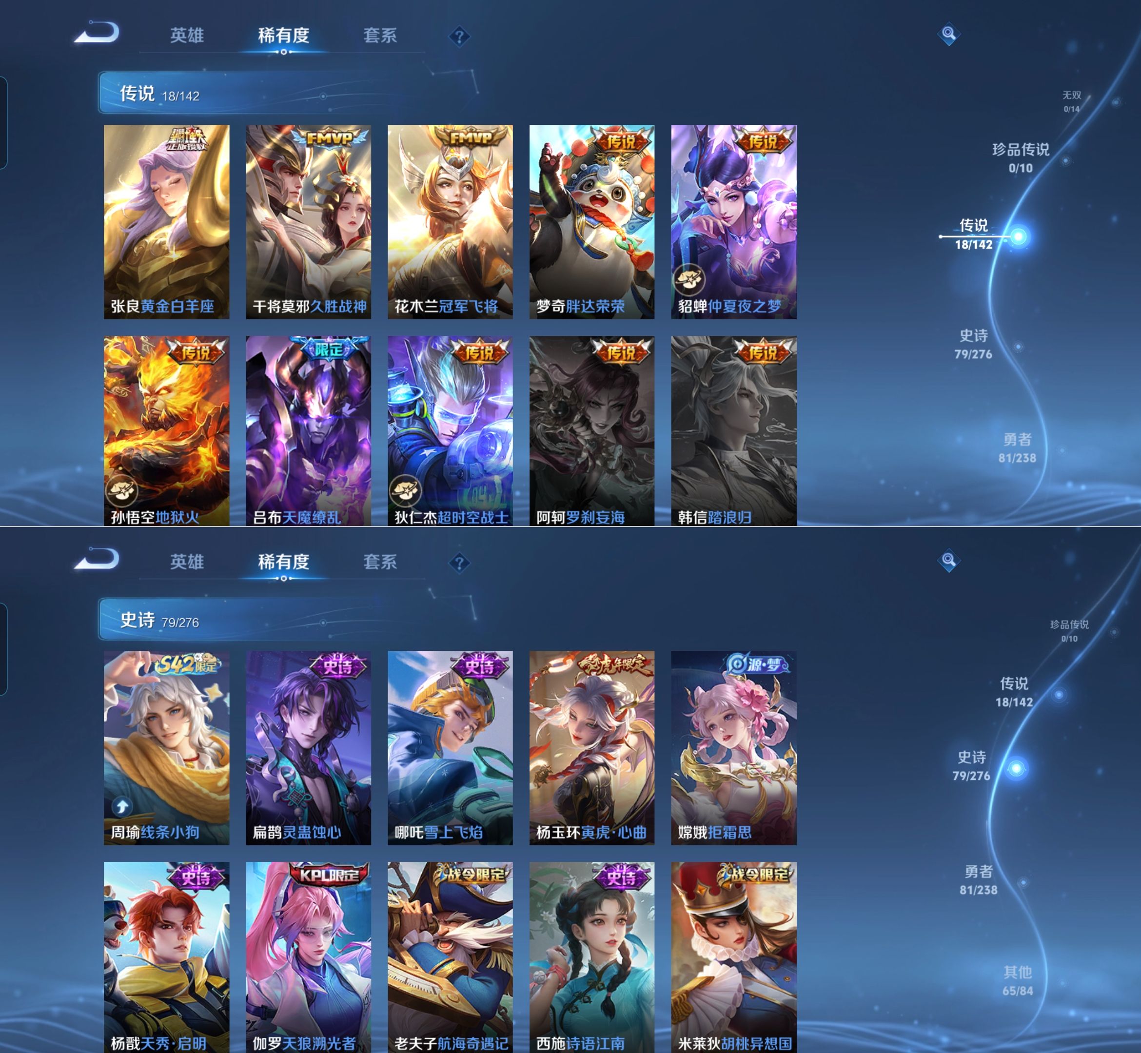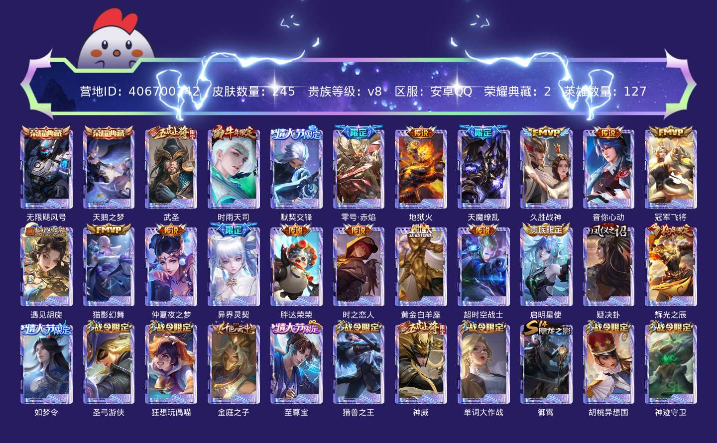 贵族等级:v8皮肤数:245生肖限定5 情人节限定4 传说品质18 荣耀典藏2 英雄数:127