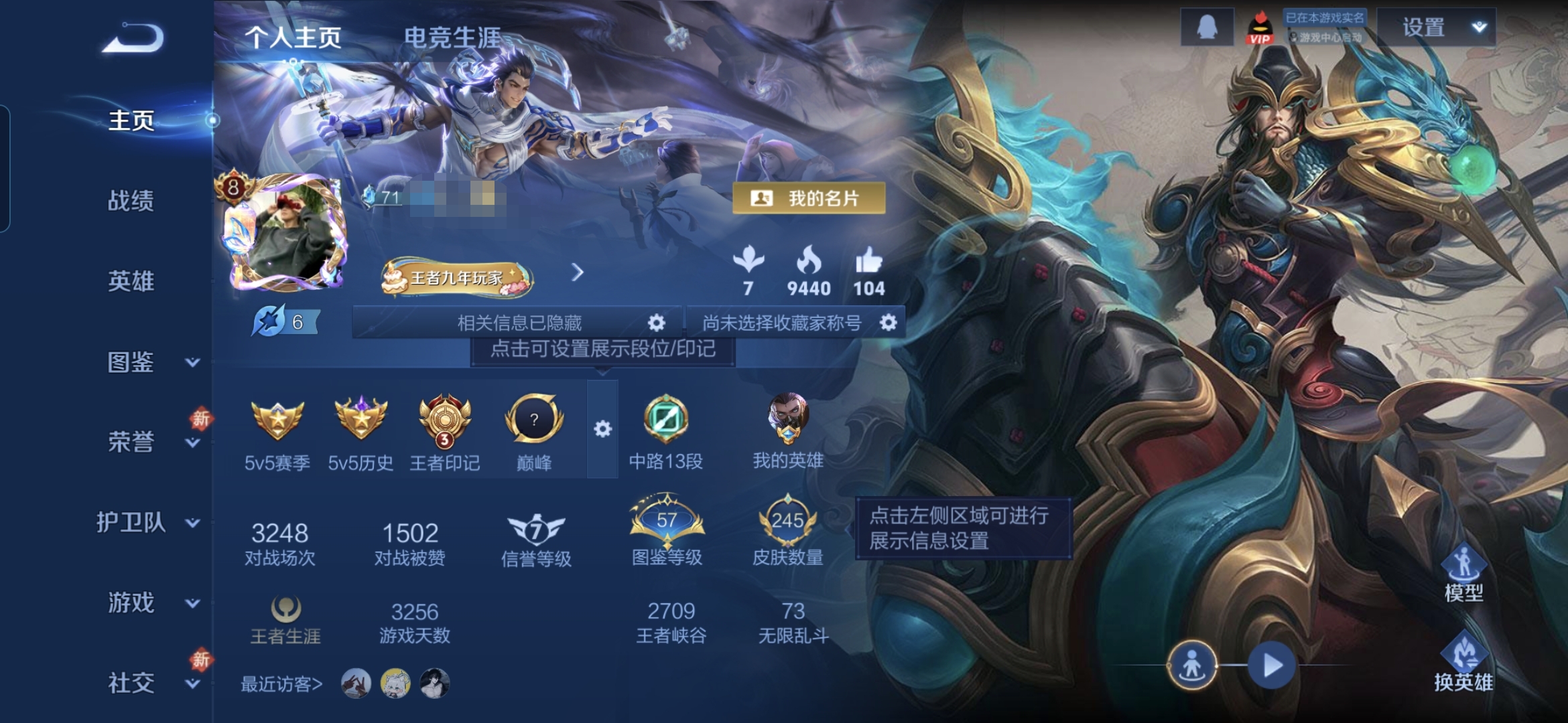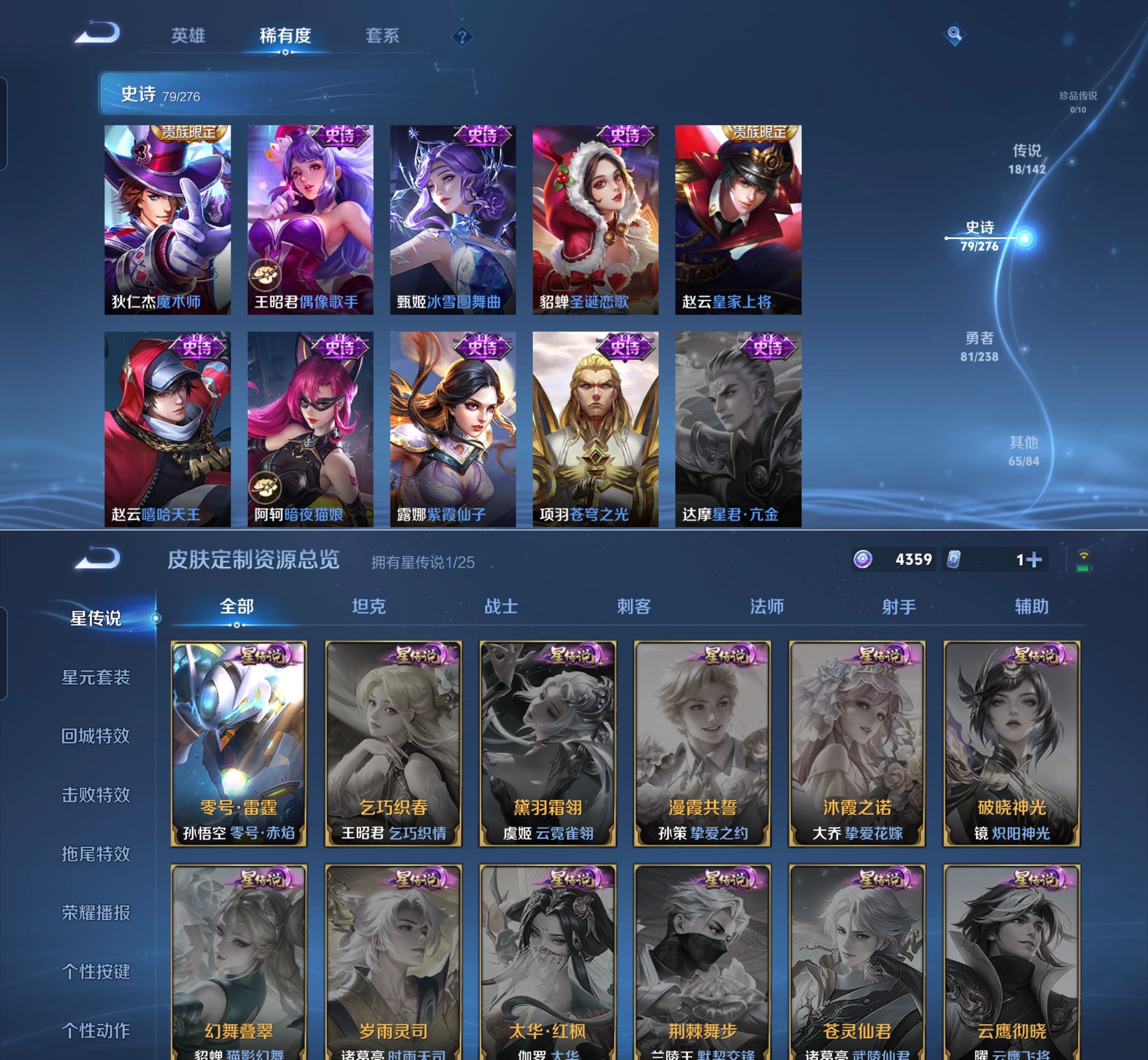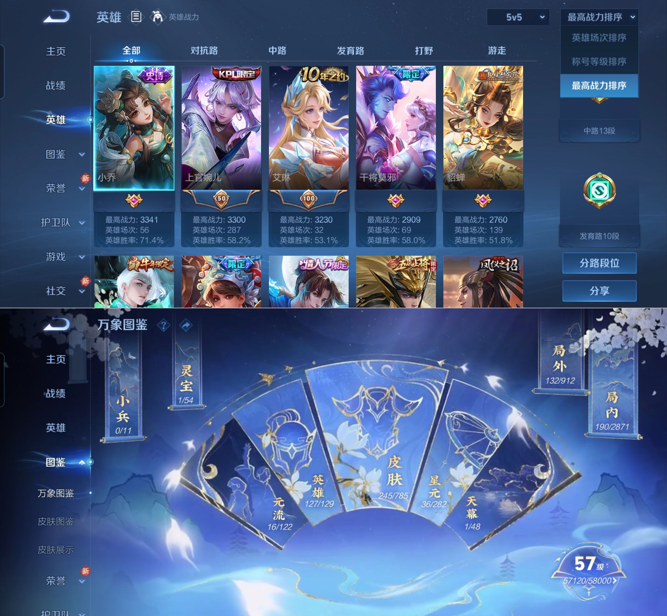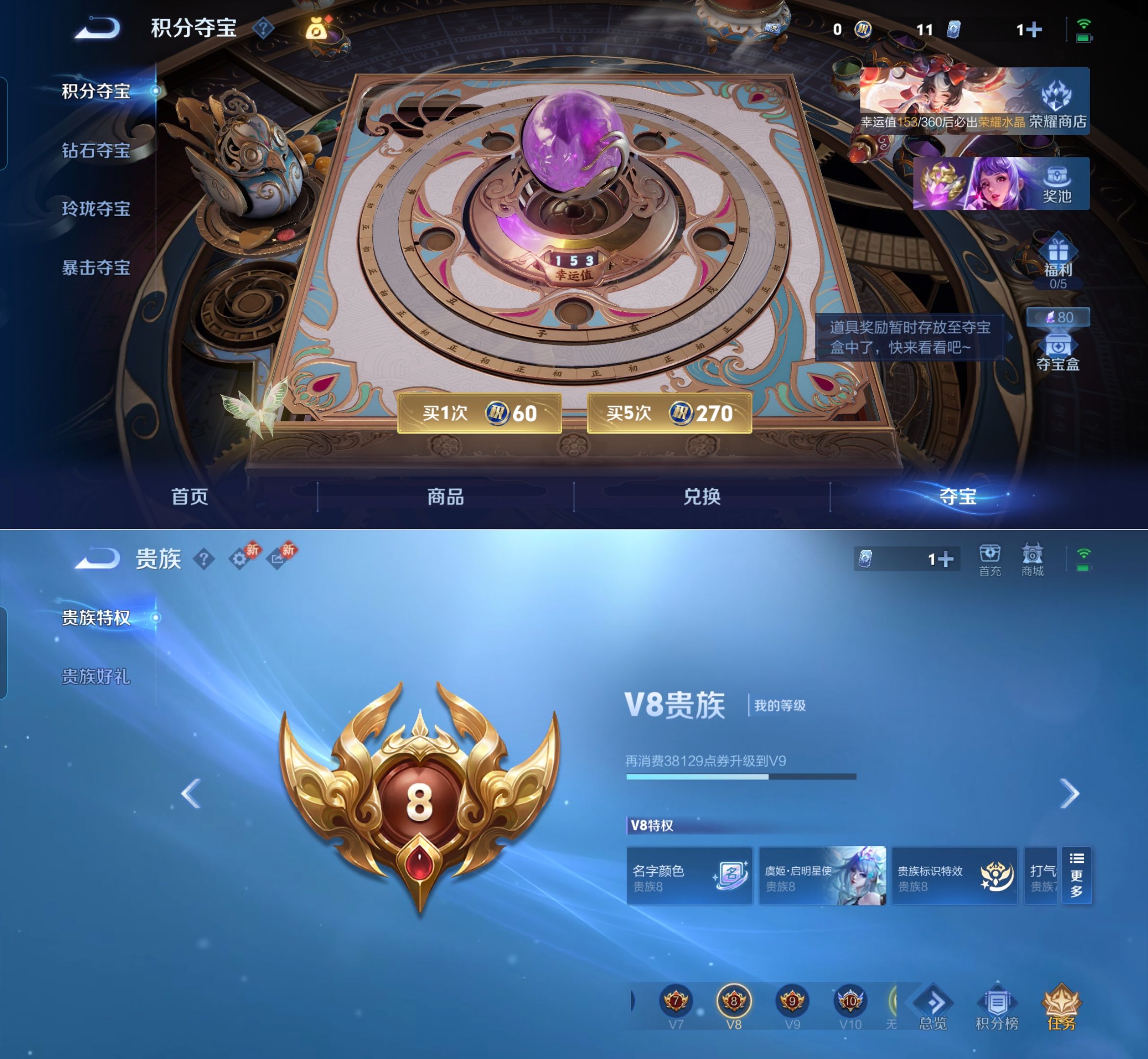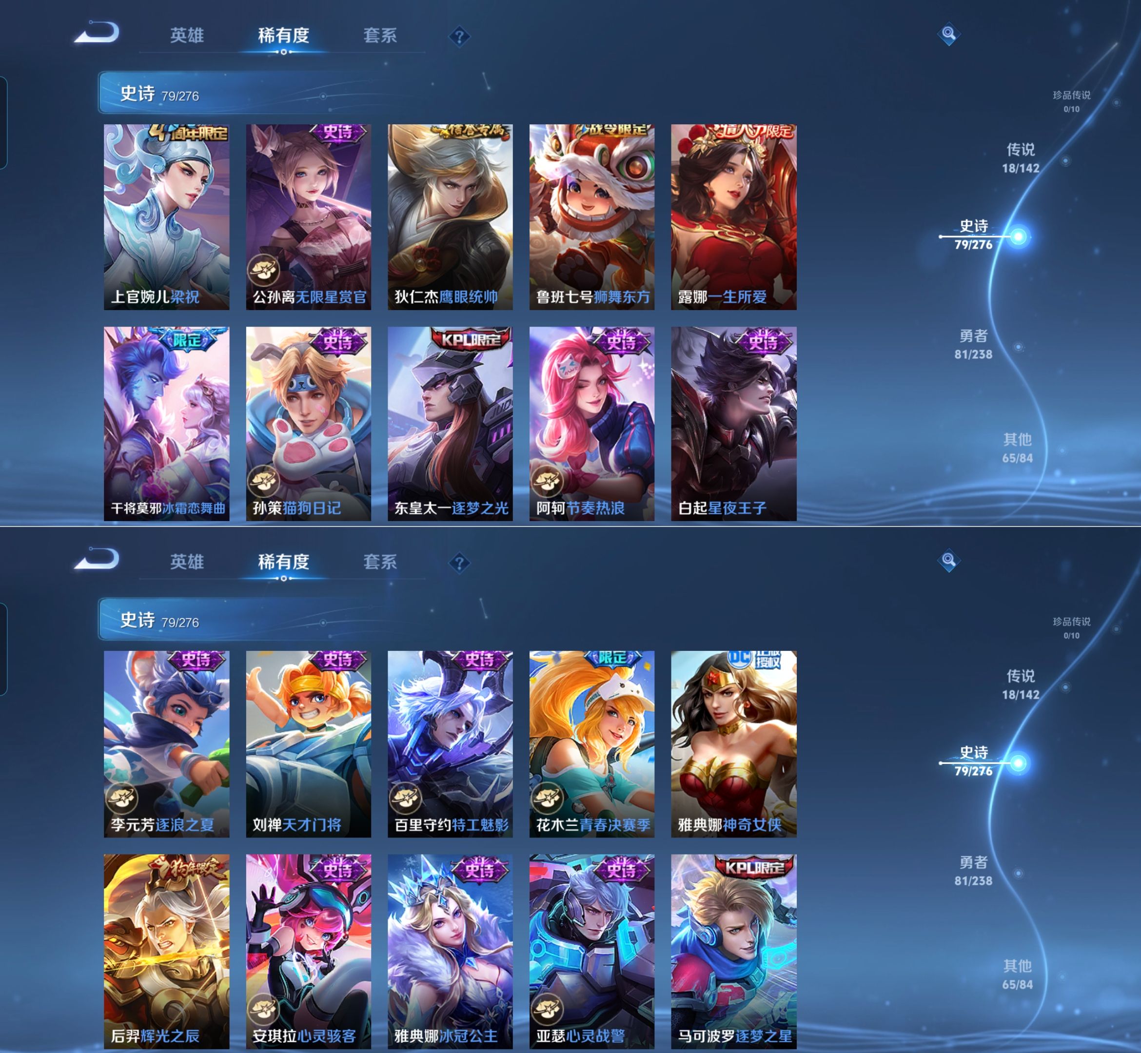 贵族等级:v8皮肤数:245生肖限定5 情人节限定4 传说品质18 荣耀典藏2 英雄数:127