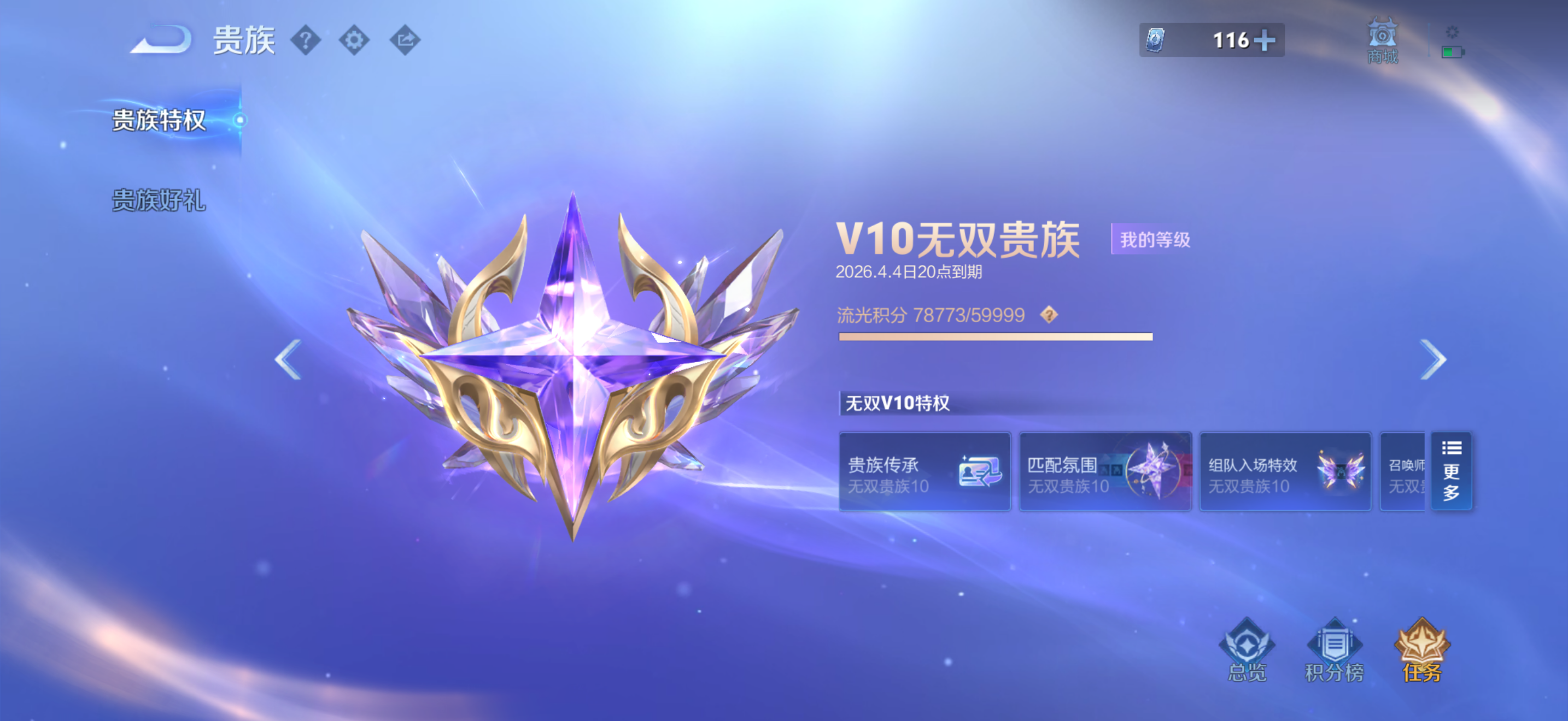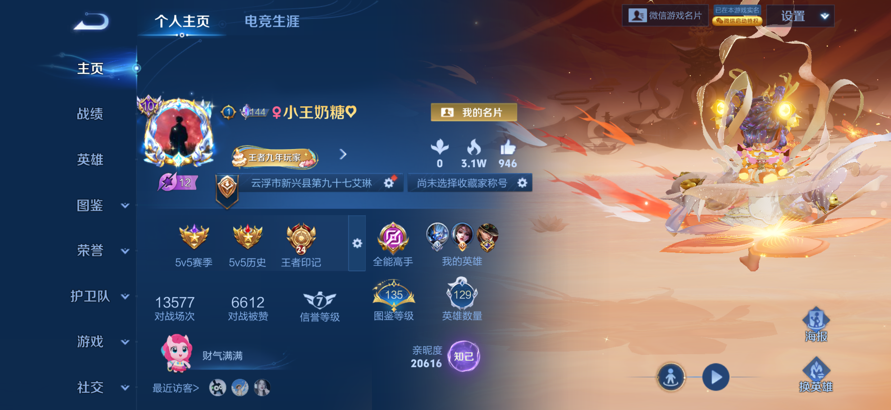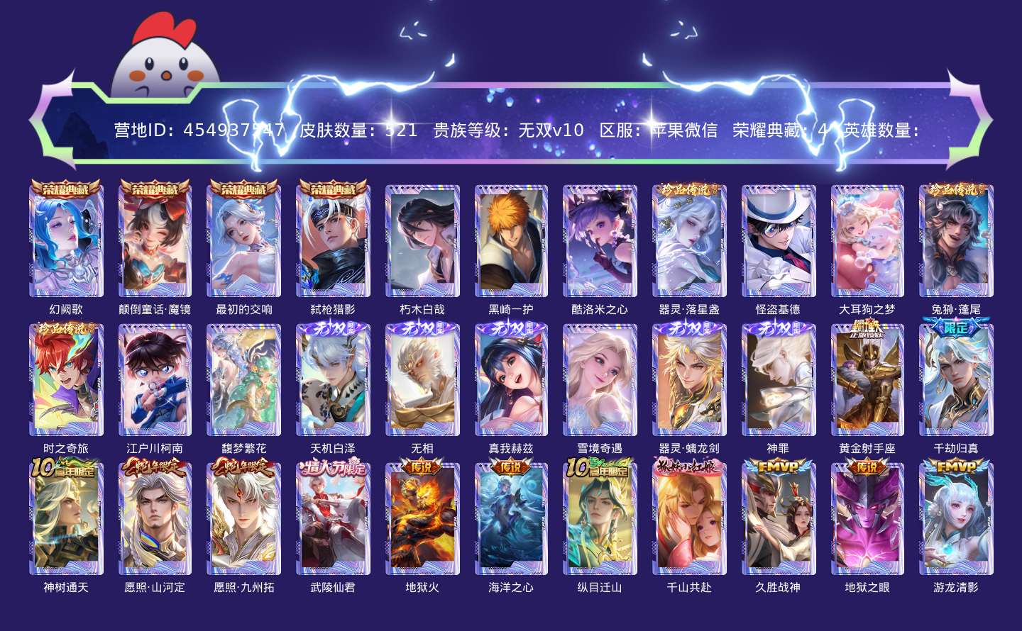 贵族等级:无双v10皮肤数:521生肖限定16 传说品质51 情人节限定3 无双6 珍品传说9 荣耀典藏4 珍品无双1 英雄数:129