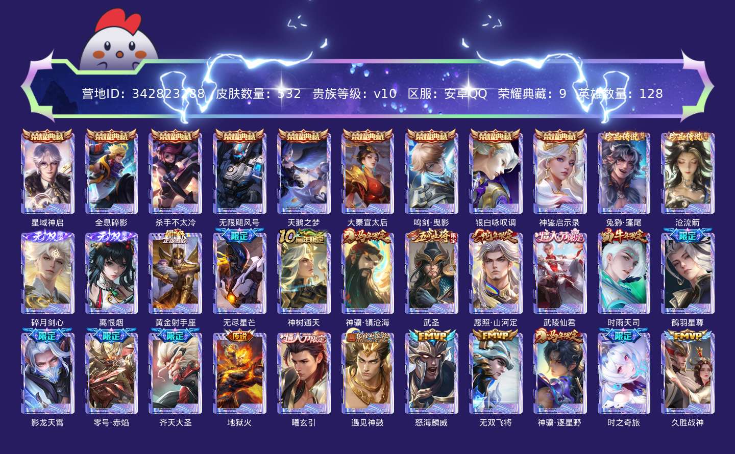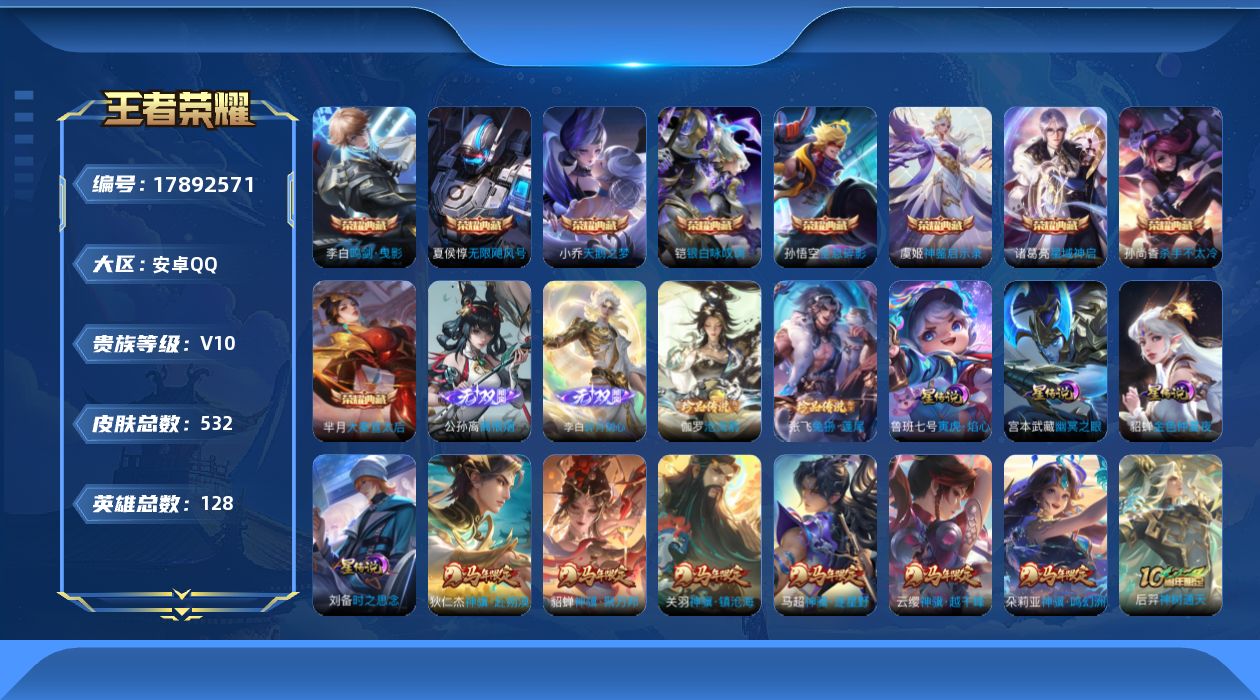 贵族等级:v10皮肤数:532生肖限定29 传说品质66 情人节限定9 荣耀典藏9 无双2 珍品传说2 英雄数:128