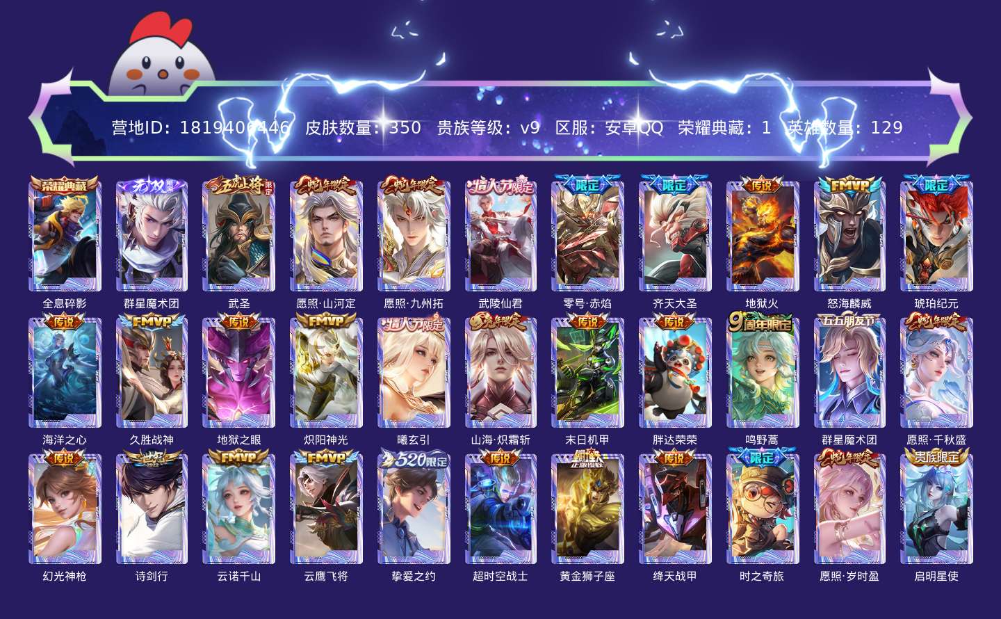 传说品质_关羽_武圣传说品质_司空震_愿照·山河定传说品质_澜_愿照·九州拓传说品质_诸葛亮_武陵仙君传说品质_孙悟空_零号·赤焰传说品质_孙悟空_齐天大圣传说品质_孙悟空_地狱火传说品质_吕布_怒海麟威传说品质_马超_琥珀纪元传说品质_武则天_海洋之心传说品质_干将莫邪_久胜战神传说品质_宫本武藏_地狱之眼传说品质_镜_炽阳神光传说品质_貂蝉_曦玄引传说品质_李信_山海·炽霜斩传说品质_孙尚香_末日机甲传说品质_梦奇_胖达荣荣传说品质_桑启_鸣野蒿传说品质_云中君_群星魔术团传说品质_女娲_愿照·千秋盛传说品质_云缨_幻光神枪传说品质_李白_诗剑行传说品质_公孙离_云诺千山传说品质_曜_云鹰飞将传说品质_孙策_挚爱之约传说品质_狄仁杰_超时空战士传说品质_达摩_黄金狮子座传说品质_铠_绛天战甲传说品质_鲁班七号_时之奇旅传说品质_虞姬_愿照·岁时盈传说品质_虞姬_启明星使