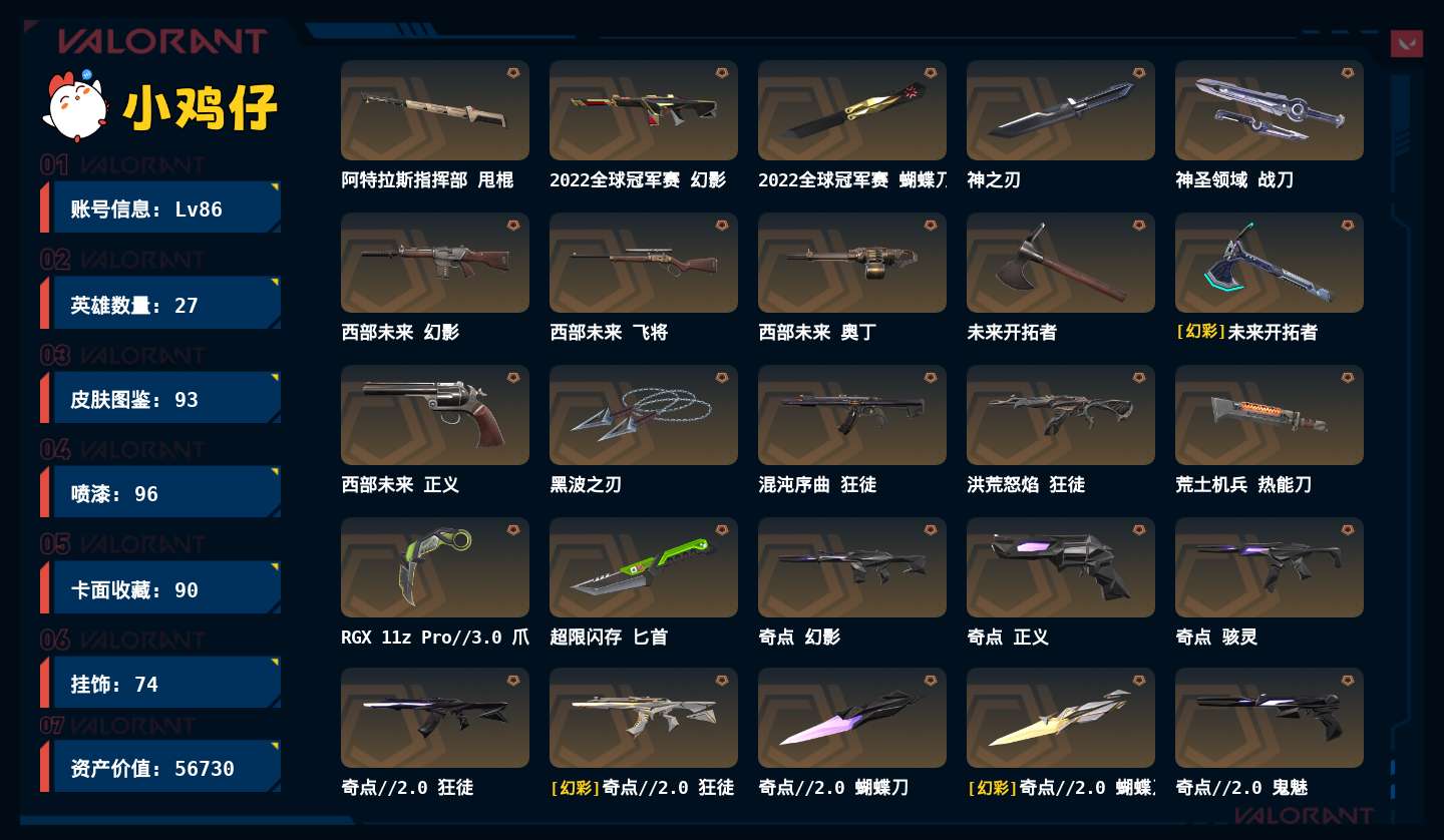 Lv86 英雄27 皮肤93卡面90,喷漆96,挂件74,2022全球冠军赛 礼包套装,神中神罚 礼包套装,西部未来 礼包套装,回火礼包:奇点 礼包套装,奇点//2.0 礼包套装,具体详情看图
