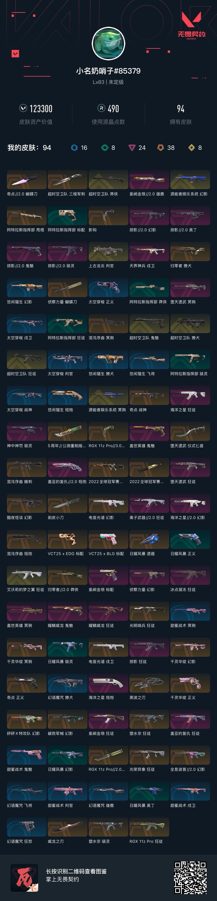Lv83 英雄17 皮肤94卡面59,喷漆53,挂件39,掠影//2.0 礼包套装,超时空卫队 礼包套装,2022全球冠军赛 礼包套装,5周年//公测重制版 礼包套装,回响礼包 // V25 礼包套装,耀鳞威龙套装,具体详情看图