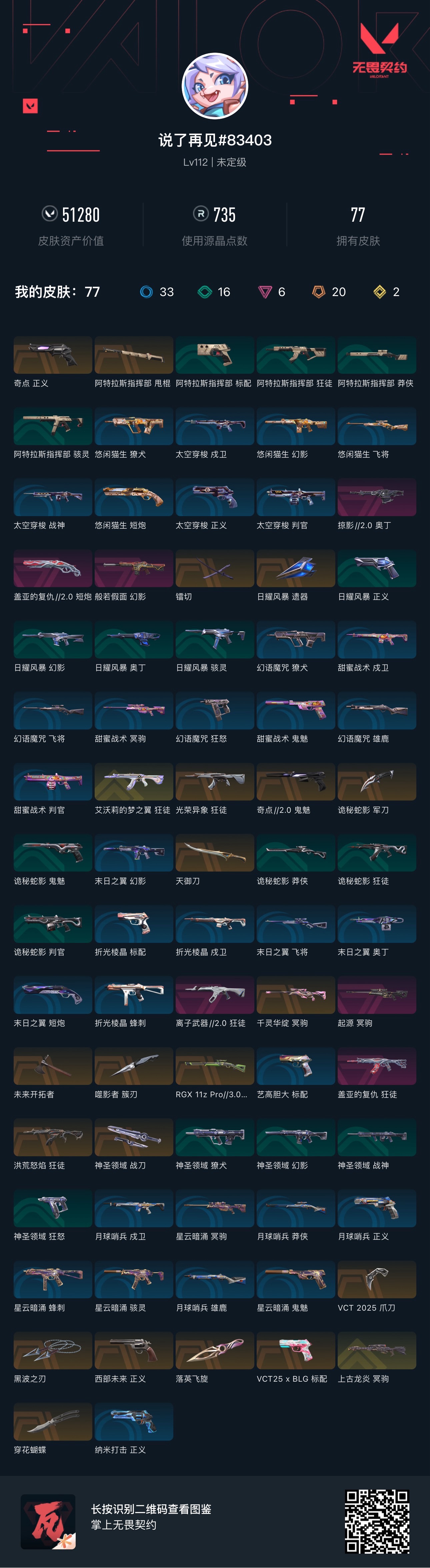 Lv112 英雄26 皮肤77卡面105,喷漆93,挂件73,VCT 2025 赛季 礼包套装,具体详情看图