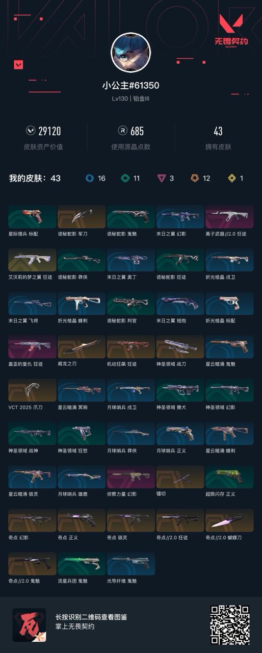 Lv131 铂金III 英雄28 皮肤43卡面77,喷漆61,挂件69,VCT 2025 赛季 礼包套装,回火礼包:奇点 礼包套装,奇点//2.0 礼包套装,具体详情看图