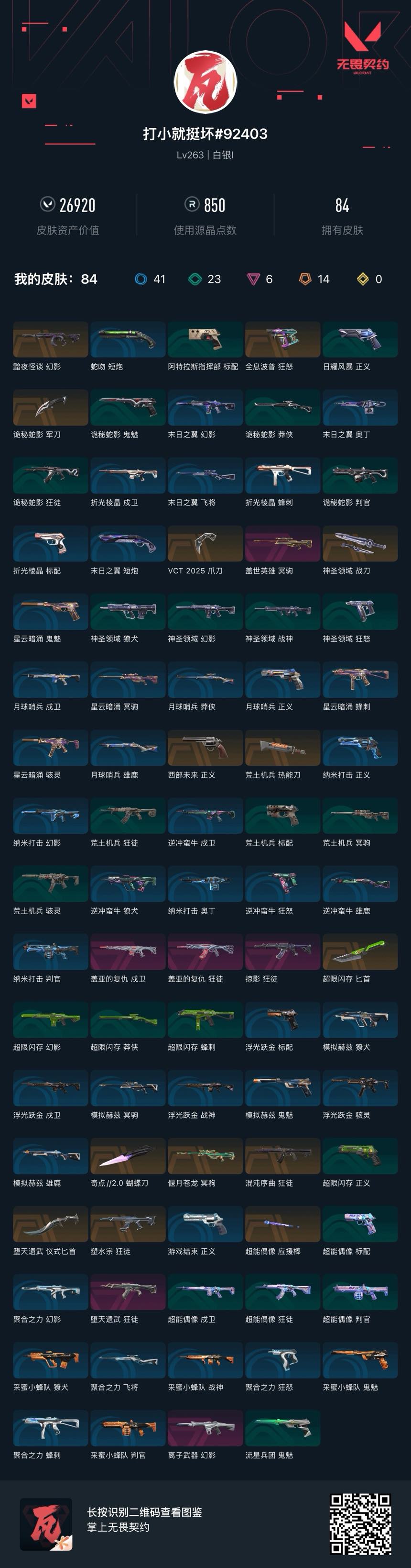 Lv263 白银I 英雄28 皮肤84卡面146,喷漆123,挂件94,VCT 2025 赛季 礼包套装,具体详情看图