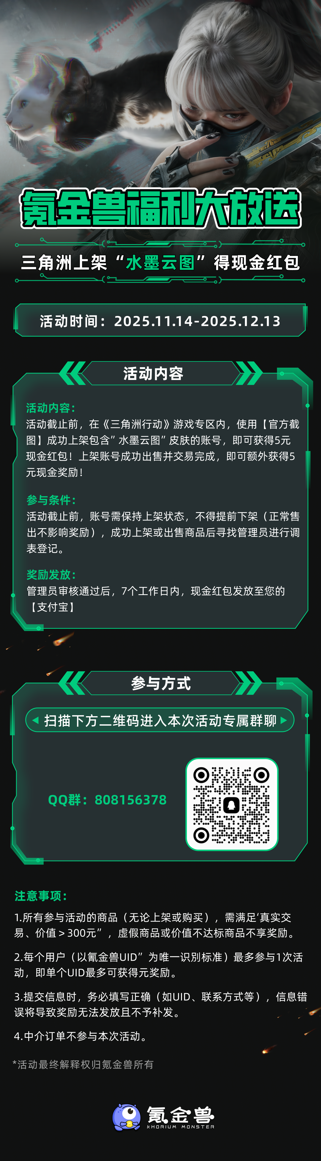 [13582838]三角洲行动,上架“水墨云图”皮肤账号,立得5元红包,成功售出再得5元