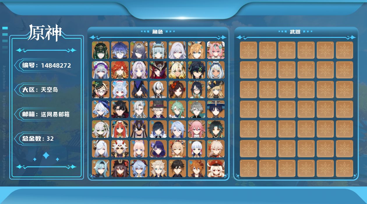 [14848272]邮箱: 送网易邮箱 总黄数: 32 冒险等级: 11 拥有武器: 狼的末路,天空之翼,雾切之回光,飞雷之弦振,四风原典,天空之卷,和璞鸢,昆吾断虹(废弃),阿莫斯之弓,天空之傲,风鹰剑,天空之刃,尘世之锁,无工之剑,贯虹之槊,斫峰之刃,天空之脊,磐岩结绿,护摩之杖,松籁响起之时,薙草之稻光,不灭月华,苍古自由之誓,终末嗟叹之诗,冬极白星,息灾,赤角石溃杵,神乐之真意,波乱月白经津,若水,猎人之径,赤沙之杖,圣显之钥,千夜浮梦,图莱杜拉的回忆,裁叶萃光,苇海信标,碧落之珑,最初的大魔术,万世流涌大典,金流监督,静水流涌之辉,裁断,鹤鸣余音,有乐御簾切,赤月之形,赦罪,白雨心弦,柔灯挽歌,冲浪时光,山王长牙,岩峰巡歌,星鹫赤羽,焚曜千阳,祭星者之望,寝正月初晴,溢彩心念,香韵奏者,苍耀,支离轮光,纺夜天镜,血染荒城,真语秘匣,黑蚀,黎明破晓之史