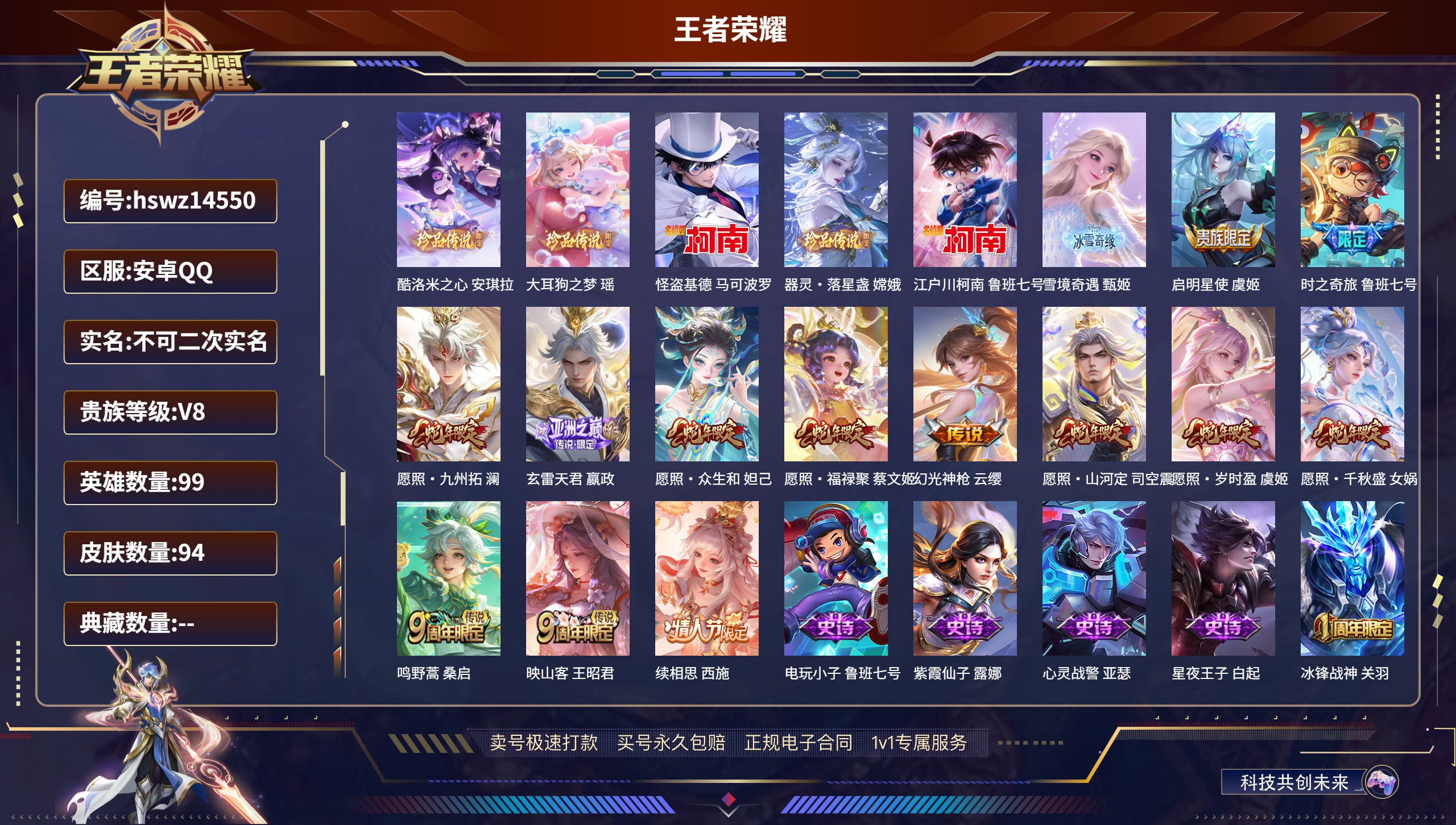 贵族等级:v8皮肤数:277传说品质21 生肖限定4 情人节限定1 荣耀典藏1 无双1 英雄数:121
