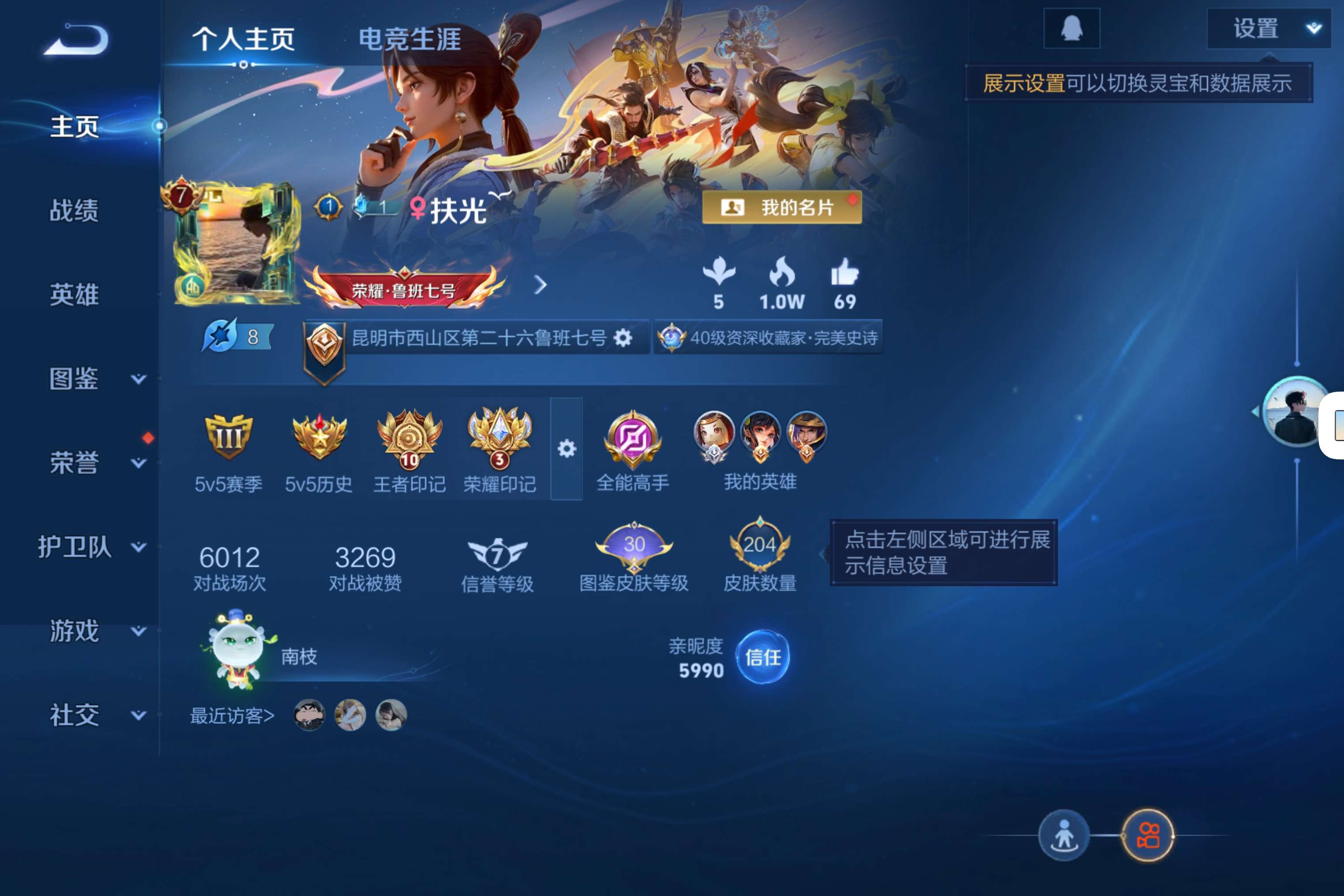 贵族等级:v5皮肤数:98传说品质2 生肖限定1 荣耀典藏1 英雄数:98