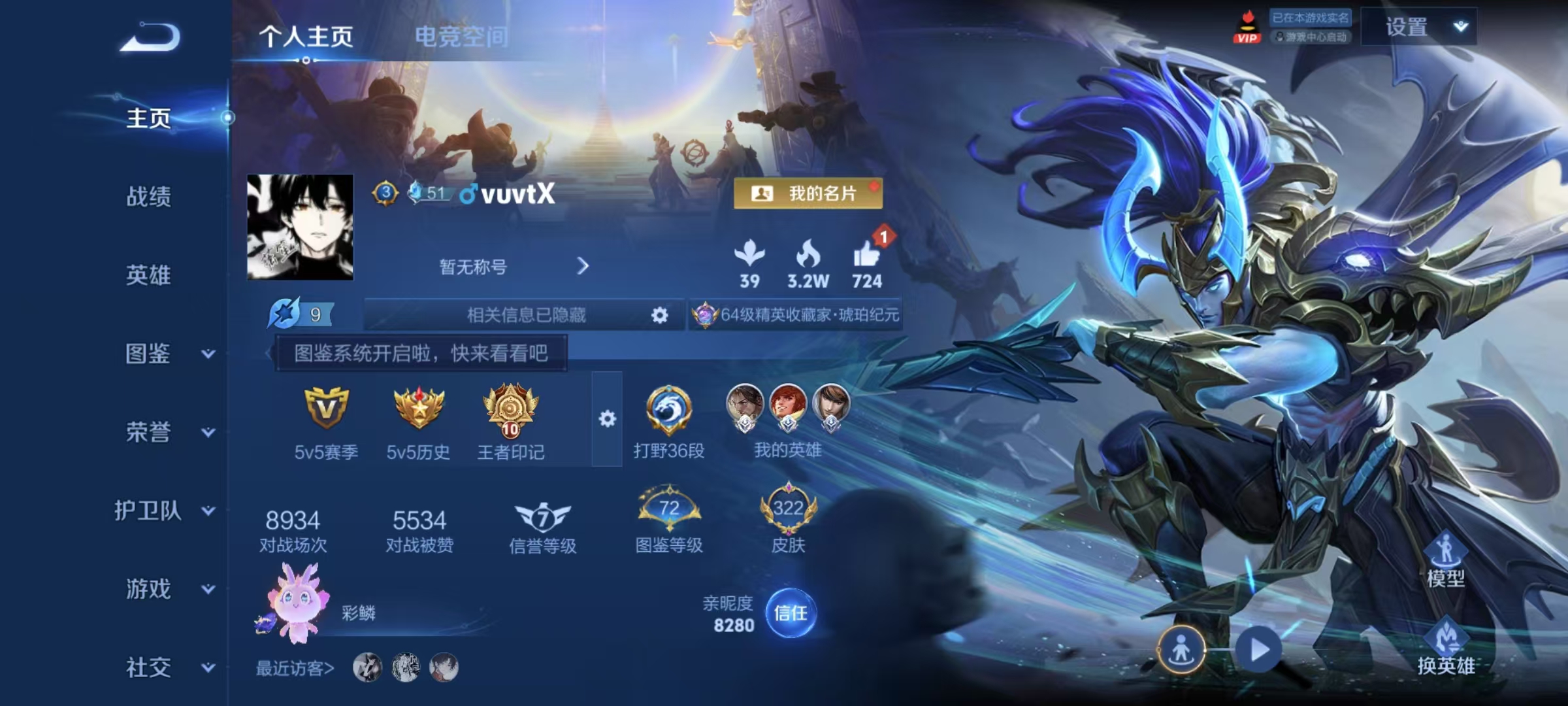 贵族等级:v9皮肤数:389传说品质38 情人节限定3 生肖限定13 荣耀典藏1 英雄数:123