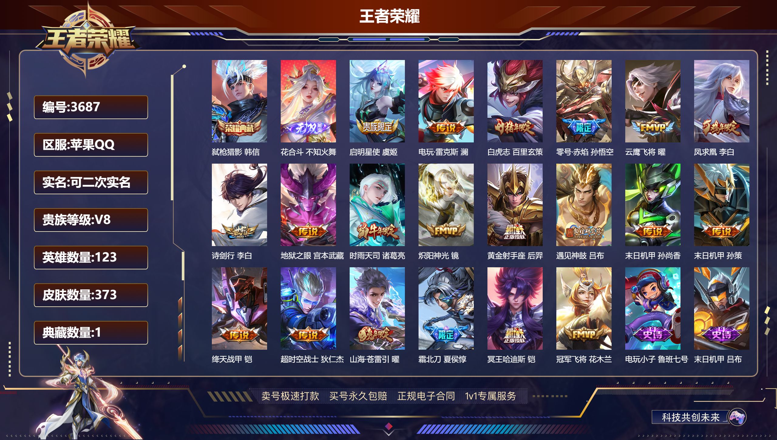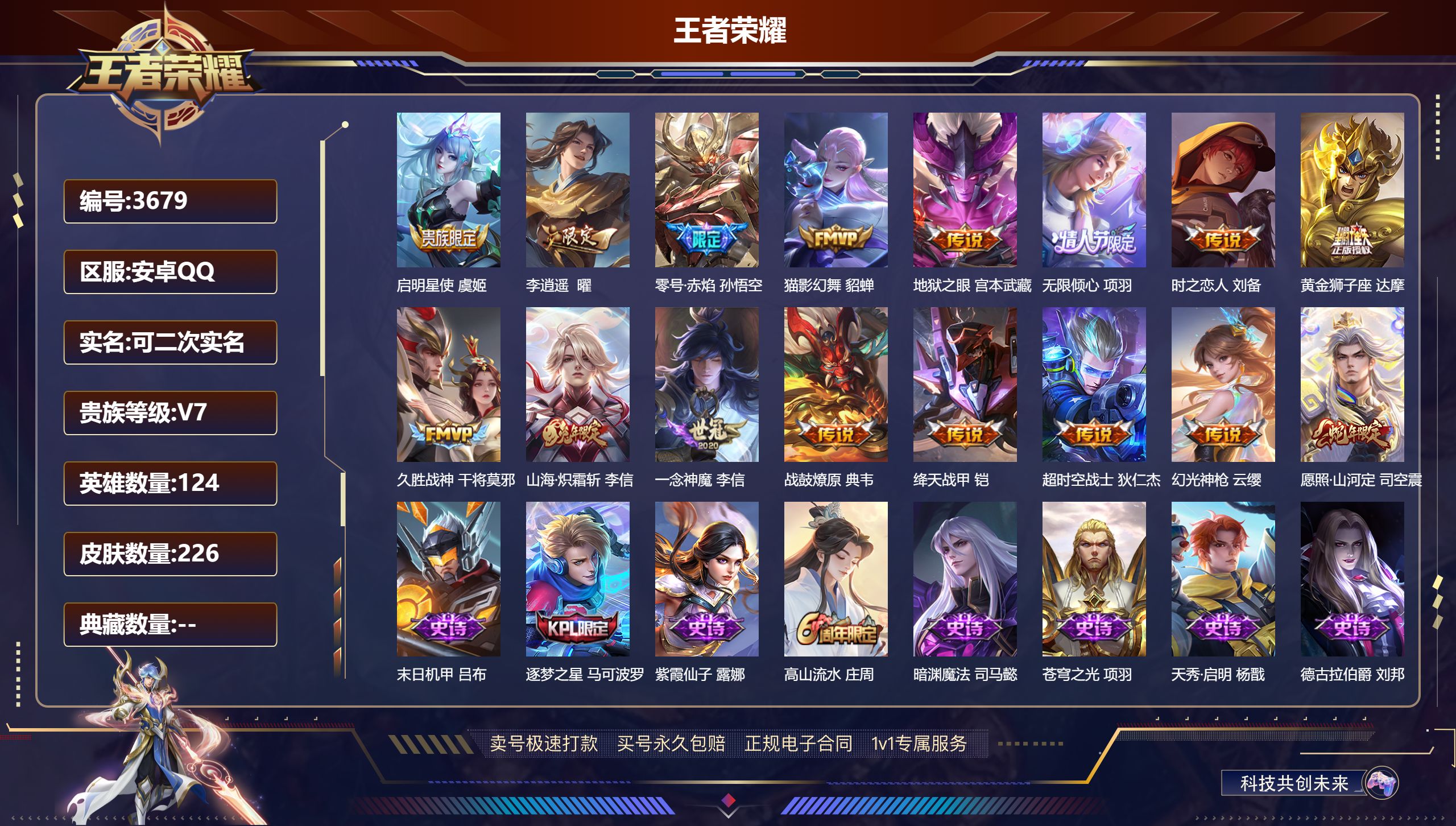 贵族等级:v7皮肤数:244传说品质9 生肖限定4 情人节限定1 荣耀典藏1 英雄数:121