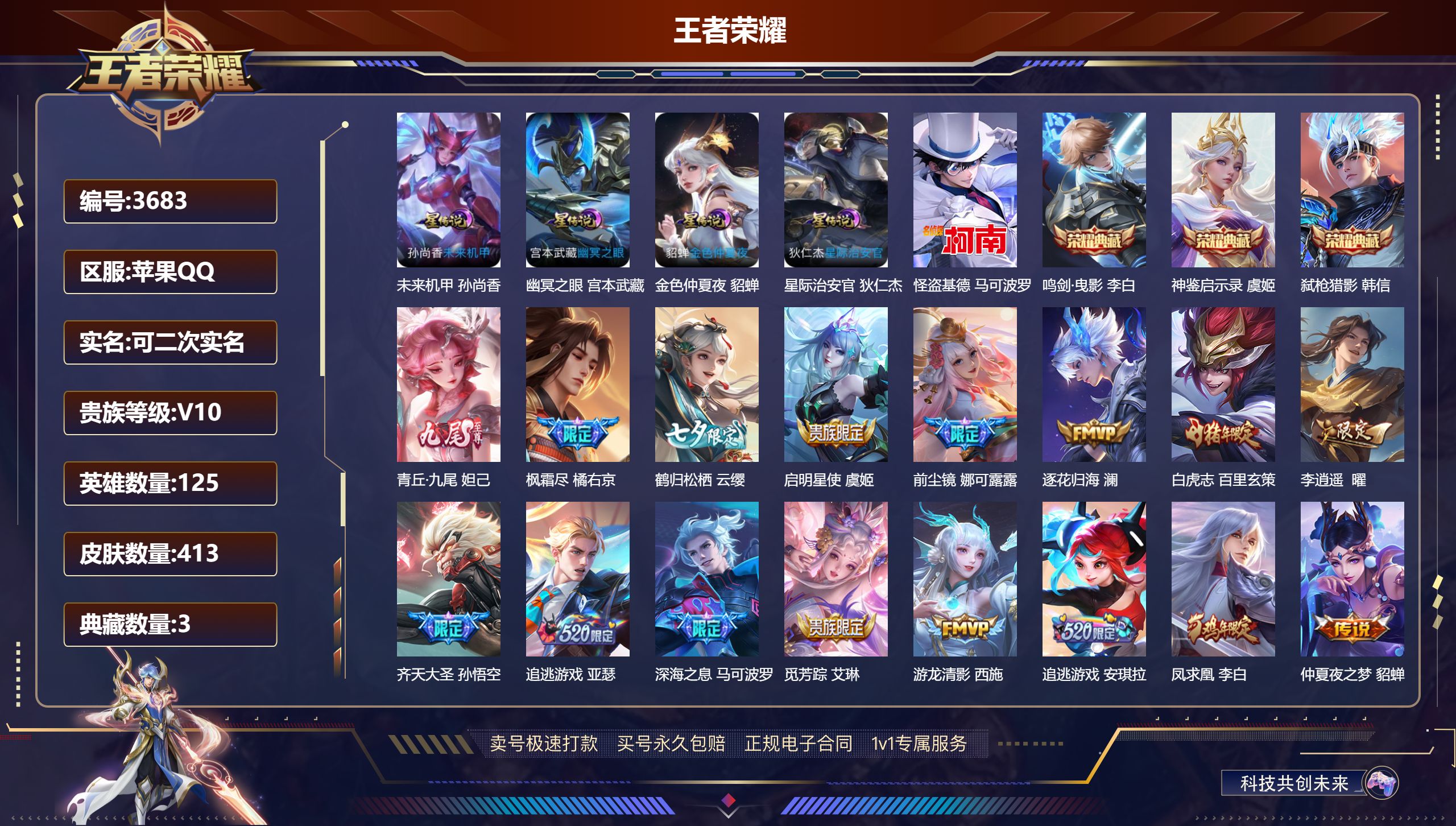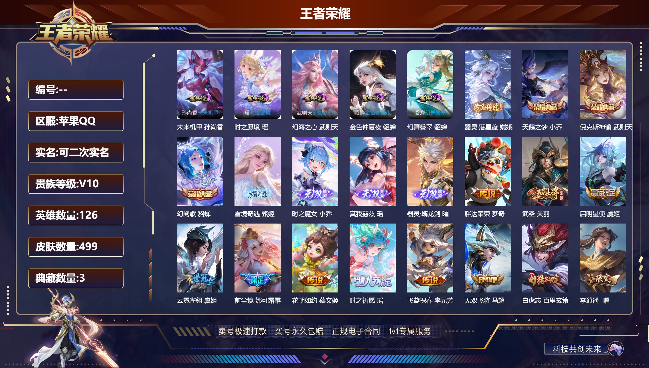 贵族等级:v8皮肤数:285生肖限定4 传说品质11 情人节限定1 荣耀典藏1 英雄数:121