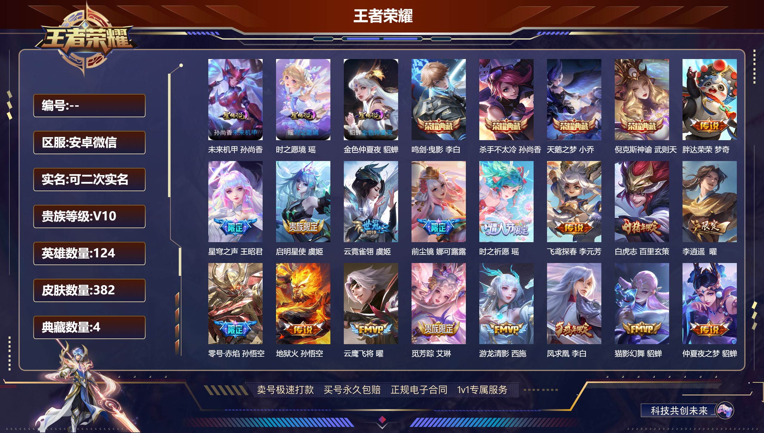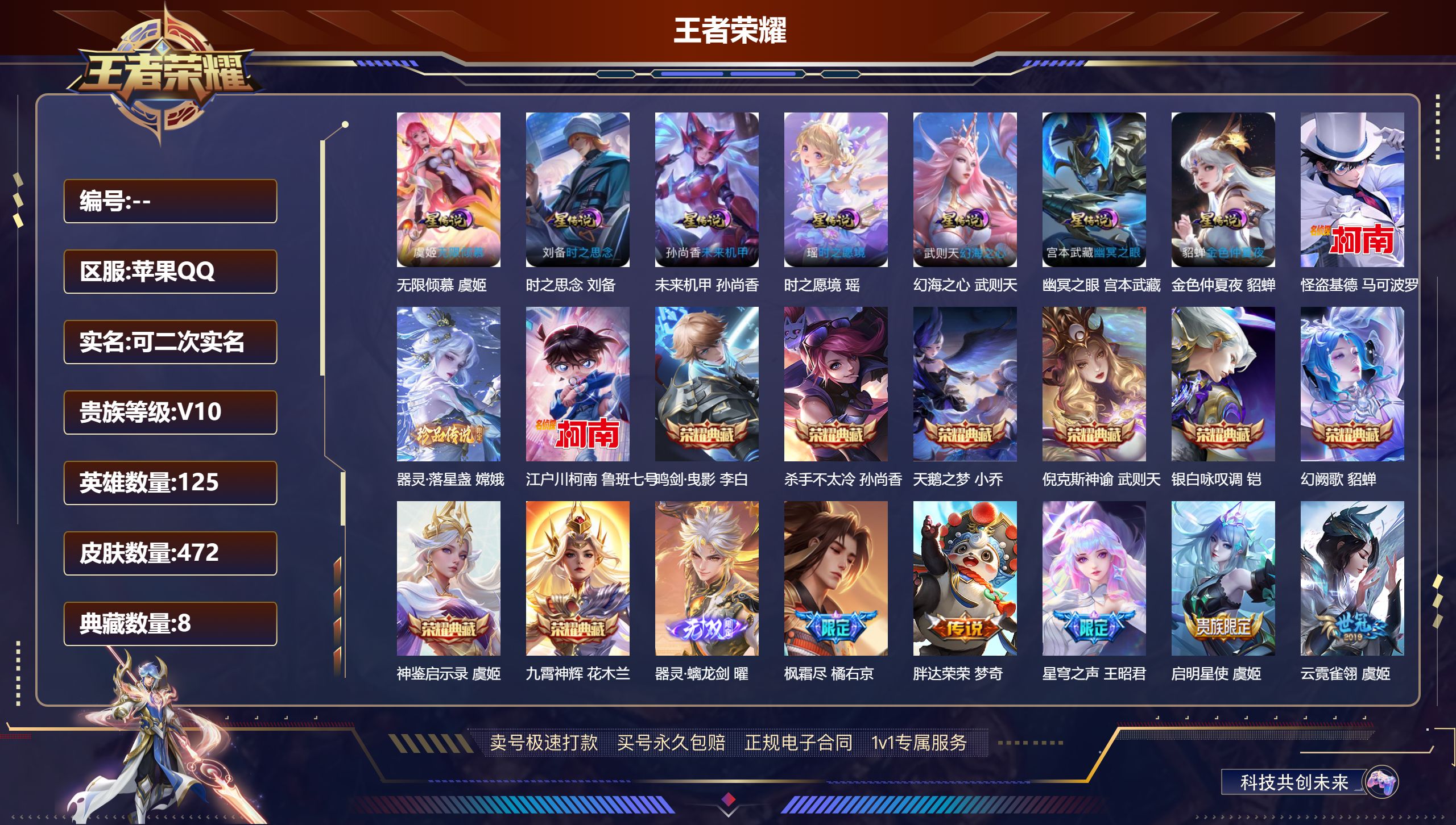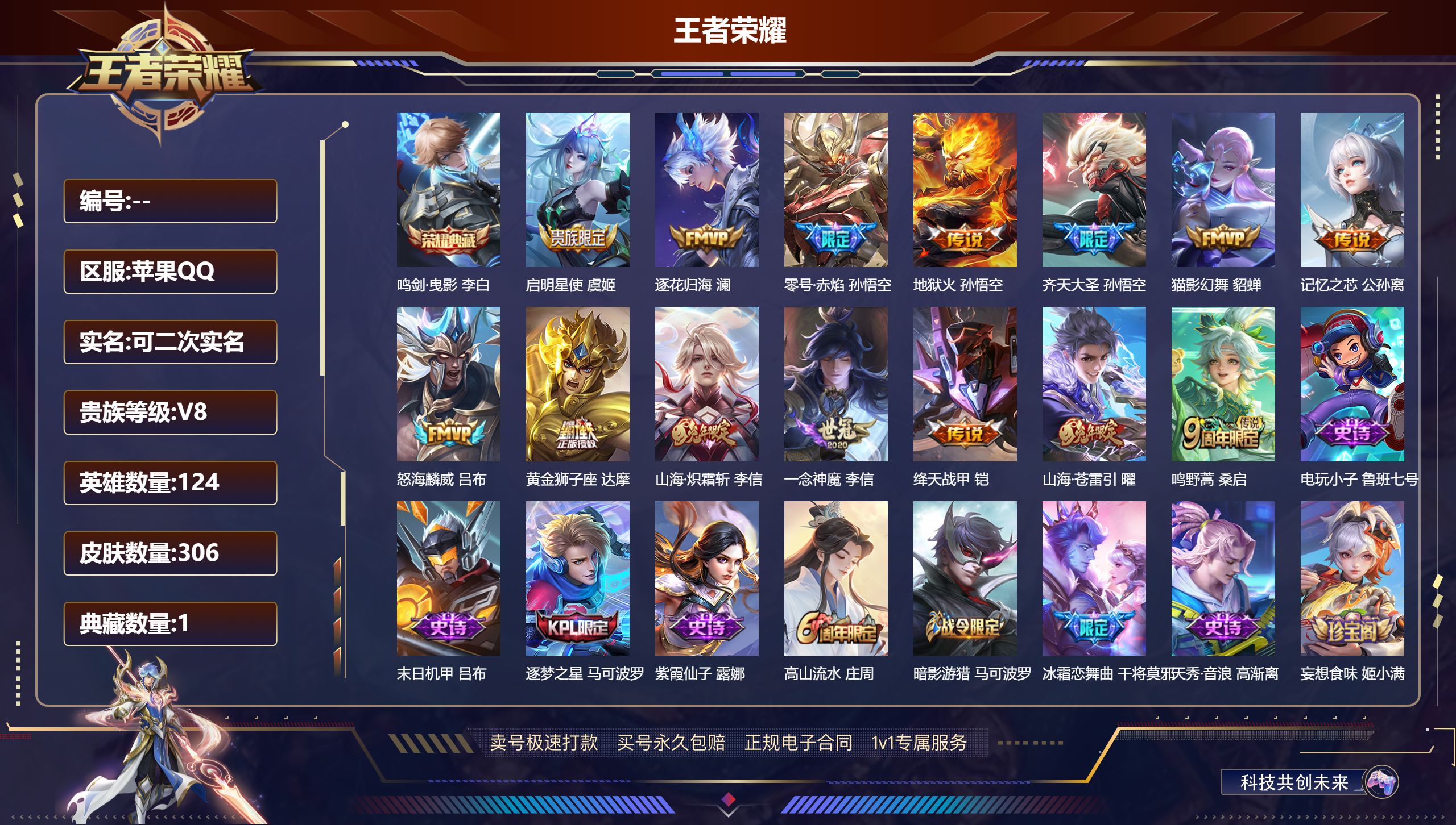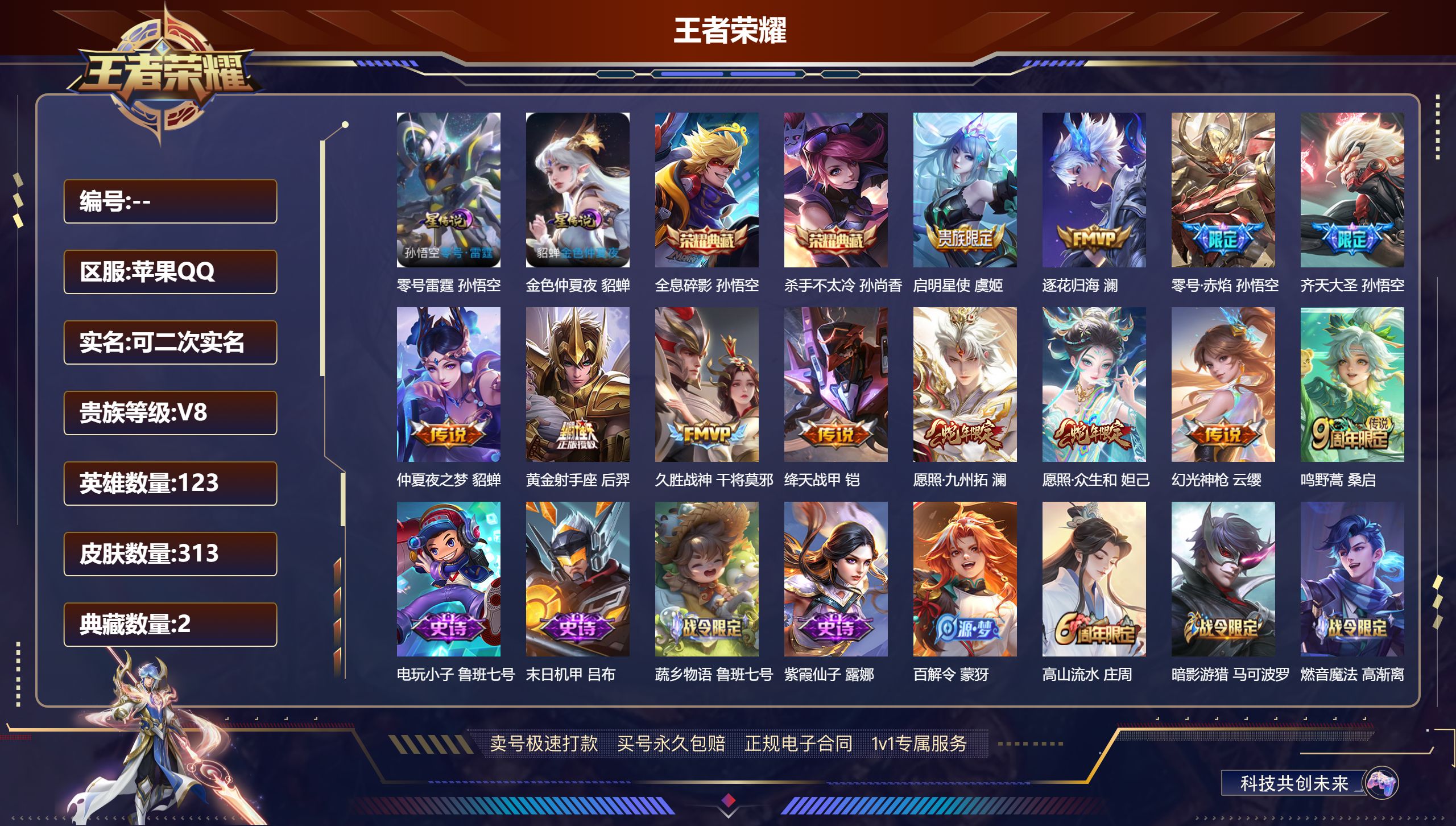 贵族等级:v8皮肤数:133传说品质10 生肖限定4 荣耀典藏1 情人节限定1 英雄数:108