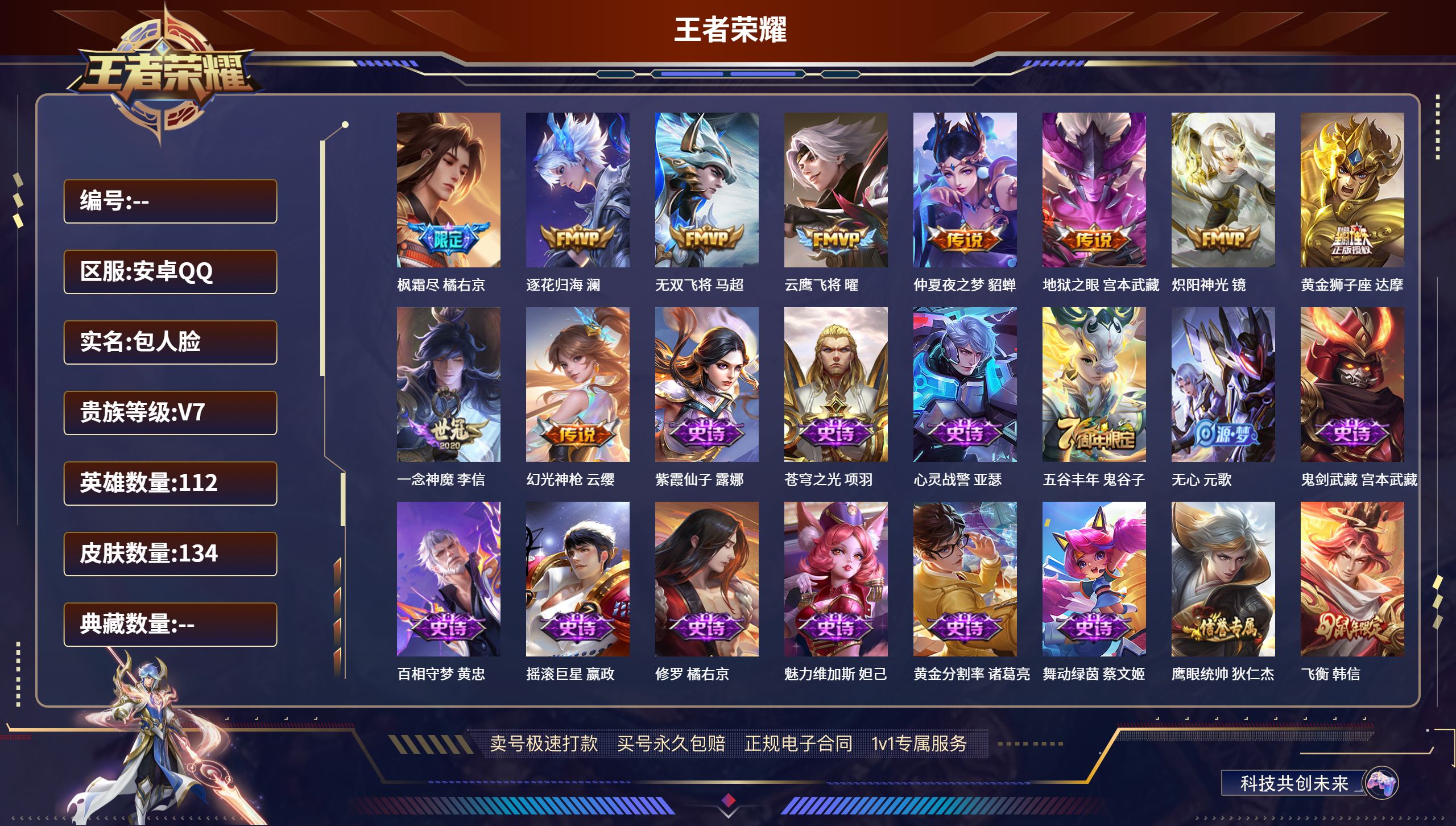 贵族等级:v8皮肤数:134传说品质14 情人节限定1 生肖限定2 荣耀典藏1 英雄数:114