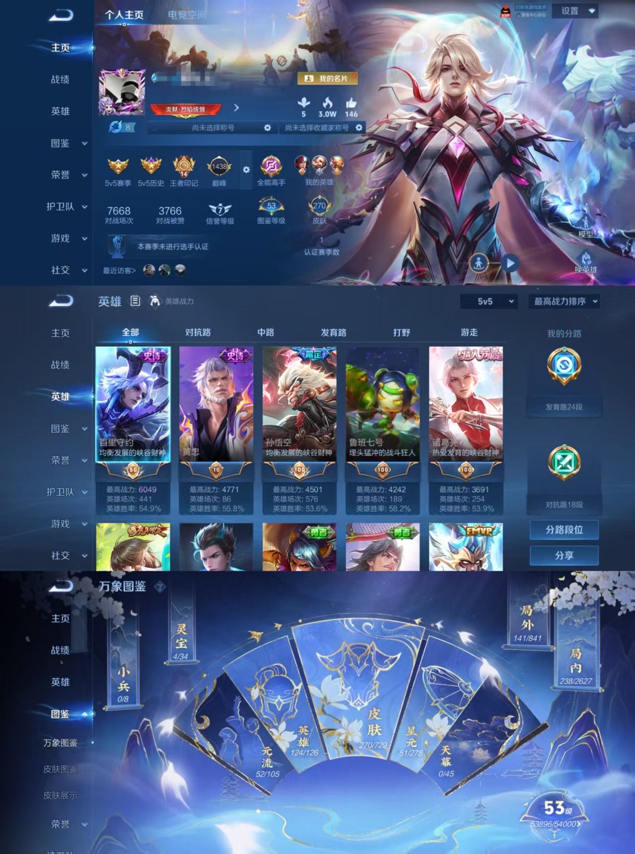 贵族等级:v8皮肤数:231生肖限定4 传说品质13 情人节限定1 荣耀典藏1 英雄数:120