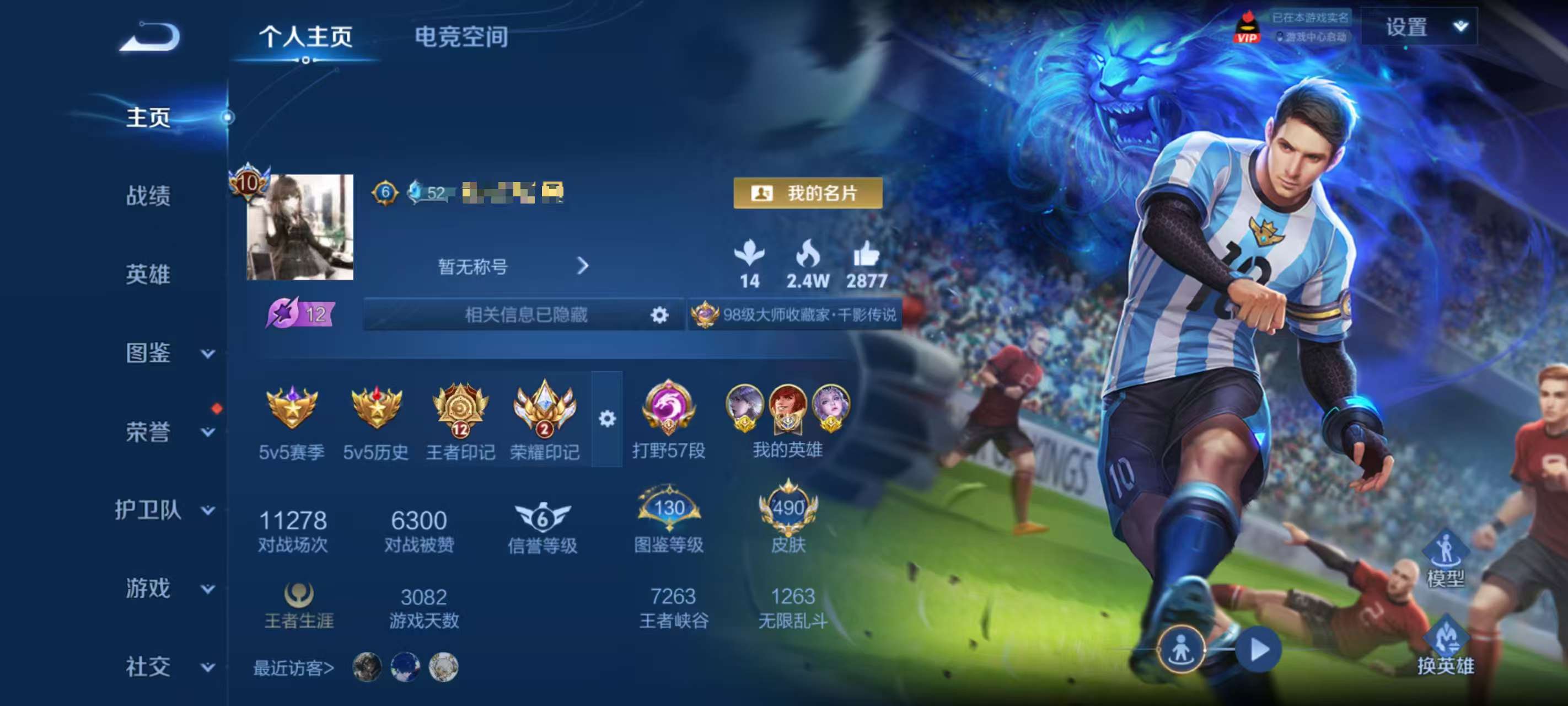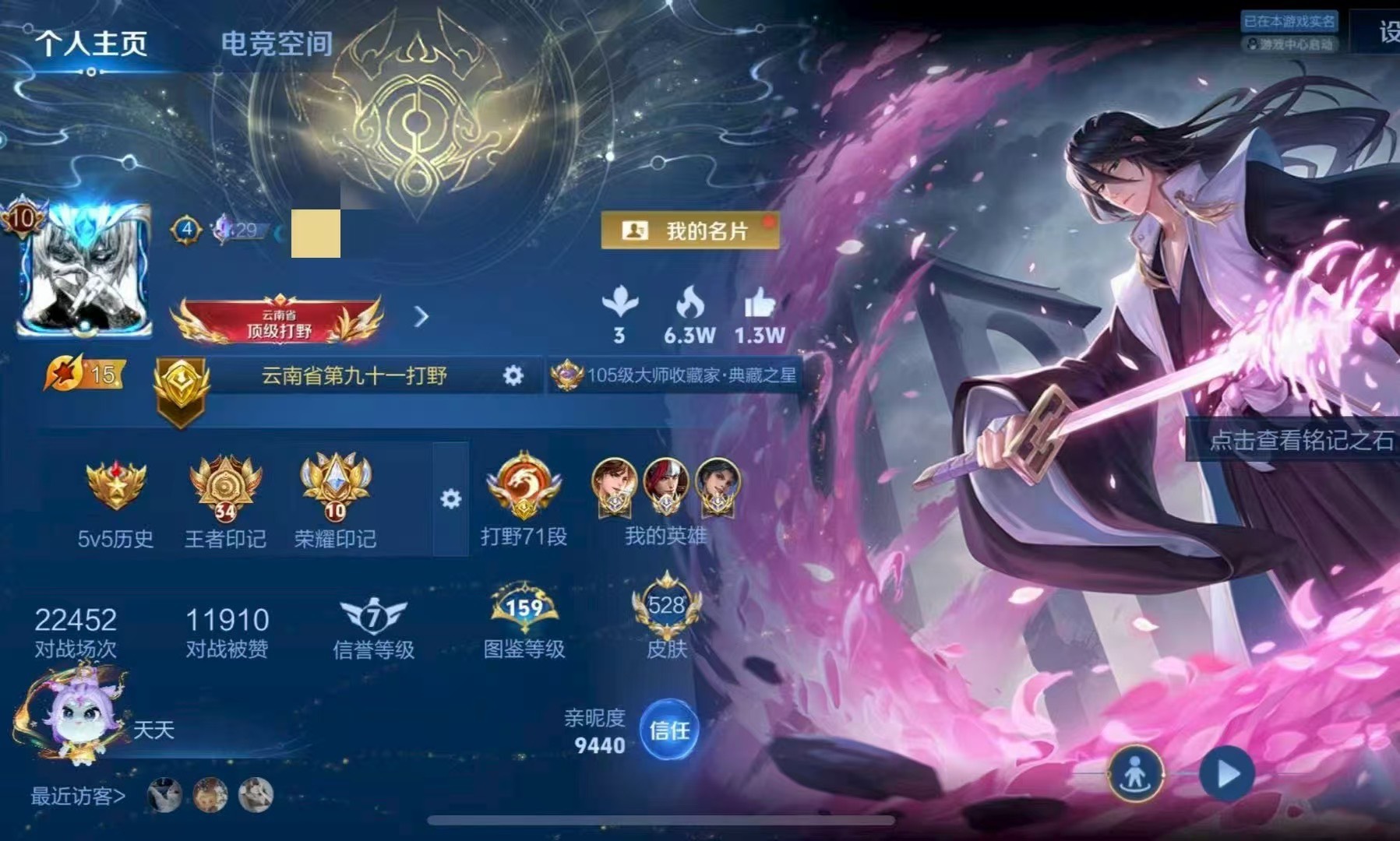 贵族等级:v6皮肤数:144传说品质6 生肖限定2 荣耀典藏1 英雄数:116