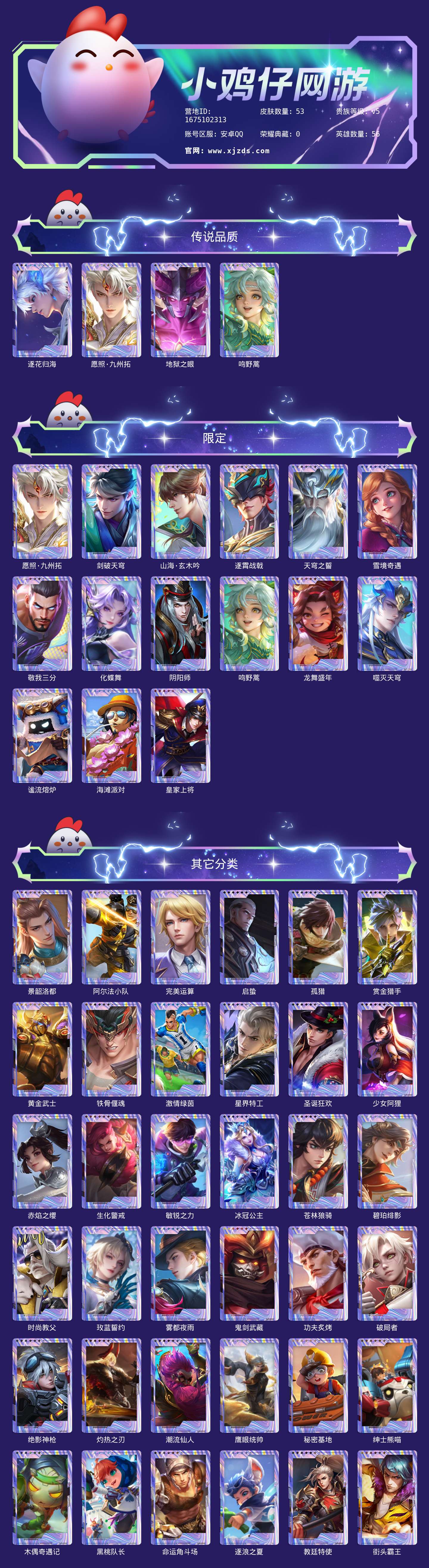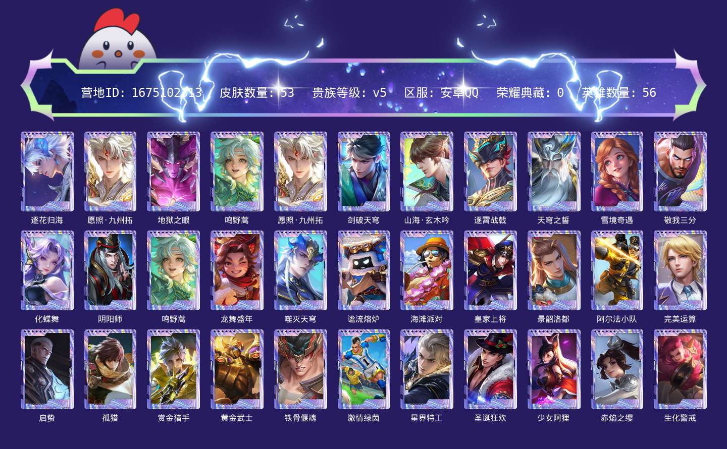 安卓Q-【包人脸】-英雄数量:56-皮肤数量:53-贵族等级:贵族V5-澜愿照·九州拓-逐花归海-山海玄木吟-地狱之眼-桑启鸣野蒿-街头霸王-赏金猎手-逐浪之夏-冰冠公主-鹰眼护卫-绅士熊喵-鬼剑武藏-皇家上将-圣诞狂欢-海滩派对-碧珀绯影-赤焰之缨-启蛰-孤猎-灼热之刃-潮流仙人-激情绿茵-命运角斗场-绝影神枪-生化警戒-木偶奇遇记-秘密基地-阿尔法小队-黄金武士-黑桃队长-教廷特使-阴阳师-时尚教父-敏锐之力-少女阿狸-破局者--营地号:1675102313