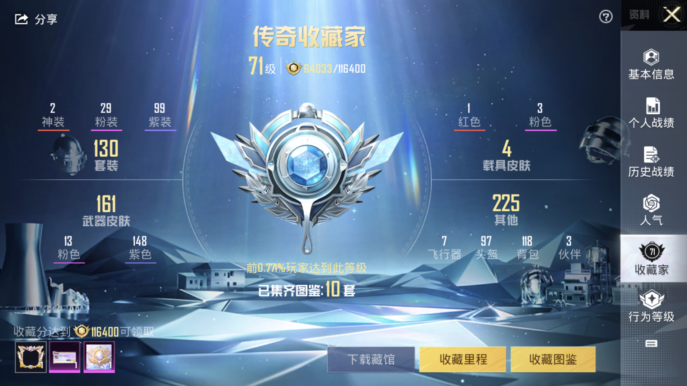 贵族等级:v9皮肤数:309勇者品质107 史诗品质98 战令限定22 限定87 魔法世界3 KPL限定6 永宁纪1 传说品质25 活动专属12 青春校园5 赛季限定13 梦幻童话1 周年限定3 草木风华2 时之奇旅2 CP皮肤8 生肖限定7 地狱火1 新春专属4 古今物语2 源梦皮肤5 归虚梦演5 情人节限定1 五路精神5 末日机甲1 西部大镖客2 五环荣耀2 时之际遇2 超时空小队2 夏日海滩7 蔬菜精灵1 胡桃异想国2 五五朋友节5 敦煌研究院2 荣耀典藏3 神州地方志3 王者之证2 冰雪之歌2 荣耀中国节3 御龙在天2 乐园午夜2 奇趣潮玩3 全民电竞2 FMVP2 至美风华1 冰雪奇缘1 86版西游记1 圣诞颂歌2 琥珀纪元1 百相守梦2 音你2 珍宝阁专属1 顽趣1 贵族限定4 成就限定1 信誉专属1 电玩狂想3 大话西游1 圆桌骑士1 世冠皮肤1 妄想都市1 宇宙歌姬1 美少女战士1 破界1 英雄数:122