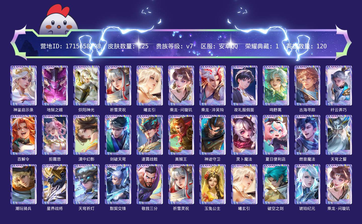 贵族等级:v7皮肤数:127勇者品质57 活动专属9 赛季限定10 限定50 史诗品质47 源梦皮肤3 CP皮肤5 圣诞颂歌1 KPL限定3 生肖限定4 战令限定11 神迹守卫1 蔬菜精灵3 胡桃异想国1 冰雪之歌2 新春专属1 奇趣潮玩2 西部大镖客1 王者之证1 星界纪事1 传说品质8 夏日海滩5 青春校园2 五五朋友节3 情人节限定2 FMVP1 天文志(牛年限定)1 86版西游记1 琥珀纪元1 时之际遇1 五路精神1 贵族限定3 成就限定1 信誉专属1 美少女战士1 电玩狂想1 周年限定2 草木风华1 大话西游1 荣耀中国节1 五环荣耀2 战队赛限定1 荣耀典藏1 百相守梦1 太空漫游1 妄想都市2 珍宝阁专属1 英雄数:120