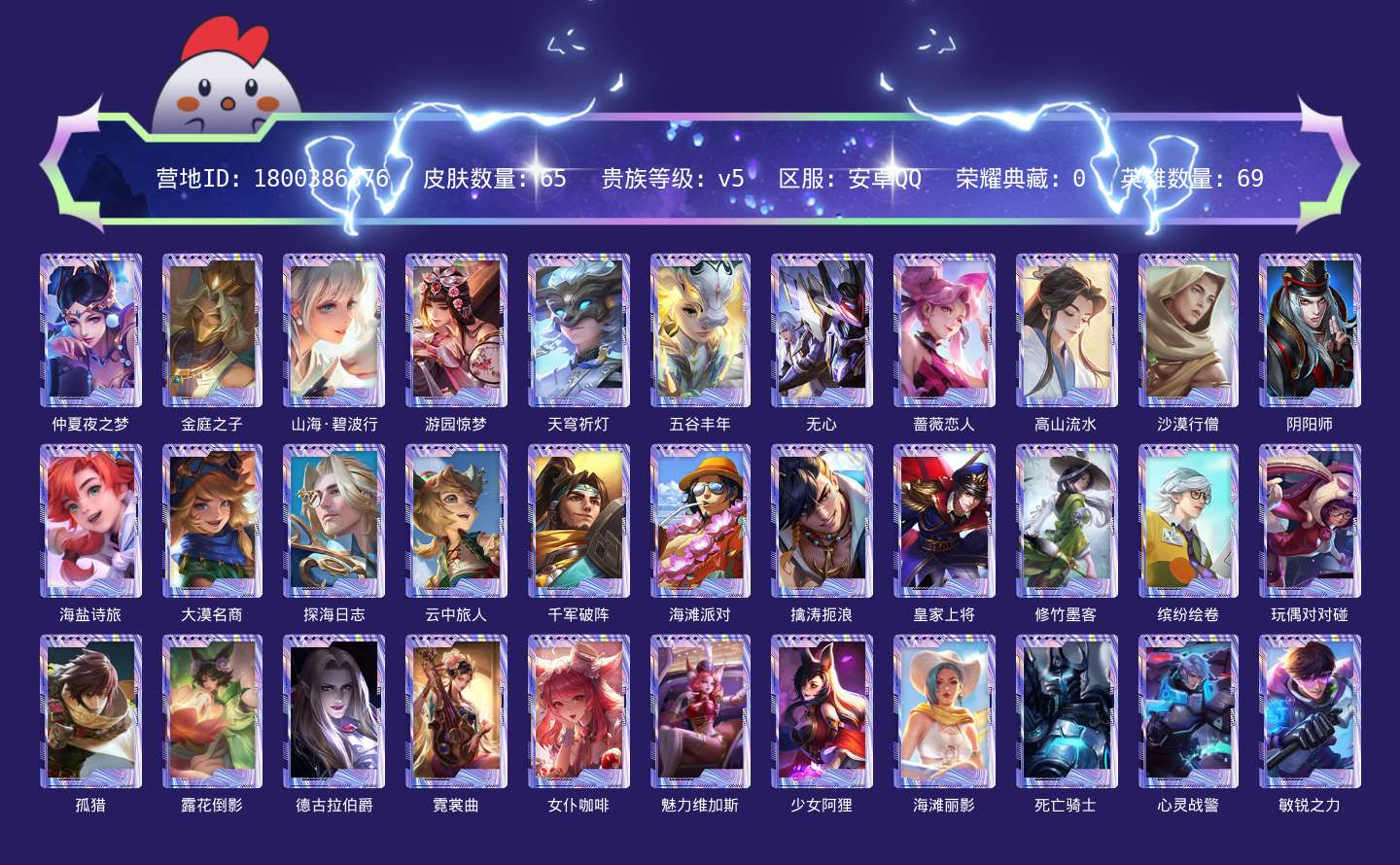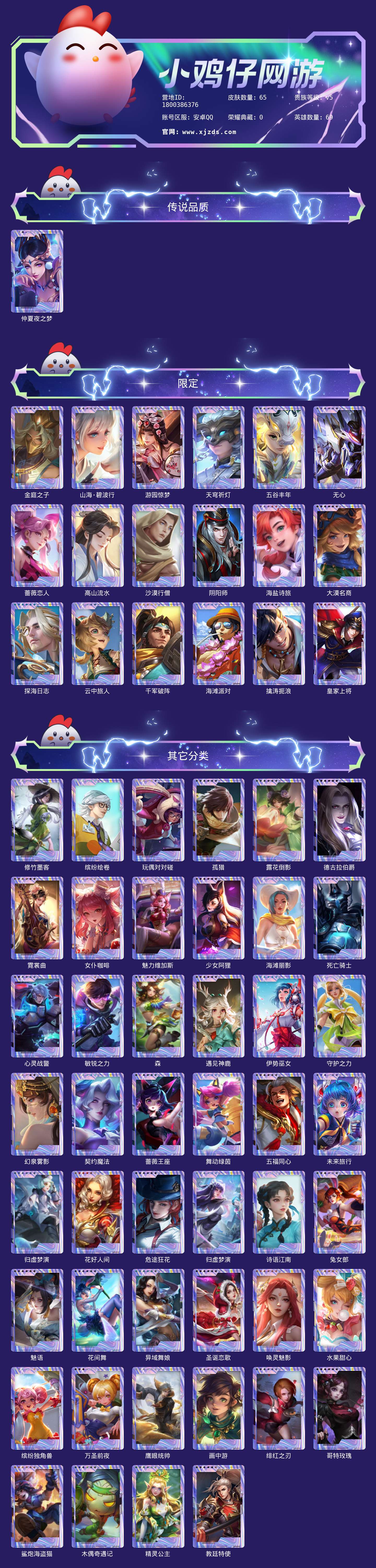 贵族等级:v5皮肤数:65生肖限定1 传说品质1 英雄数:69