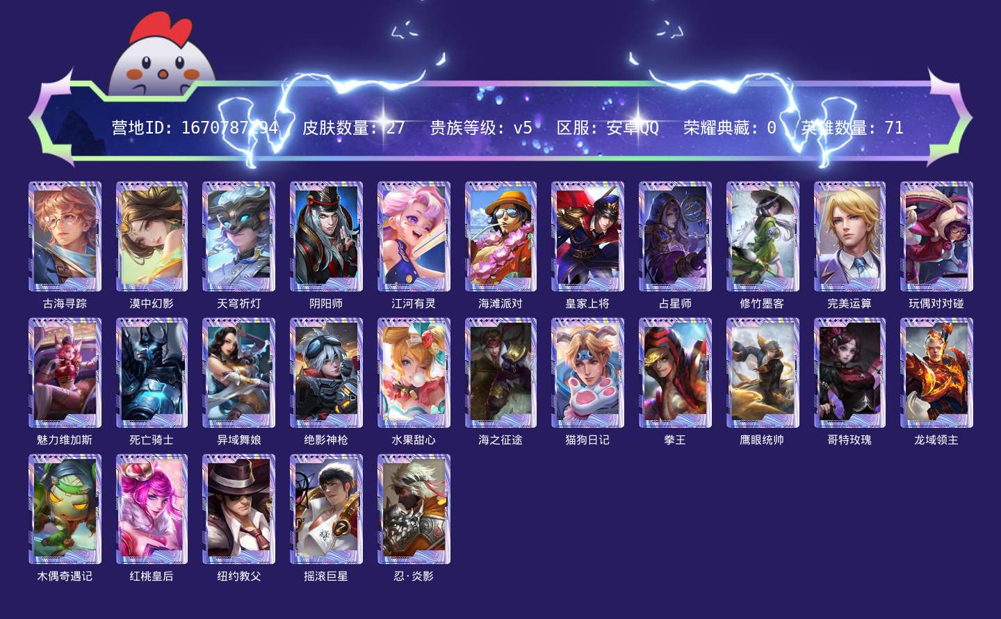安卓Q-【包人脸】-英雄数量:71-皮肤数量:26-贵族等级:贵族V5-猫狗日记男-摇滚巨星-鹰眼护卫-水果甜心-魅力维加斯-皇家上将-忍炎影-海滩派对-占星师-异域舞娘-海之征途-绝影神枪-龙域领主-木偶奇遇记-修竹墨客-纽约教父-死亡骑士-拳王-阴阳师-红桃皇后-玩偶对对碰-江河有灵-古海寻踪--营地号:1670787294