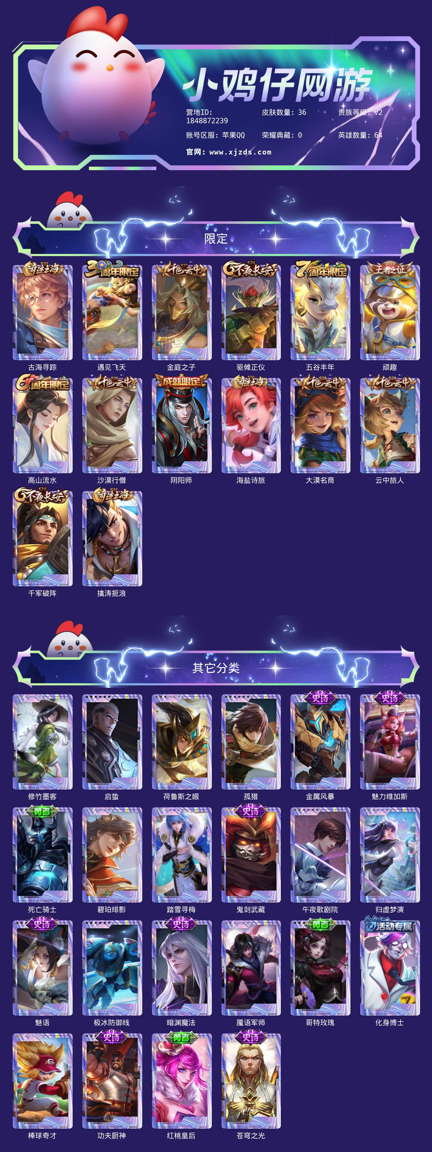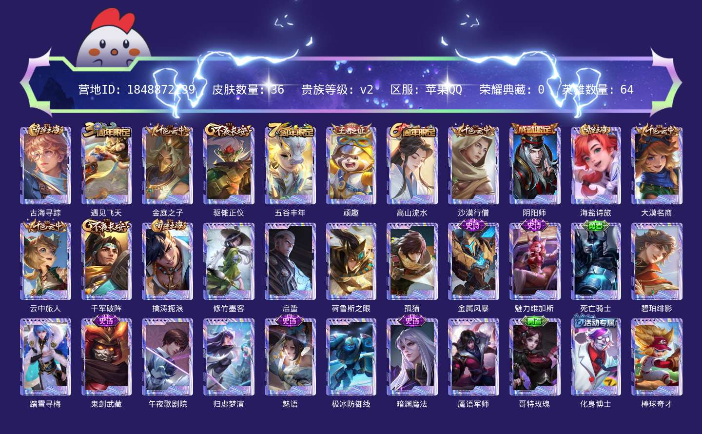 苹果Q-【包人脸】-英雄数量:64-皮肤数量:35-贵族等级:贵族V2-暗渊魔法-魅语-苍穹之光-顽趣梦奇-五谷丰年-高山流水-遇见飞天-功夫厨神-鬼剑武藏-魅力维加斯-金属风暴-碧珀绯影-启蛰-孤猎-魇语军师-极冰防御线-荷鲁斯之眼-棒球奇才-踏雪寻梅-午夜歌剧院-修竹墨客-海盐诗旅-云中旅人-大漠名商-金庭之子-沙漠行僧-千军破阵-驱傩正仪-归虚梦演西施-死亡骑士-阴阳师-哥特玫瑰-化身博士-古海寻踪-擒涛扼浪--营地号:1848872239
