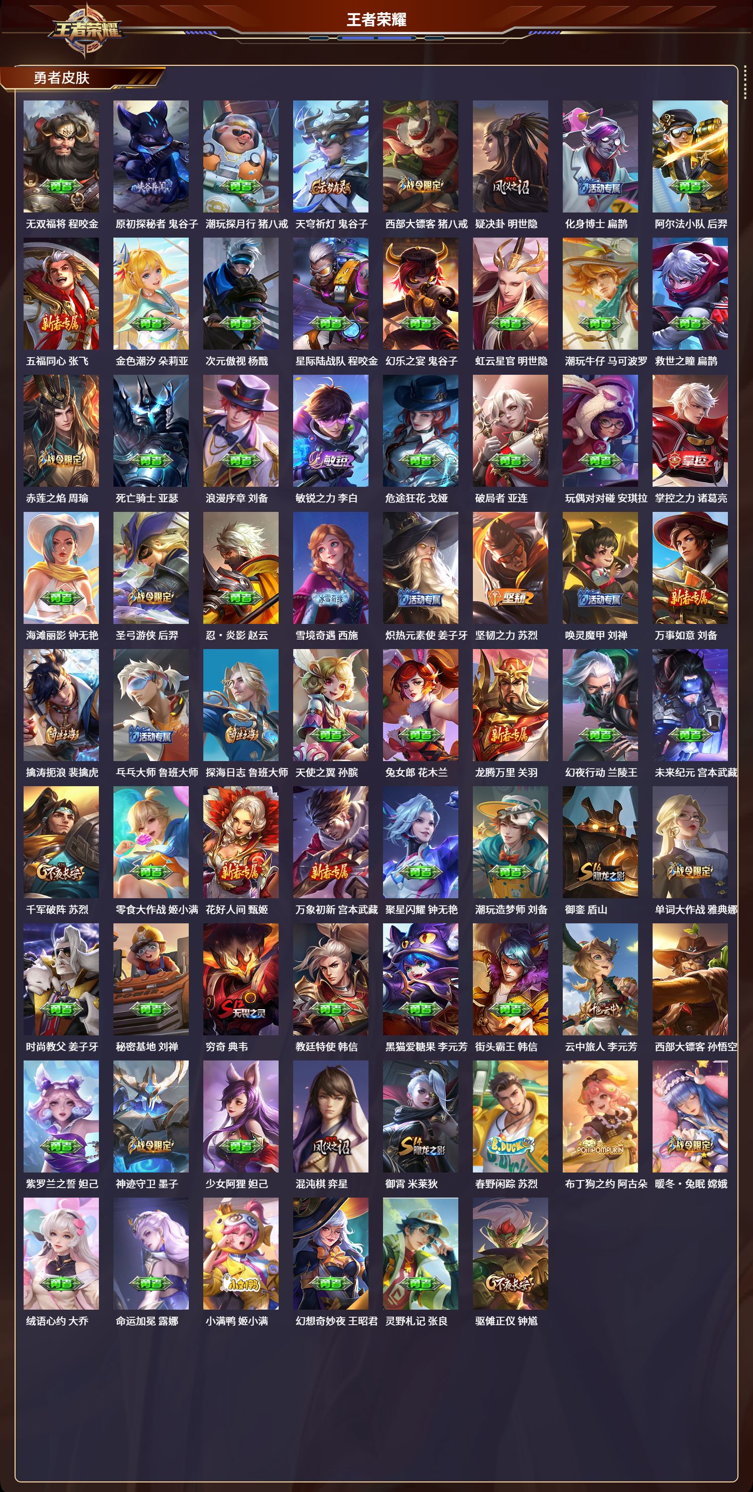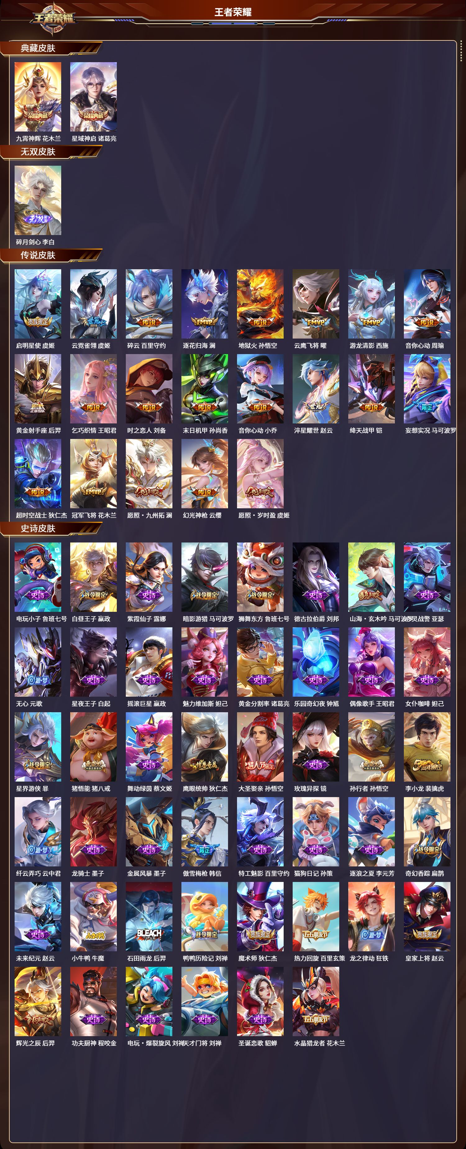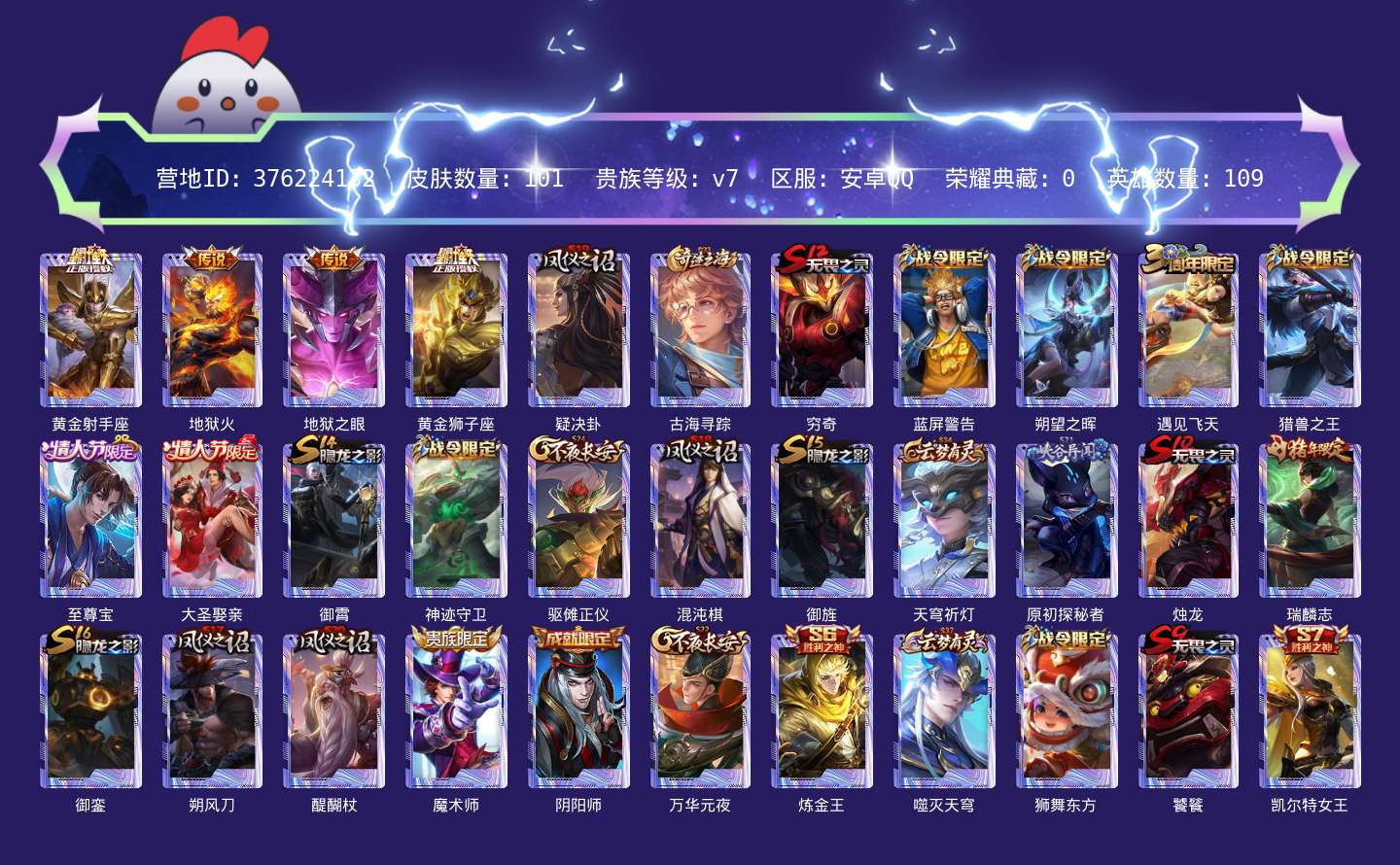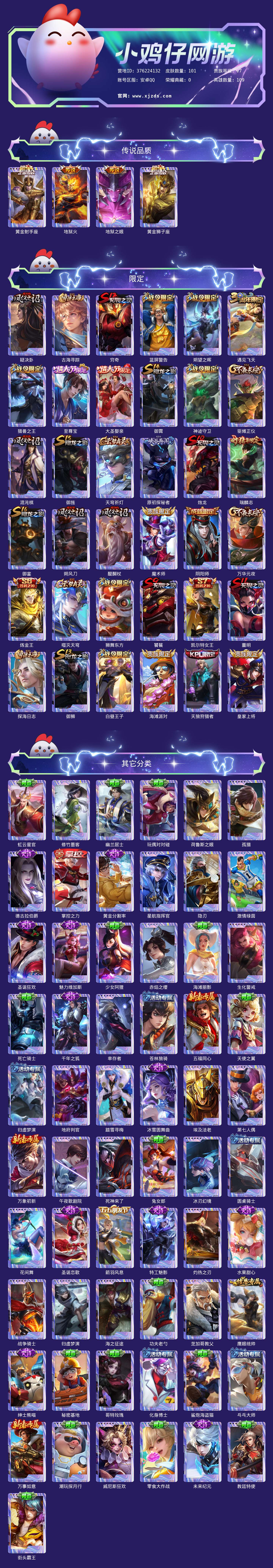 贵族等级:v7皮肤数:101传说品质4 情人节限定2 生肖限定1 英雄数:109