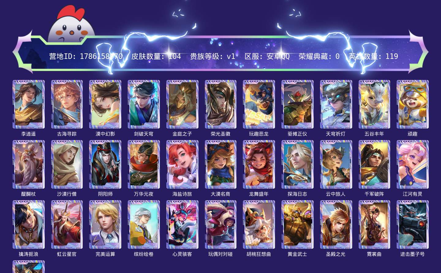 安卓Q-【包人脸】-英雄数量:119-皮肤数量:104-贵族等级:贵族V1-玩趣恶龙-电玩·爆裂旋风-特工战影-街头霸王-心灵骇客-圣诞恋歌-顽趣梦奇-五谷丰年-冰冠公主-冰雪圆舞曲-末日机甲男-鹰眼护卫-星夜王子-水果甜心-鬼剑武藏-魅力维加斯-暗隐猎兽者-圣诞狂欢-未来纪元赵云-金属风暴-地狱岩魂-沉稳之力-救世之瞳-白执事-忍炎影-炽热元素使-圣殿之光-霓裳曲-加勒比小姐-特种部队-未来纪元宫本武藏-西部大镖客牛魔-西部大镖客孙悟空-精灵公主-异域舞娘-潮流仙人-帝国元帅-激情绿茵-海之征途-花见巫女-森-精准探案法-命运角斗场-蔷薇王座-龙域领主-芝加哥教父-福禄兄弟-唤灵魔甲-潮玩探月行-程咬金群星魔术团-海盐诗旅-潮玩造梦师-云中旅人-蔚蓝守将-胡桃狂想曲--营地号:1786158970