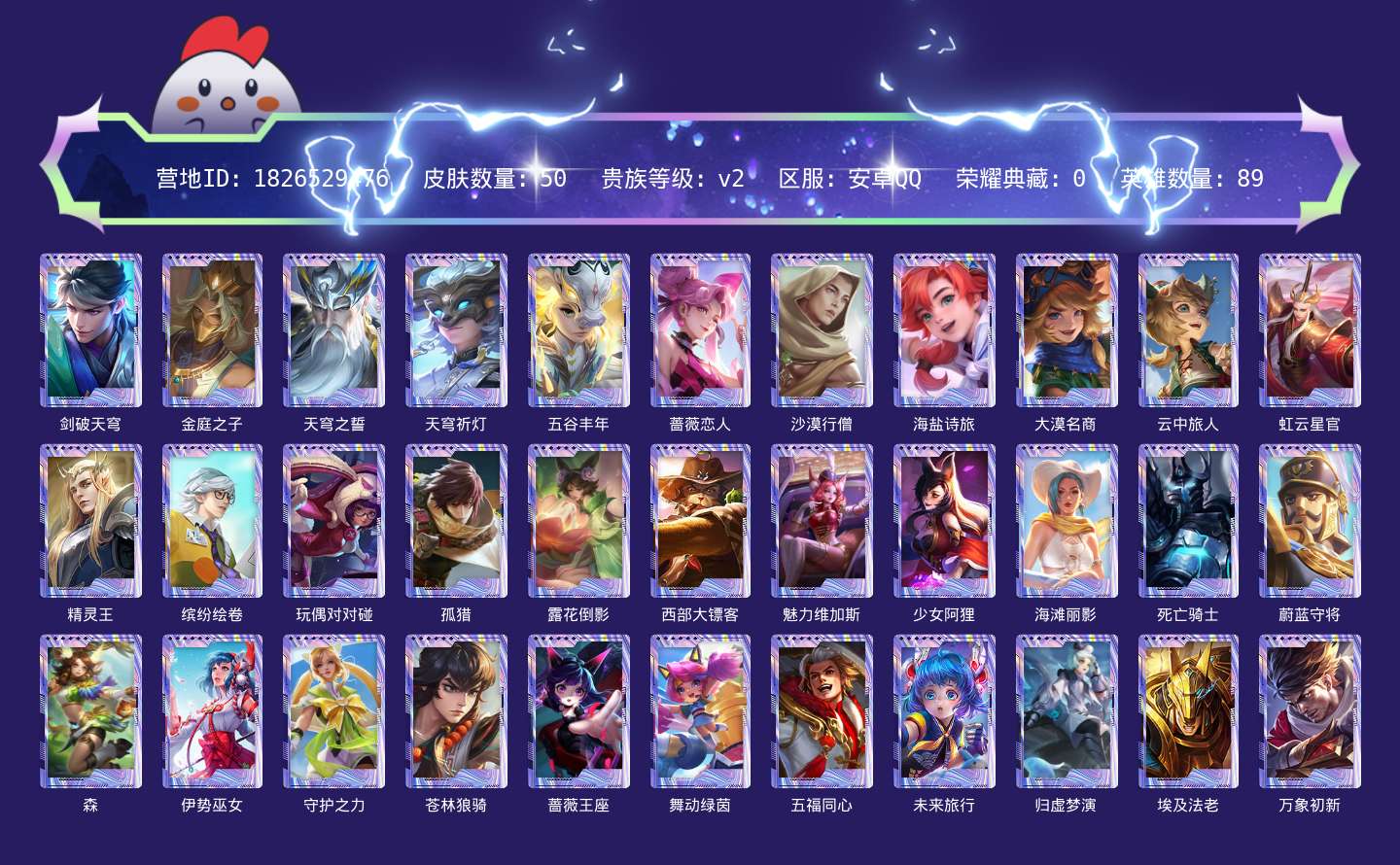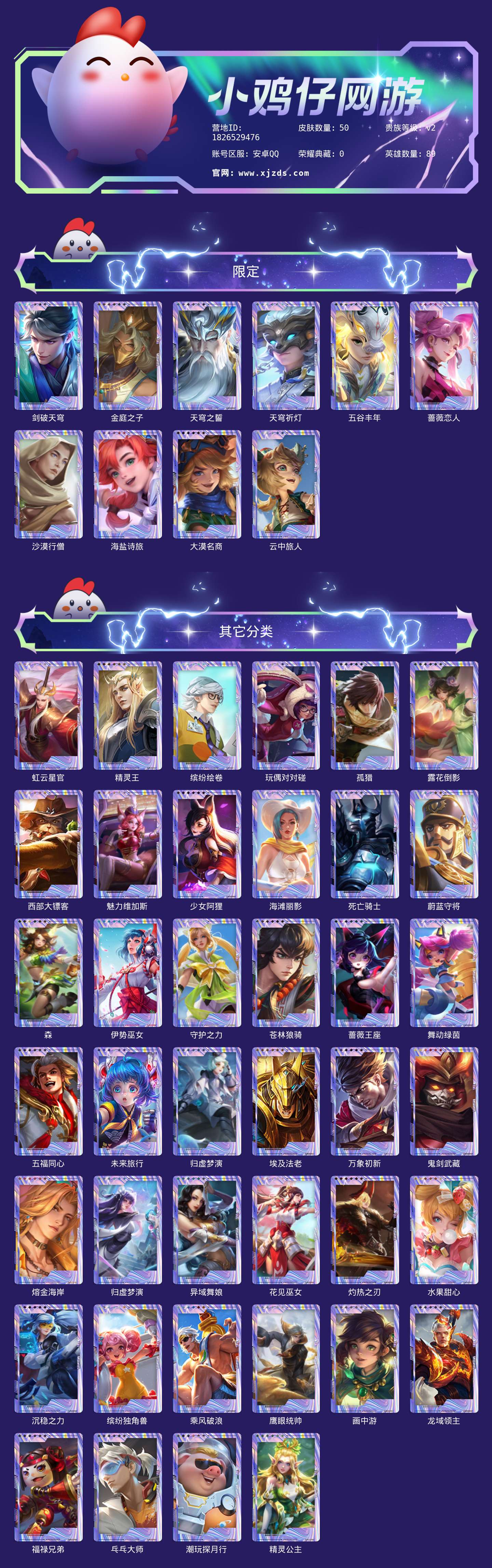 安卓Q-【可二次】-英雄数量:89-皮肤数量:50-贵族等级:贵族V2-蔷薇恋人-舞动绿茵-缤纷独角兽-五谷丰年-鹰眼护卫-水果甜心-鬼剑武藏-魅力维加斯-乘风破浪-沉稳之力-守护之力-乓乓大师-画中游-孤猎-未来旅行-灼热之刃-露花倒影-埃及法老-精灵王-西部大镖客孙悟空-精灵公主-异域舞娘-花见巫女-森-蔷薇王座-龙域领主-伊势巫女-福禄兄弟-潮玩探月行-海盐诗旅-云中旅人-蔚蓝守将-大漠名商-金庭之子-沙漠行僧-缤纷绘卷-归虚梦演西施-死亡骑士-虹云星官-五福同心-玩偶对对碰-万象初新-海滩丽影-归虚梦演孙膑-少女阿狸--营地号:1826529476